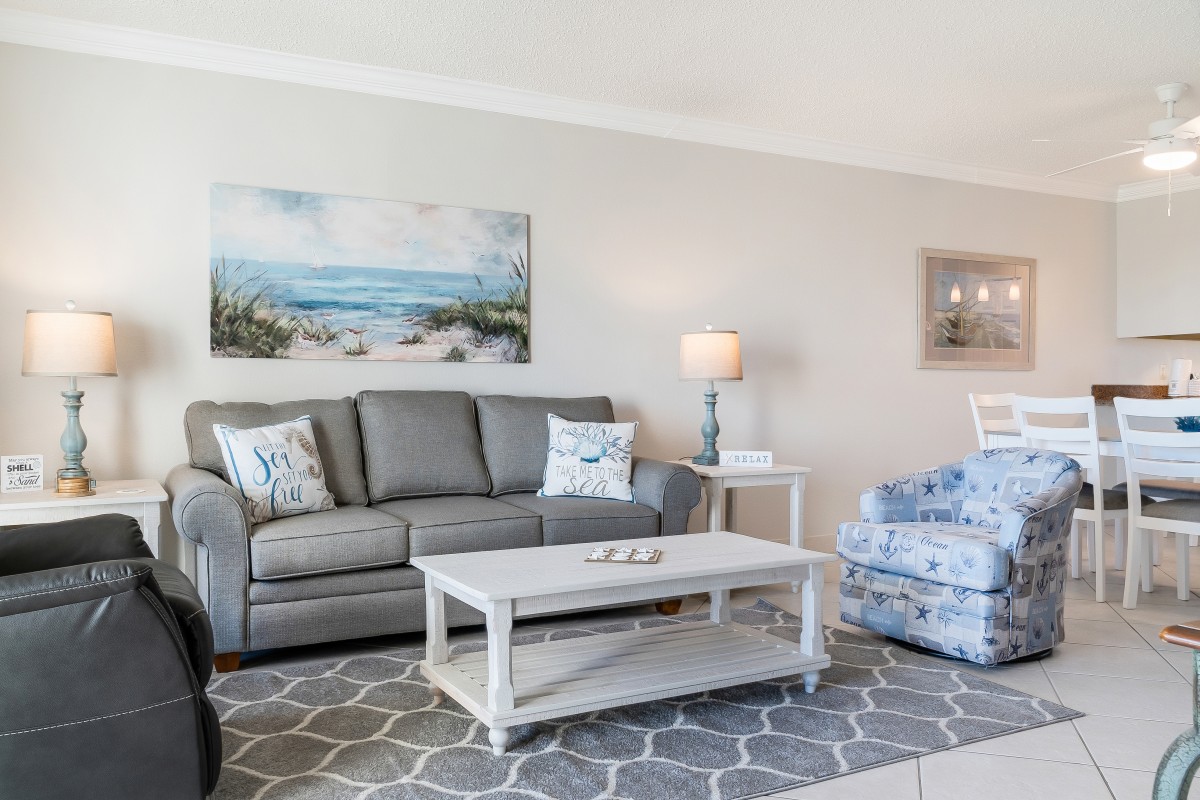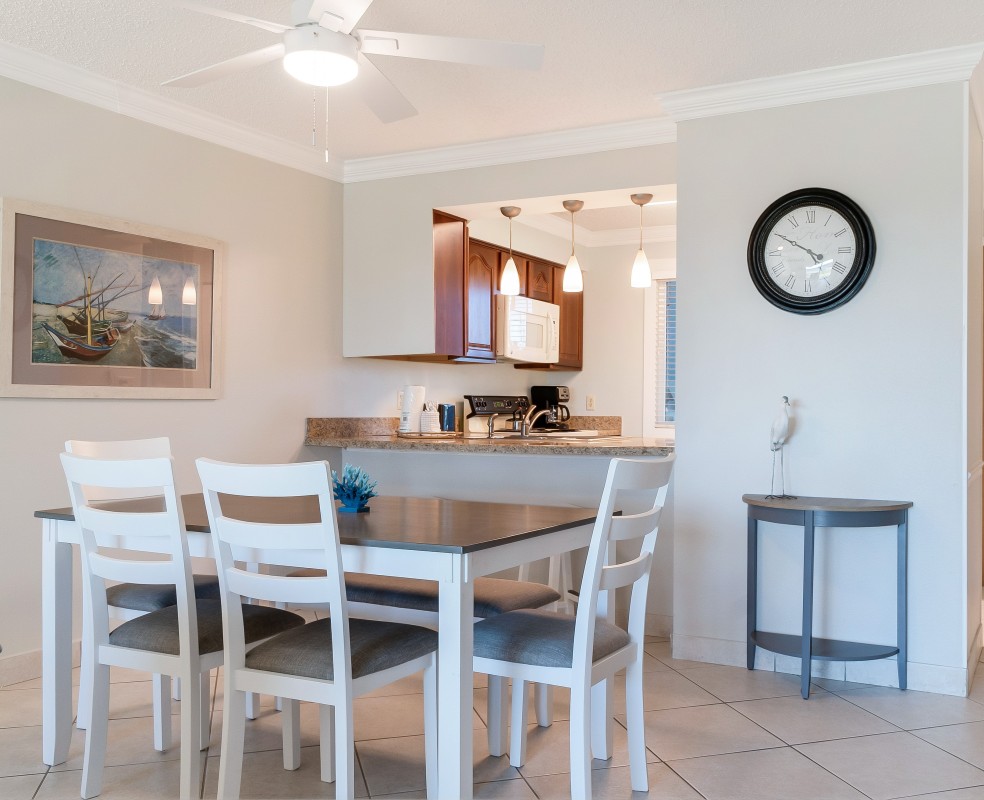Living Room: The living room is designed for relaxation with ample seating, including a queen sleeper sofa. Unwind here after a beach day, enjoying the 32” TV with cable and DVD/VHS combo. The open layout flows into the dining and kitchen areas, creating a cozy, inviting space for family and friends. Our vacation rental is a ground-floor unit provides easy patio the amenities at The Islander and private beach access!