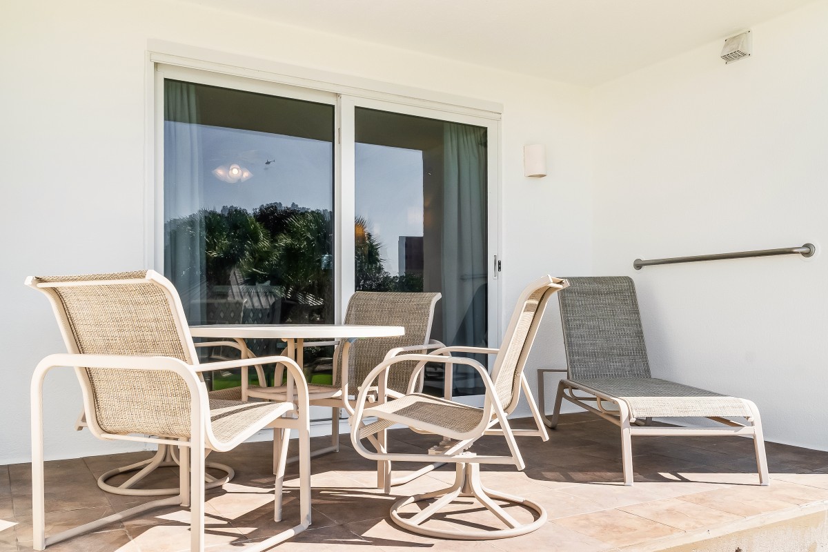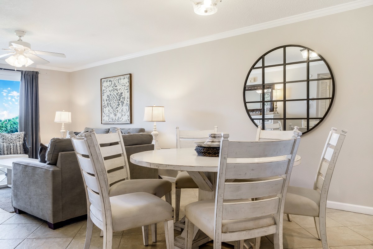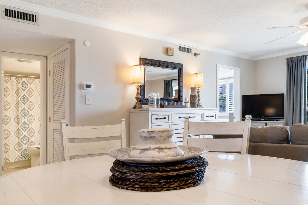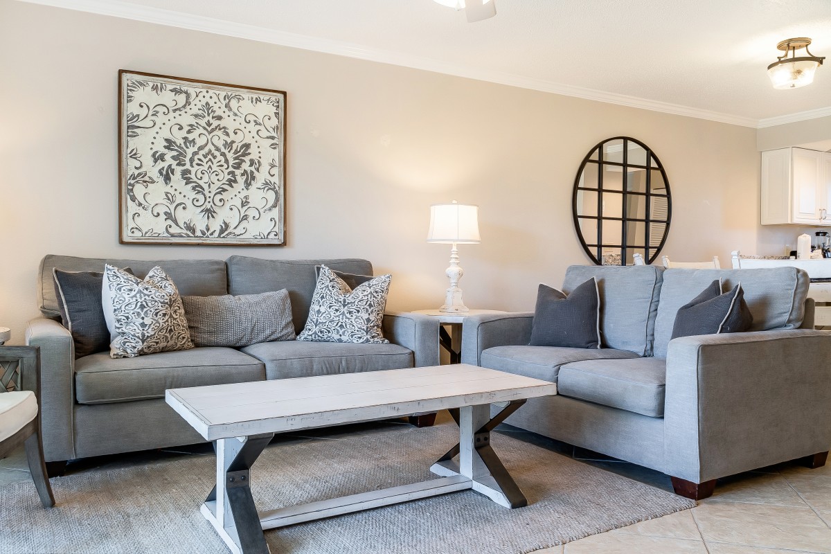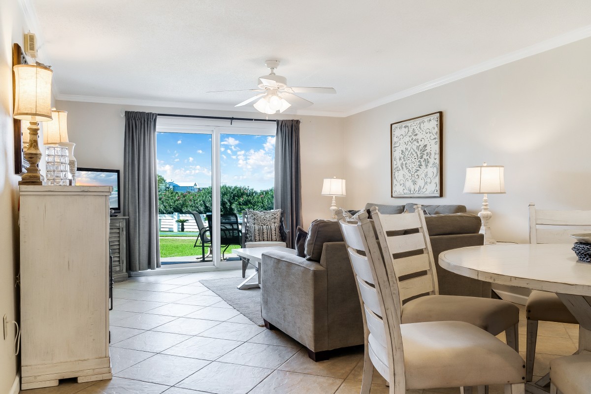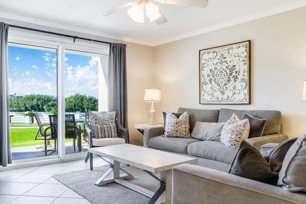 Living Room: Step into a comfortable, inviting living area and a queen sleeper sofa for extra guests. Enjoy cooling off in our vacation rental by watching your favorite shows on our large flat-screen (42’) Step outside on your private patio with your favorite drink, just steps from the pool and grilling area, the patio creates an ideal spot to relax and soak up the Destin sunshine, adding to the perfect beach vacation ambiance.