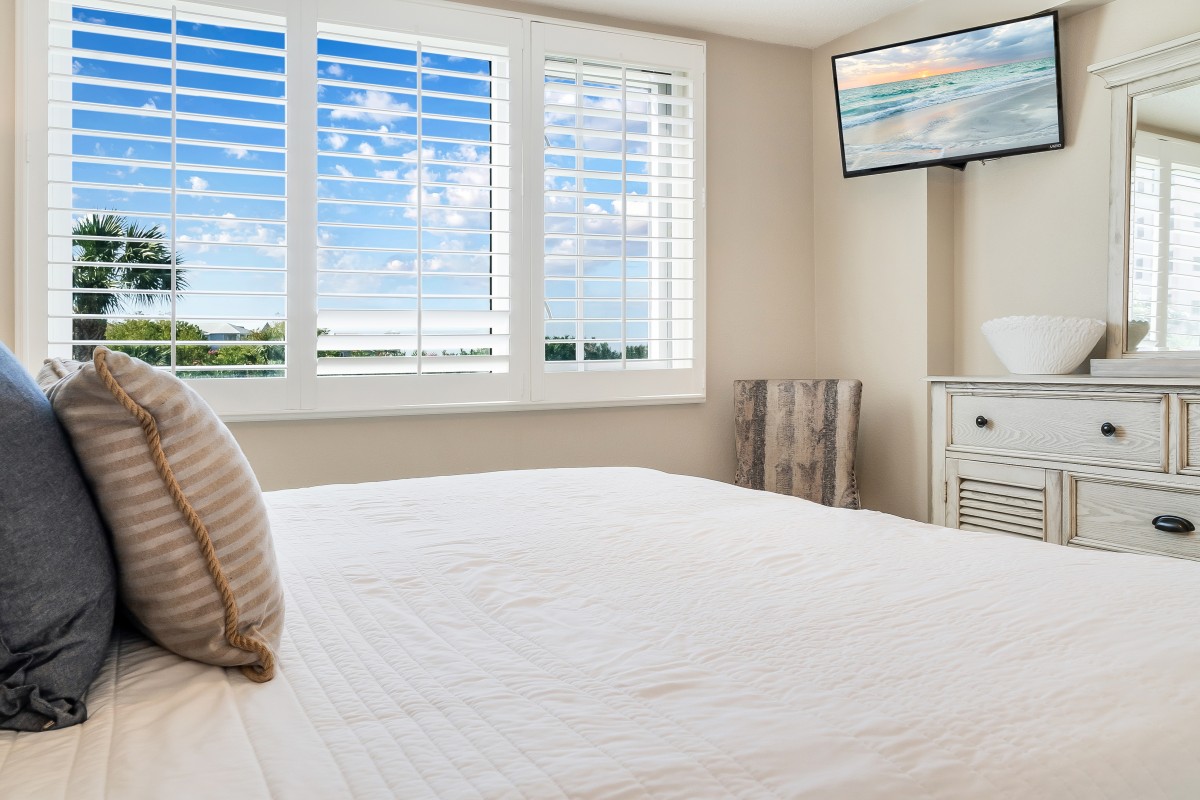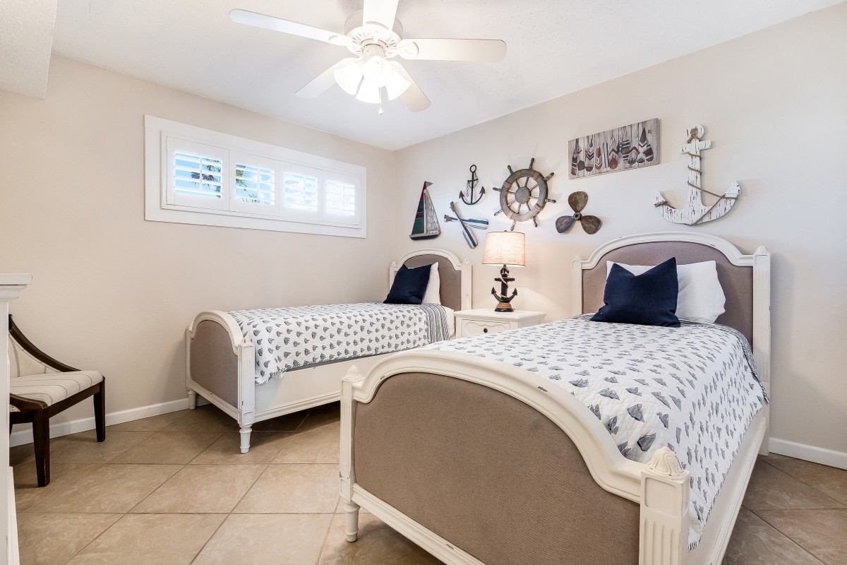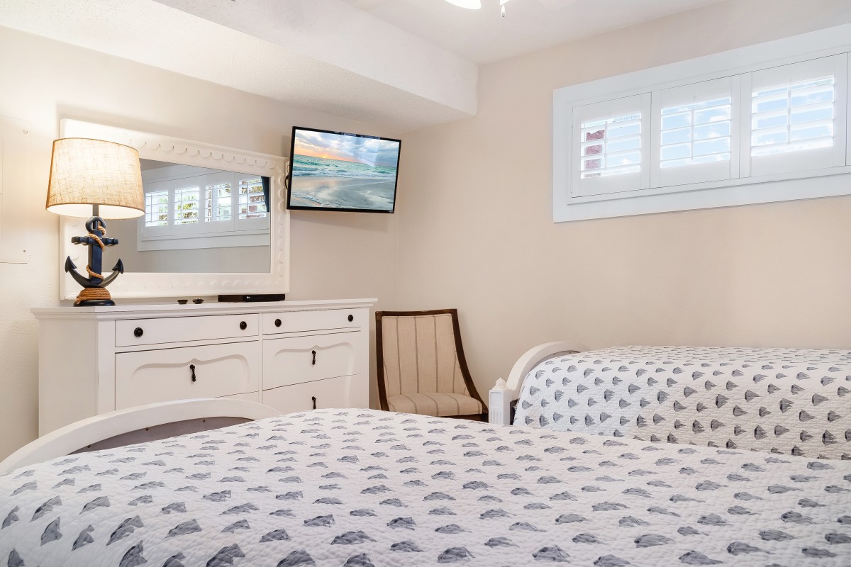 Bedrooms: The master bedroom features a king bed with fresh, modern bedding, a 24" TV, and an updated bathroom with double sinks, new countertops, and a walk-in shower. The guest bedroom includes two twin beds with stylish decor, a 24” TV with a DVD player, and an updated guest bathroom with a new vanity and countertops.