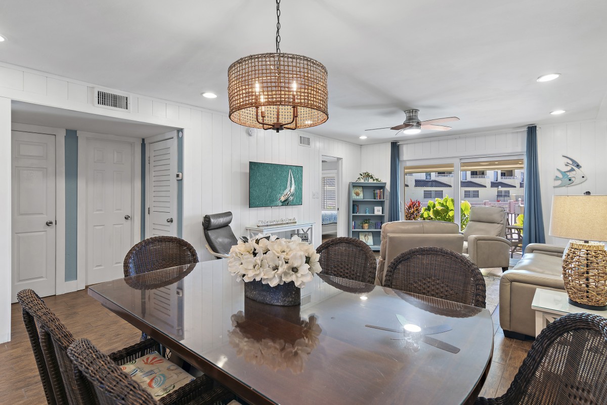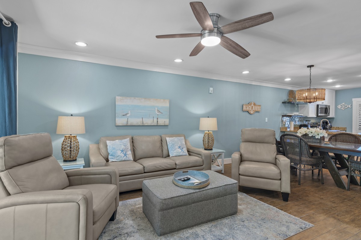 This beachy cottage, updated in 2024, boasts an open concept kitchen/living/dining room with wood look tile throughout and all the comforts of home. The kitchen has all new stainless-steel appliances, sink with pullout spray faucet and push button disposal, open shelving for easy access to dishes and a pantry to store your food supplies. Dining room table seats 6 comfortably and you can relax in the living room with a 55” Smart TV, leather recliners & queen size sleeper sofa.
