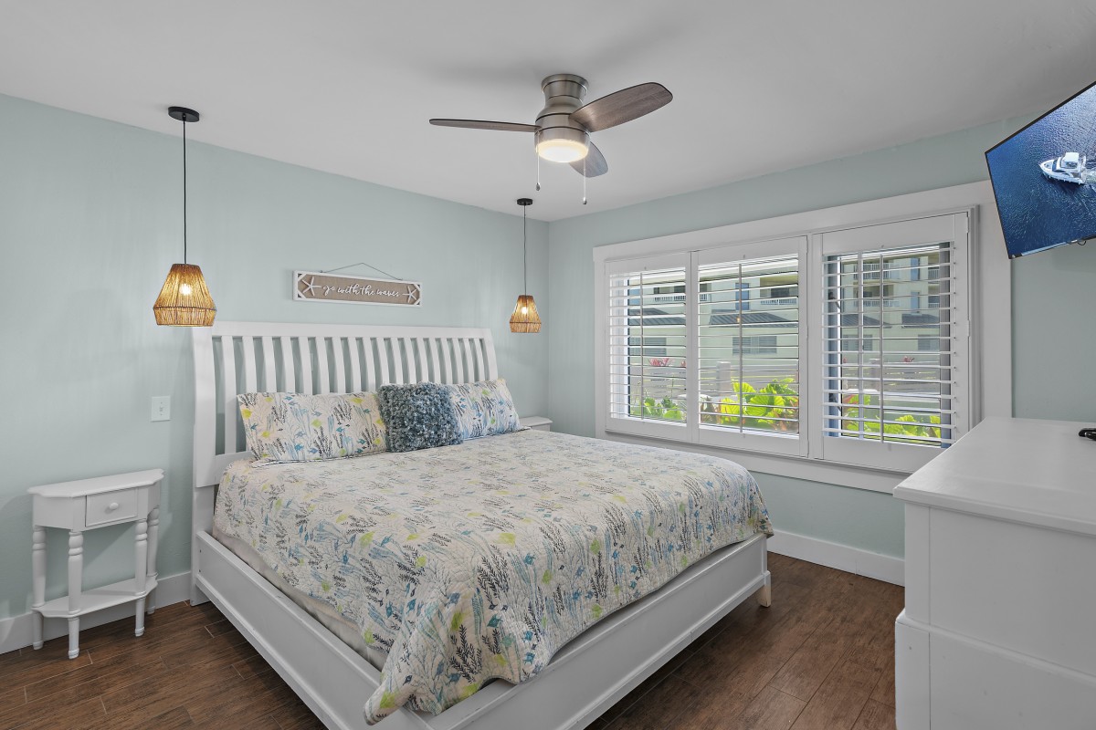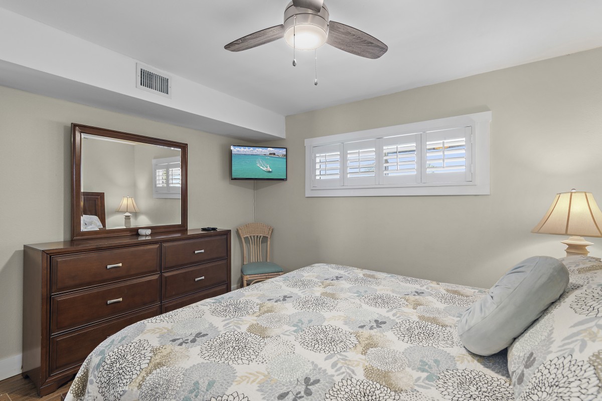 The primary bedroom has a king size bed, new ceiling fan and a 42” Smart TV. The primary bathroom has a double sink vanity with granite countertop and a walk-in shower. The guest bedroom has a king bed, new ceiling fan and a 32” TV. The guest bathroom has a single sink vanity with granite countertop and a tub/shower combo.