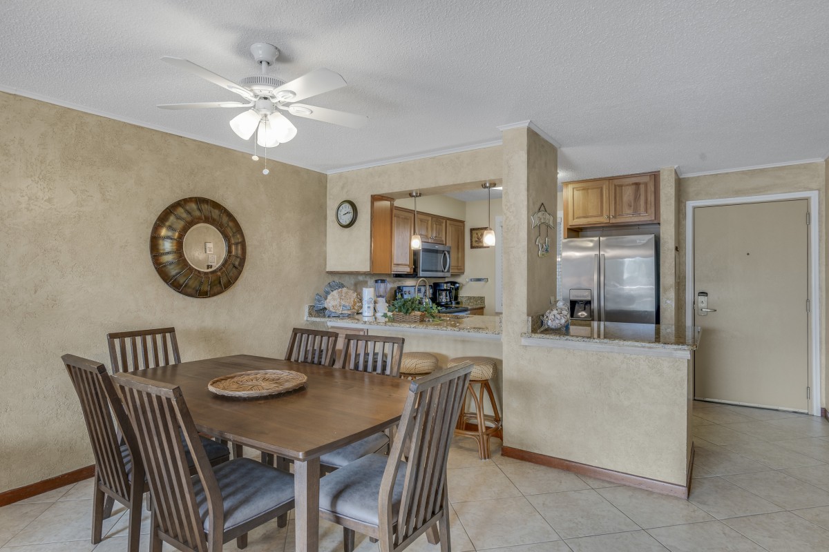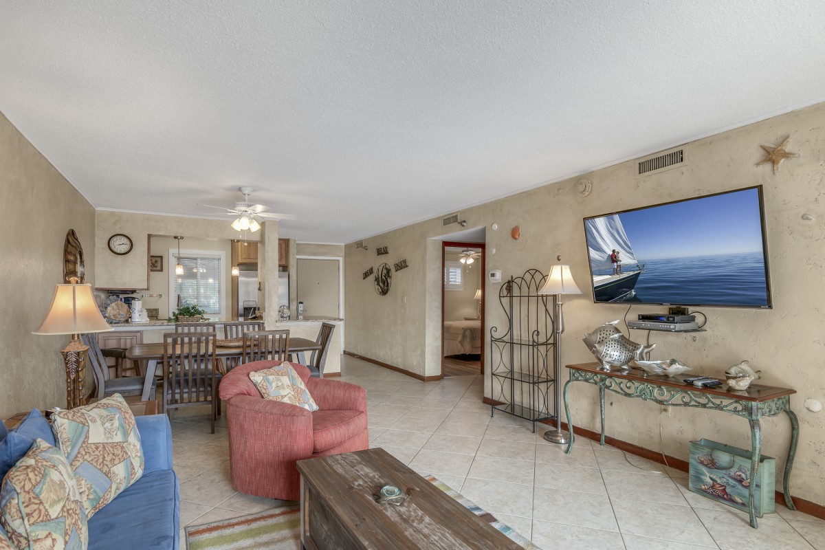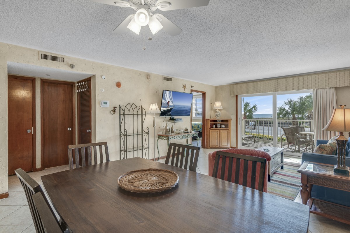 Unwind in the spacious living area featuring a queen sleeper sofa, updated furniture, and a 54” Roku TV with DVD player and cable access. Share meals at the dining table with seating for six or step onto the private balcony to enjoy stunning views of the East Pass, wildlife, and colorful sunsets. With convenient access to the pools and private beach, your Destin adventure is always within reach.