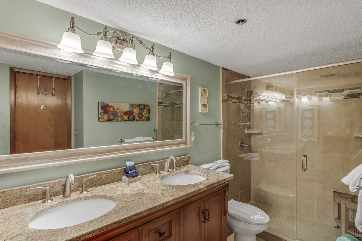 Relax in the master bedroom, complete with a king-size bed, new furniture, and a private bath featuring a double-sink vanity, granite countertops, and a walk-in shower.