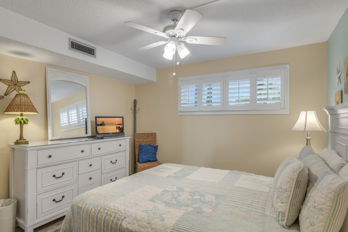 The guest bedroom offers a cozy retreat with a new queen bed set, an 18” TV, and access to the updated guest bathroom with a granite vanity.