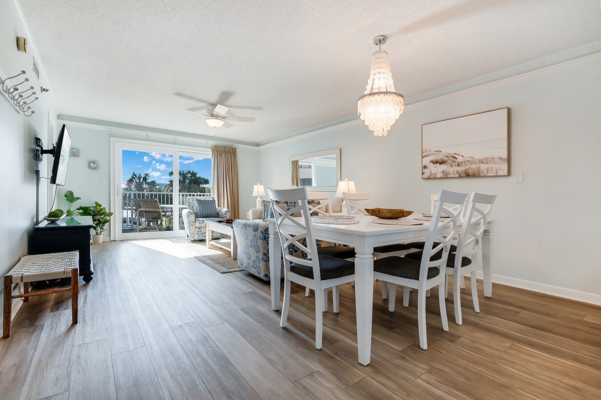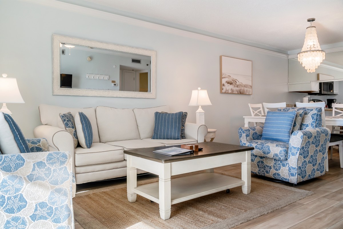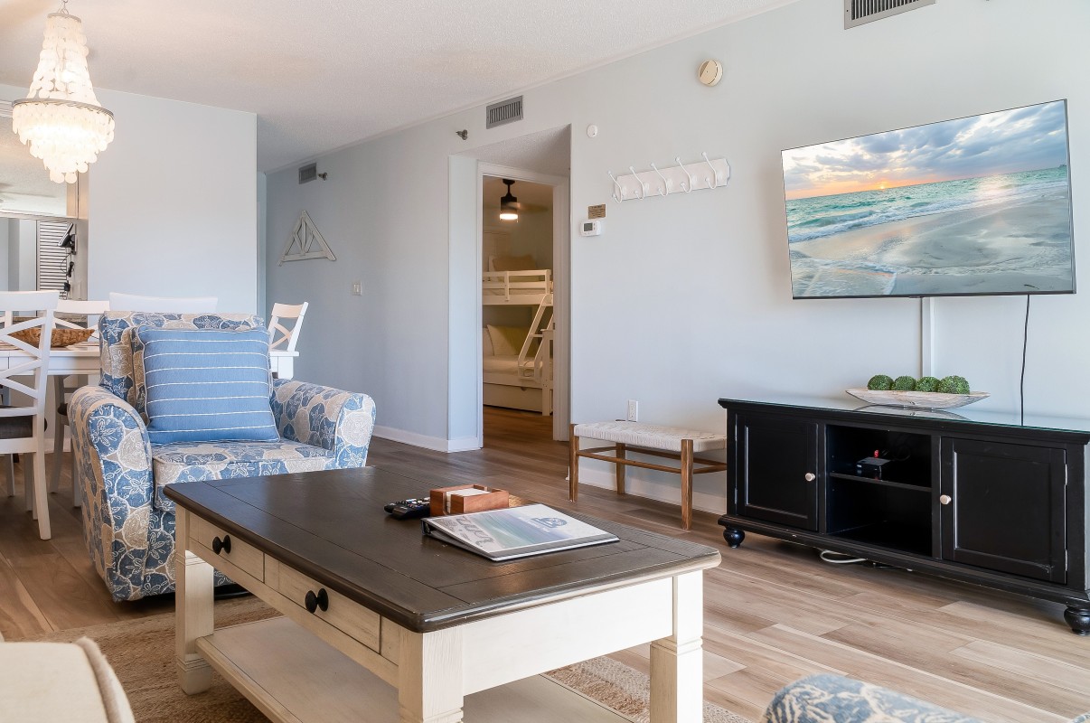 Living Room: The spacious living room provides a comfortable space to unwind after a day of fun in the sun. Equipped with a 54” Roku TV and a DVD player with digital cable access, it’s perfect for family movie nights. The cozy queen sleeper sofa offers additional sleeping space, while the open floor layout lets you enjoy quality time with family, whether lounging on the balcony or relaxing together in the living area.