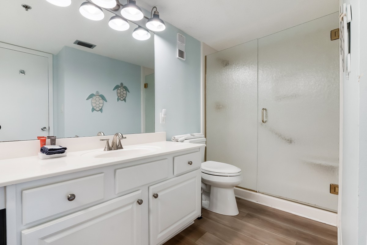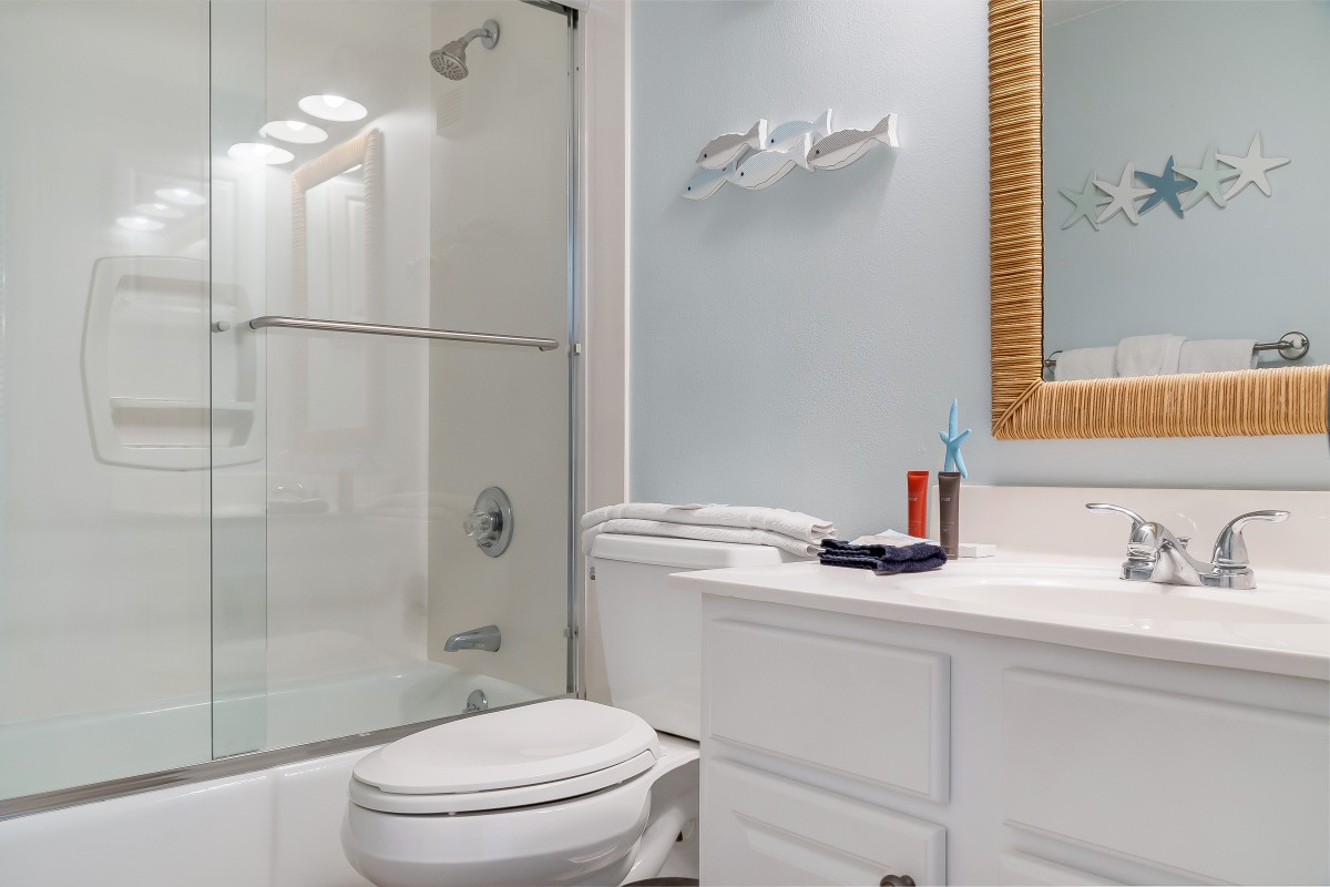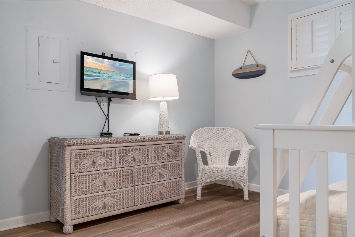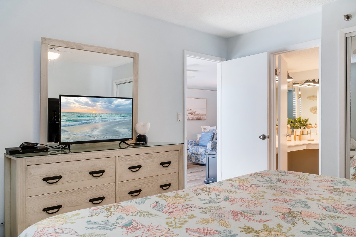 Living Room: The spacious living room provides a comfortable space to unwind after a day of fun in the sun. Equipped with a 54” Roku TV and a DVD player with digital cable access, it’s perfect for family movie nights. The cozy queen sleeper sofa offers additional sleeping space, while the open floor layout lets you enjoy quality time with family, whether lounging on the balcony or relaxing together in the living area.