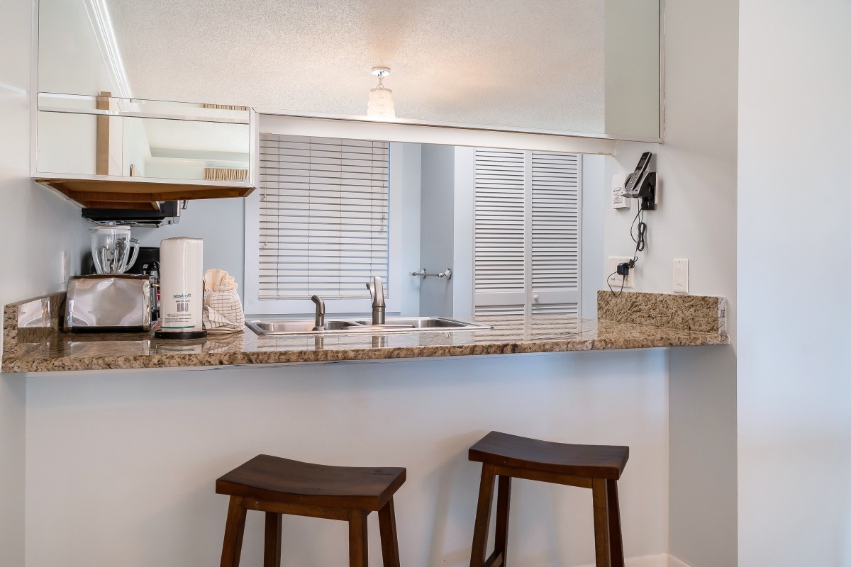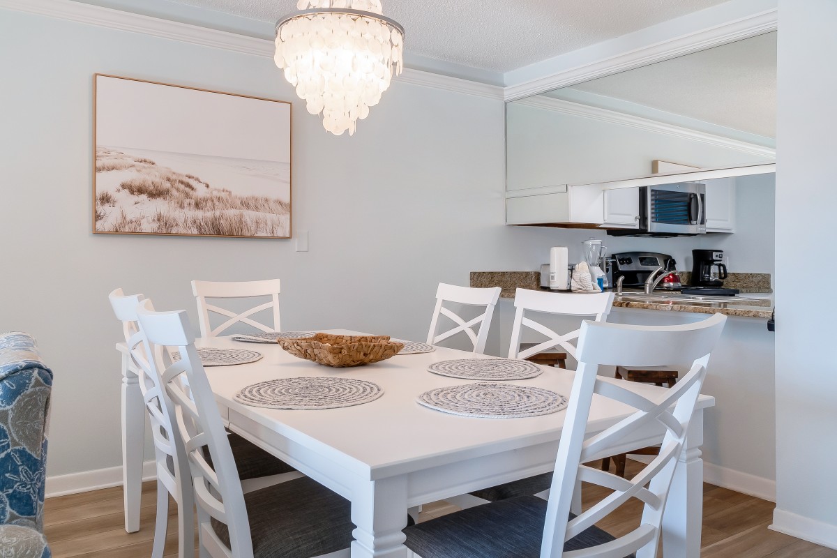 Kitchen: Our rental offers a fully equipped kitchen and features updated cabinets, granite countertops, stainless-steel appliances, a dining room table that seats 6. Includes a side-by-side refrigerator with an icemaker and water dispenser—and a Keurig. It comes with all the essentials you need to prepare delicious meals during your vacation stay in Destin, Florida.