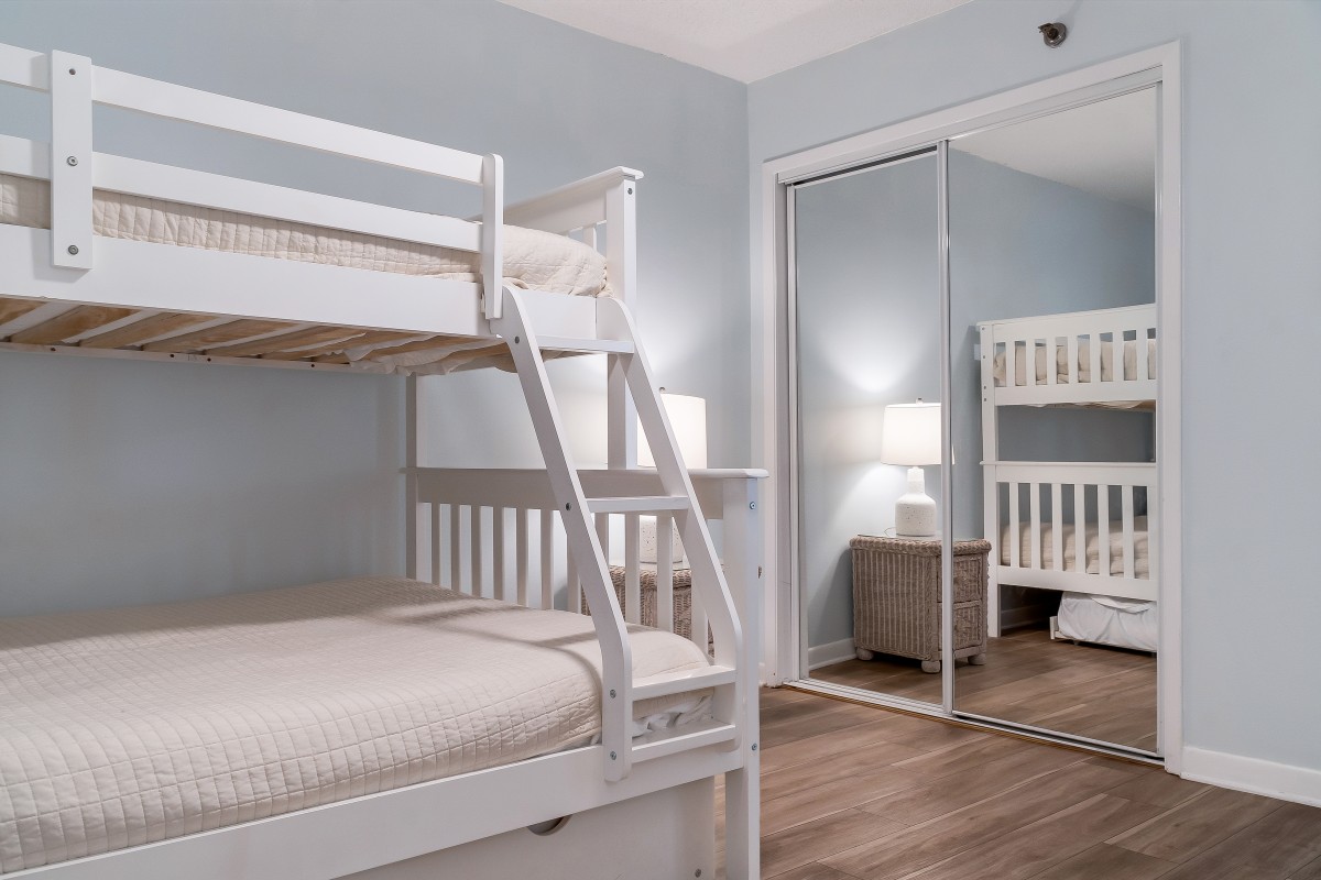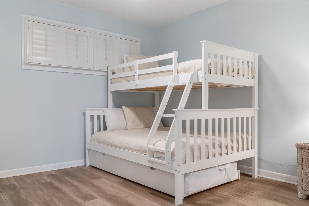 Bedrooms: The master bedroom is a relaxing retreat, with new furniture with a king-size bed, a 28” TV, and a DVD player; the bathroom includes a new updated vanity with double sinks and granite countertops, as well as a walk-in shower. The guest bedroom features a Twin over full-size bunk bed with trundle, and an 18” TV, making it a fun spot to relax at night!