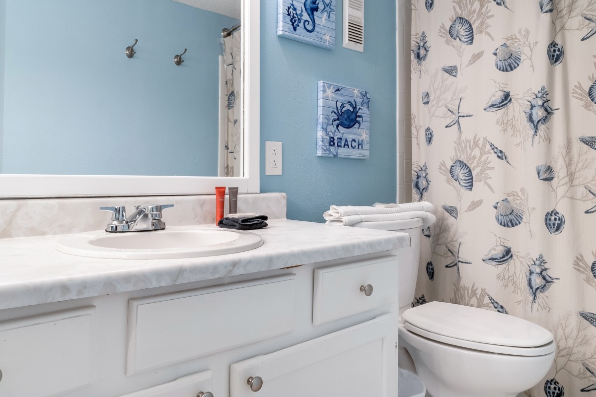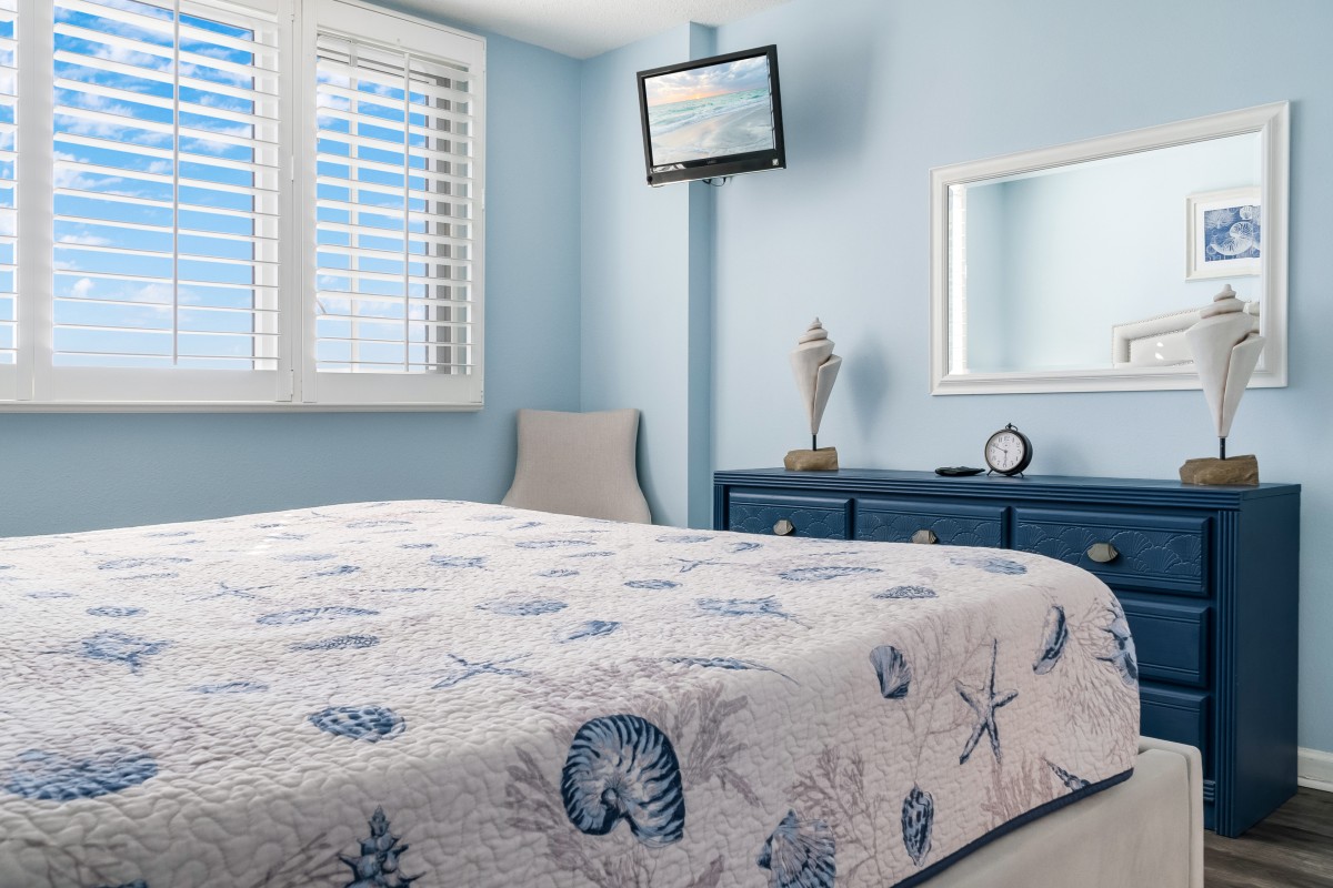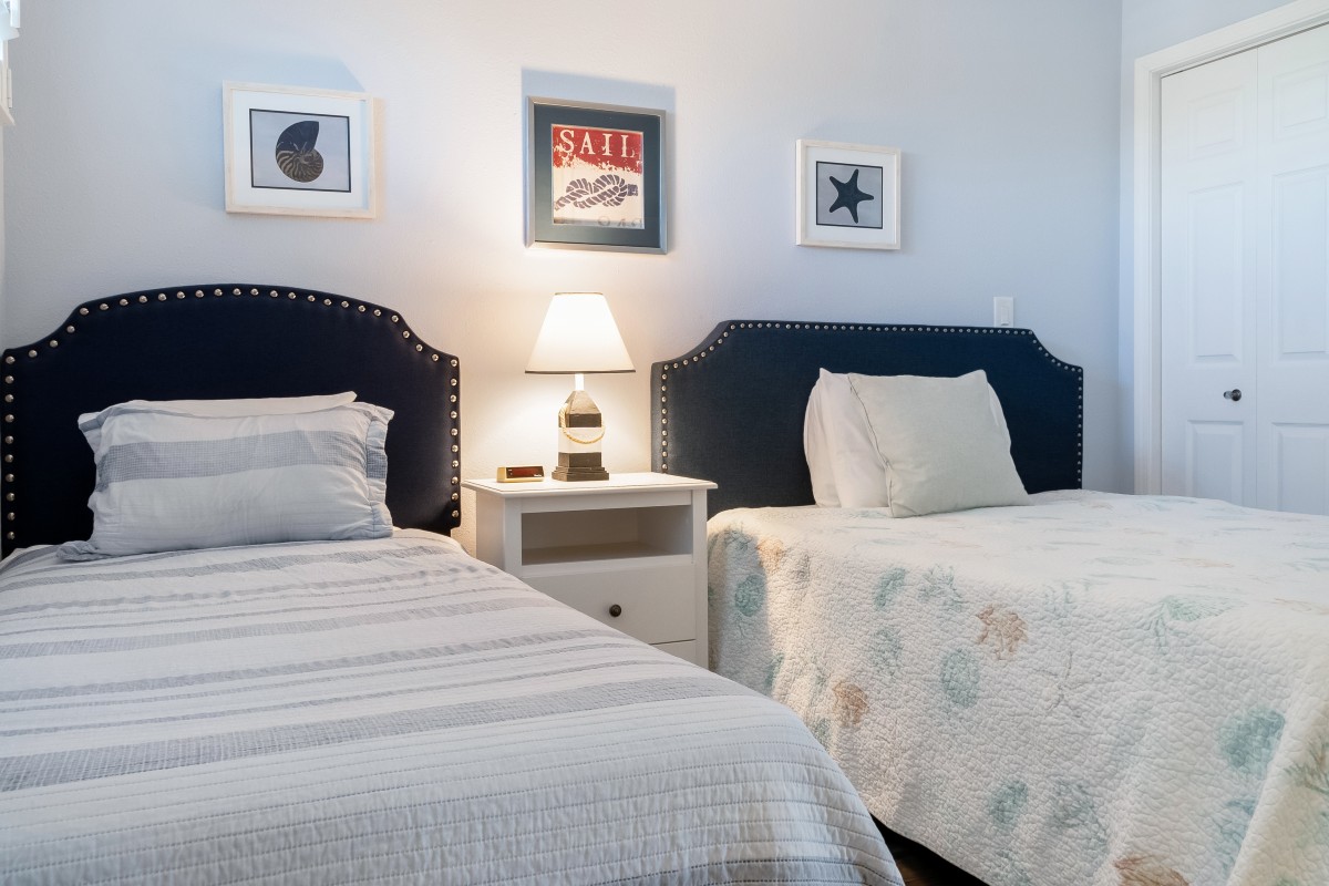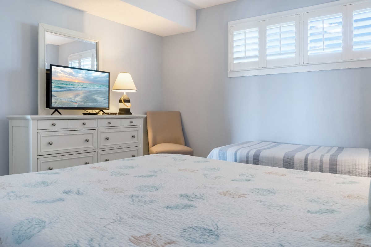 Bedrooms: The master bedroom offers a restful retreat with a new king-size bed, plantation shutters, tub/shower combo, and a 22” TV with a DVD player. The nautical-themed guest bedroom is designed for extra comfort, featuring both a twin-sized bed and a queen-sized bed, an accent chair, and a 22” TV with a DVD player, and convenient access to bathrooms, with tub/shower combos.