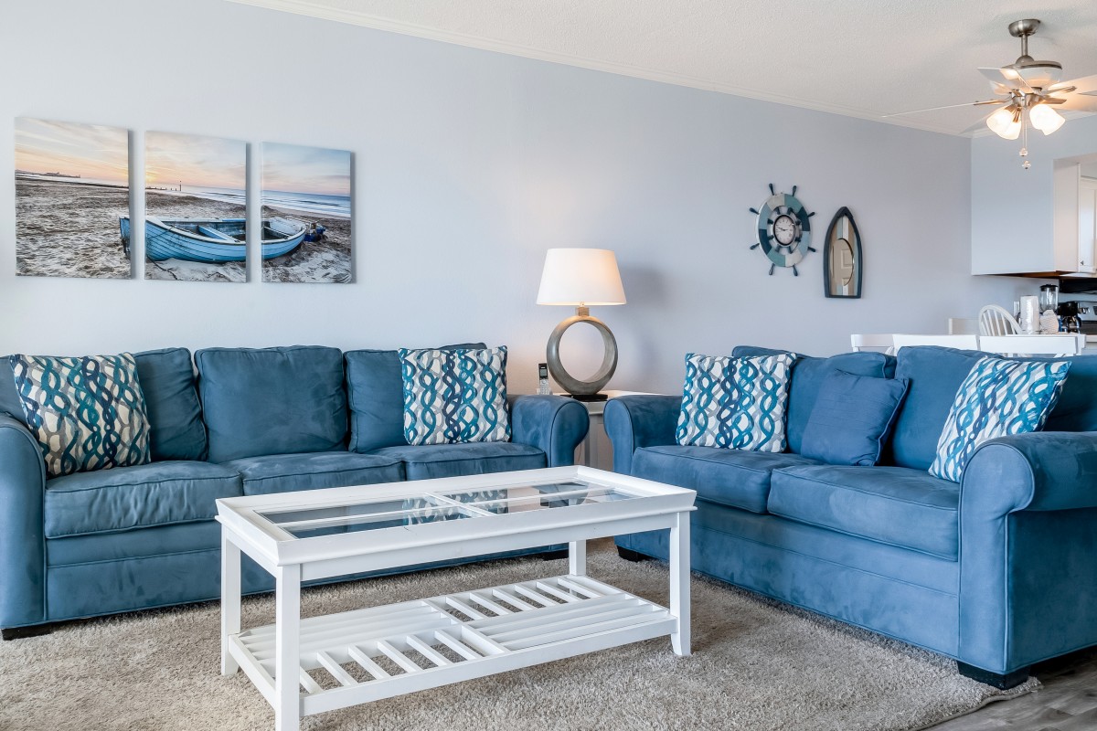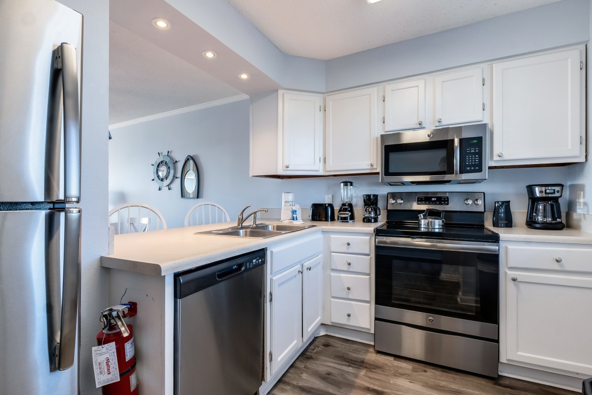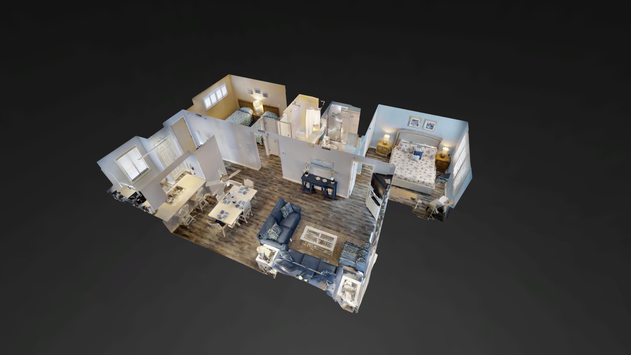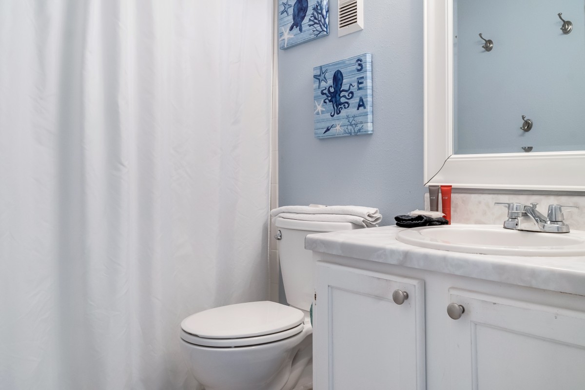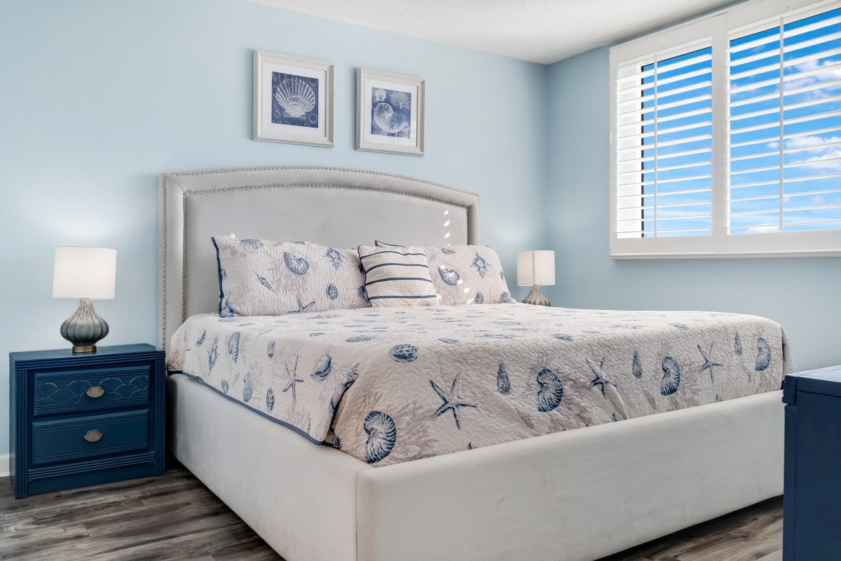 Bedrooms: The master bedroom offers a restful retreat with a new king-size bed, plantation shutters, tub/shower combo, and a 22” TV with a DVD player. The nautical-themed guest bedroom is designed for extra comfort, featuring both a twin-sized bed and a queen-sized bed, an accent chair, and a 22” TV with a DVD player, and convenient access to bathrooms, with tub/shower combos.