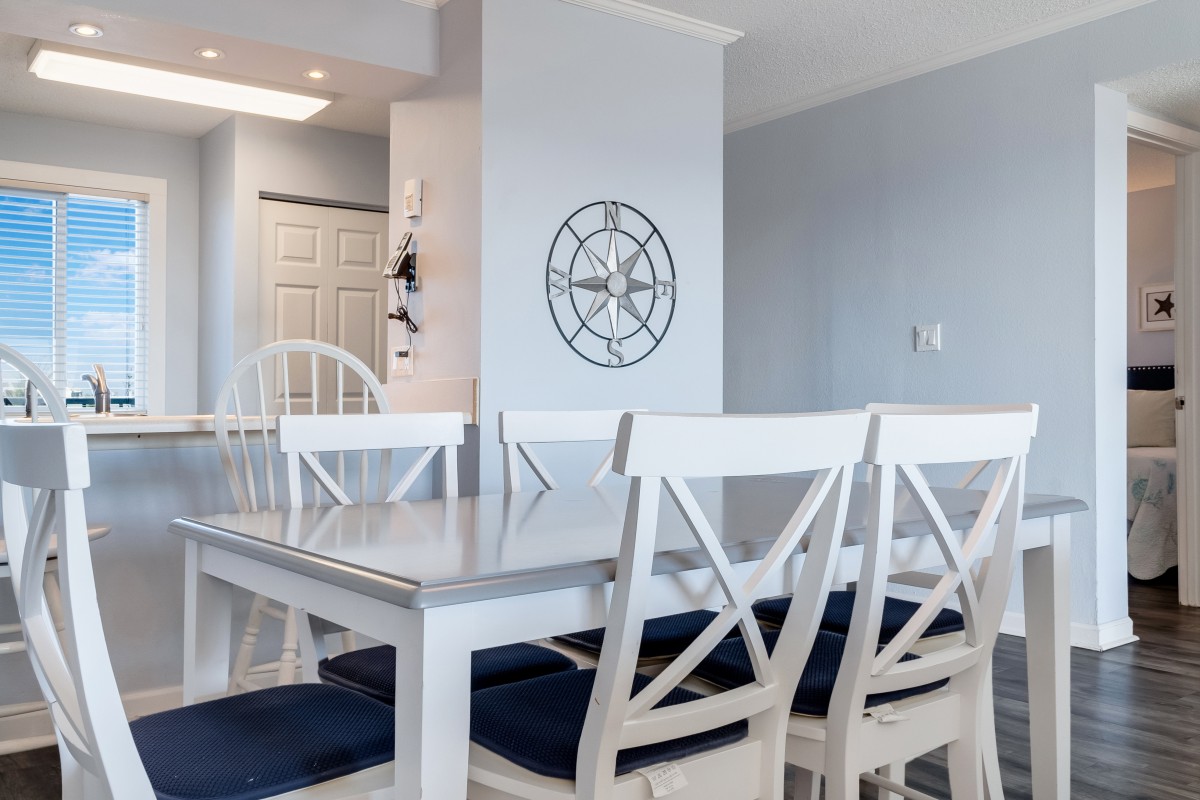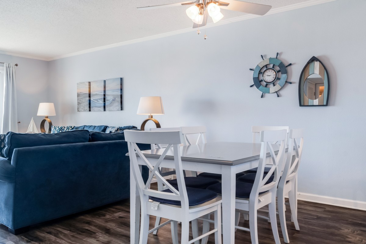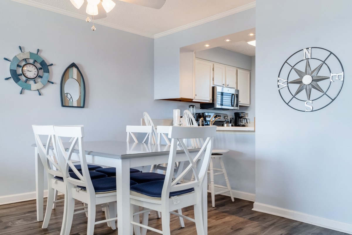 Living Room: Relax in the inviting living area, which includes a queen sleeper sofa, a 32” TV with a DVD player, and digital cable access. Gather around the new dining room table, comfortably seating 6—ideal for family meals or game nights. Enjoy evening on the private balcony with your favorite drink,