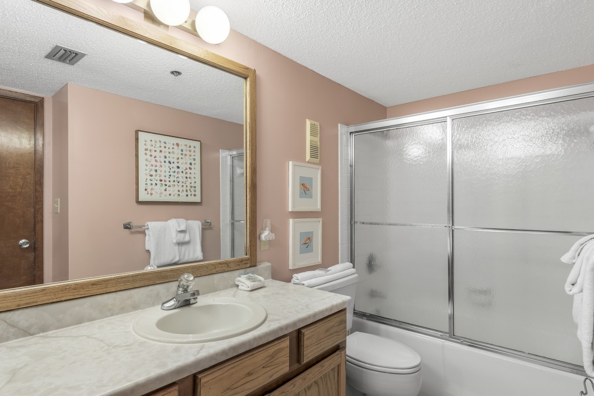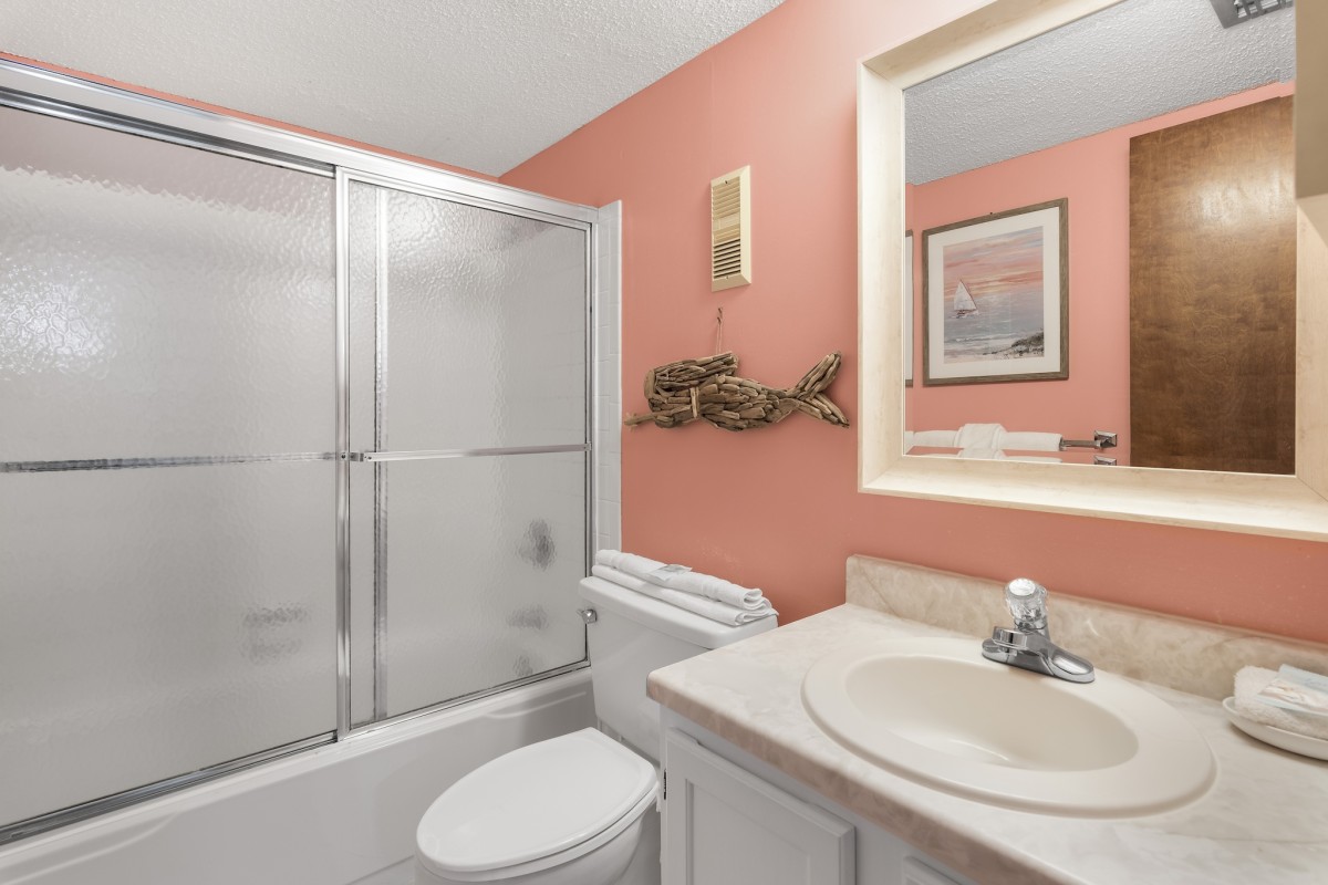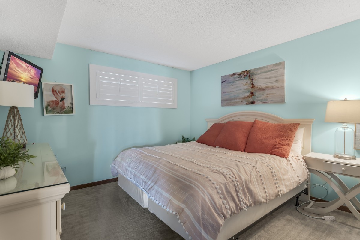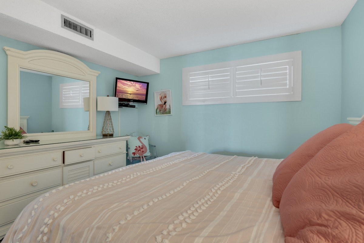 The master bedroom boasts a new king size bed, plantation shutters, and a 24” TV and DVD player. The bathroom has a tub/ shower combo. The guest bedroom has been updated with a king bed with an accent chair, and a 24” TV with a DVD player. The guest bathroom has a tub/ shower combo.