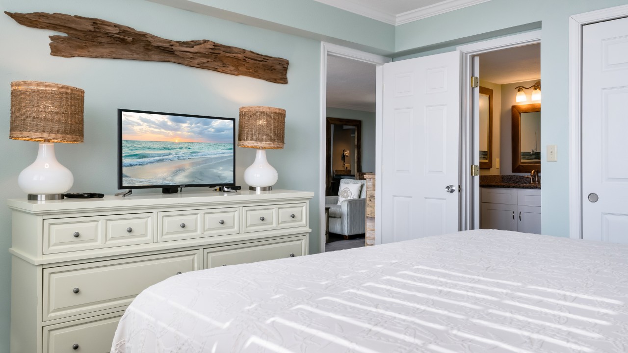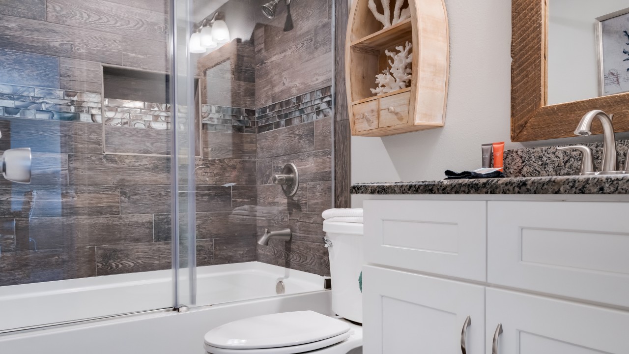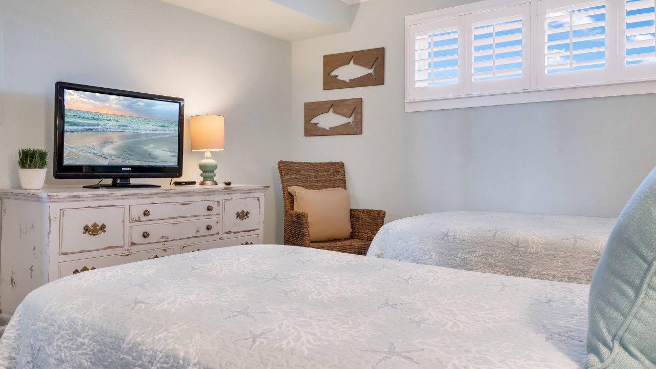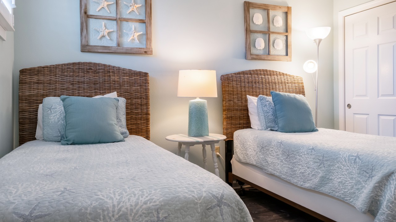Bedrooms: The master suite boasts a king-size bed and a new 19” LCD HD television for your viewing pleasure and private rustic beach walk in shower, new tile, and twin sinks. The guest room is furnished with twin beds and a 22” flat-screen LCD HD TV. The master bathroom features a rustic beach walk-in shower, new tile, and twin sinks for added convenience of our guests. Our guest bathroom complements the master bathroom with rustic beach panels and all-new tile, creating a beautifully designed rental for our guests to have a wonderful vacation experience while in Destin, Florida.