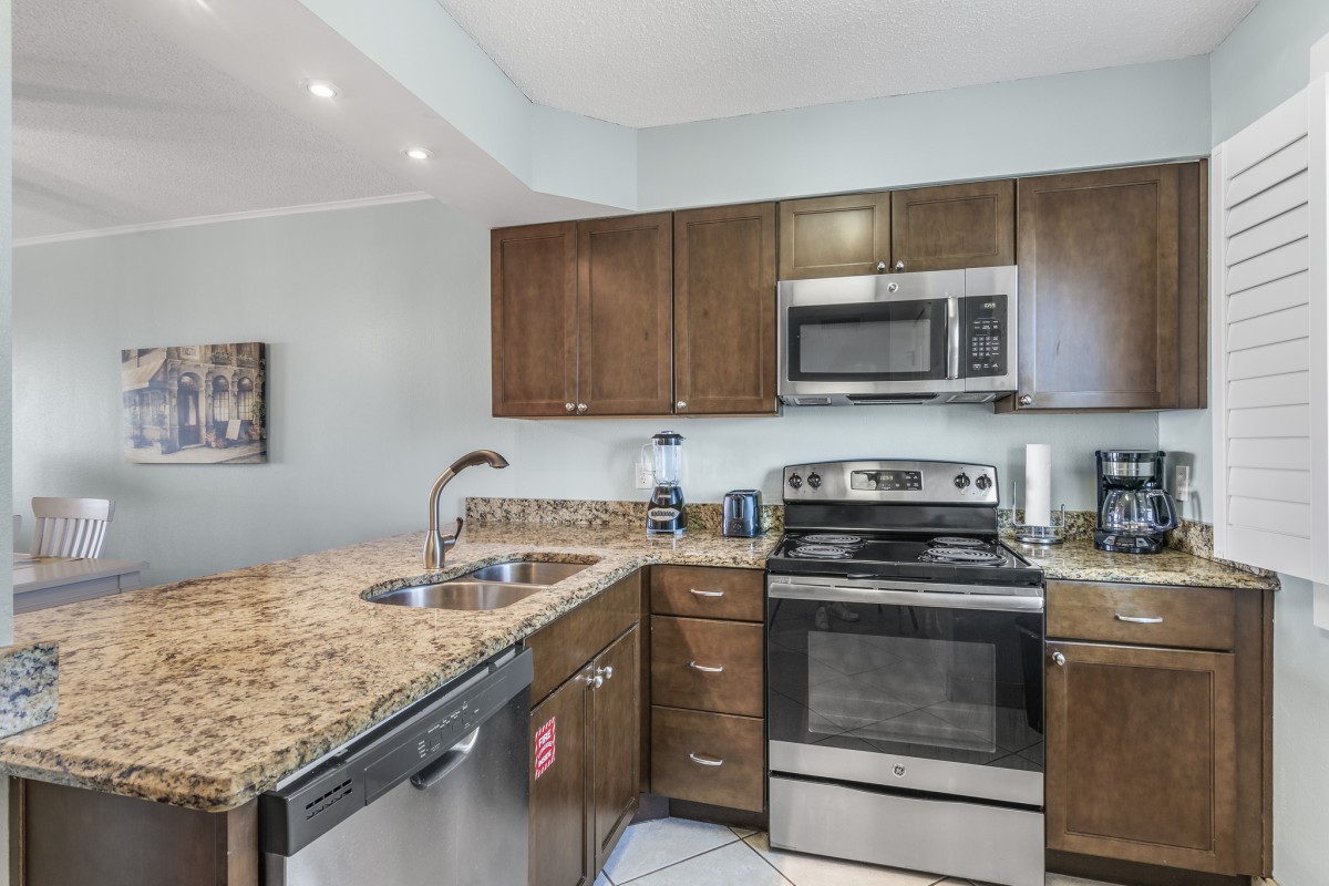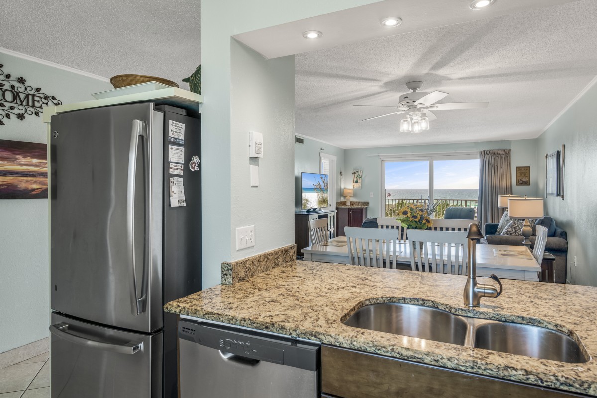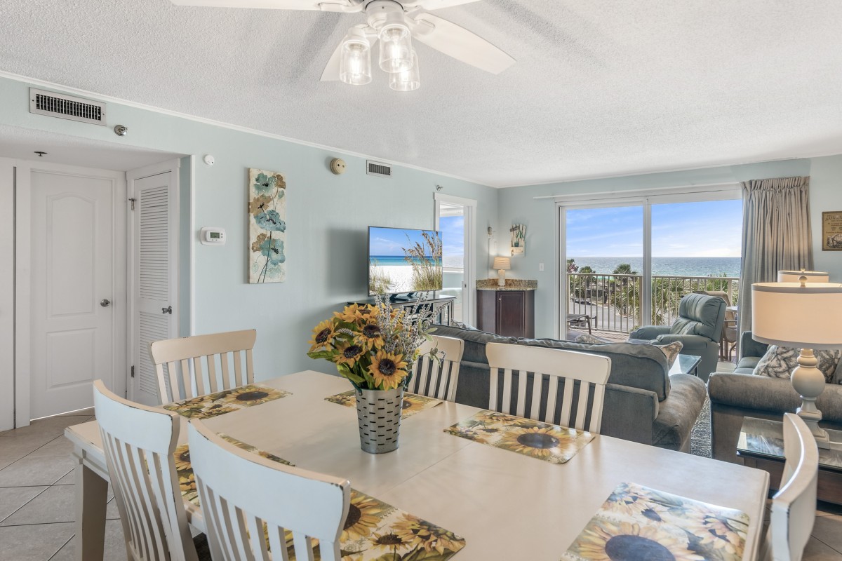 Kitchen and Dining Area: Beautifully designed kitchen with custom cabinets, granite countertops, and new stainless-steel appliances. Cabinets over the kitchen sink have been removed so you can enjoy the view and conversation with family and friends in the dining and living area while cooking. Enjoy moments gathering around the dining table to enjoy meals together, creating lasting memories during your vacation in Destin, Florida.