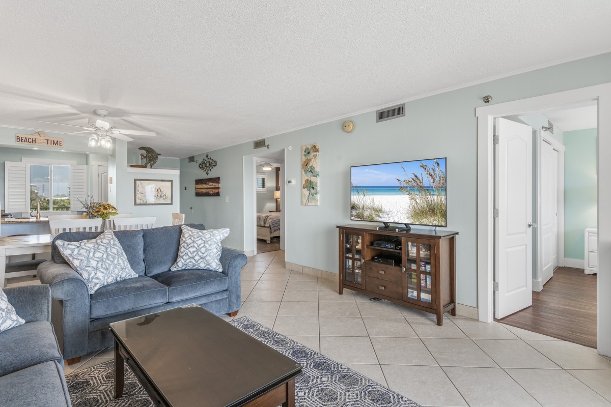 Living Area: Escape the heat and unwind in the cozy living area, which includes new solid wood interior doors and stylish furnishings. Our living room is equipped with a queen sleeper sofa for additional sleeping arrangements. Enjoy relaxing as you get caught up on your favorite TV shows on our 55” smart TV with a Blu-ray player. The flooring throughout the condo adds to the modern and inviting atmosphere. Get ready to soak up the sun and stunning Gulf views from your very own private balcony!