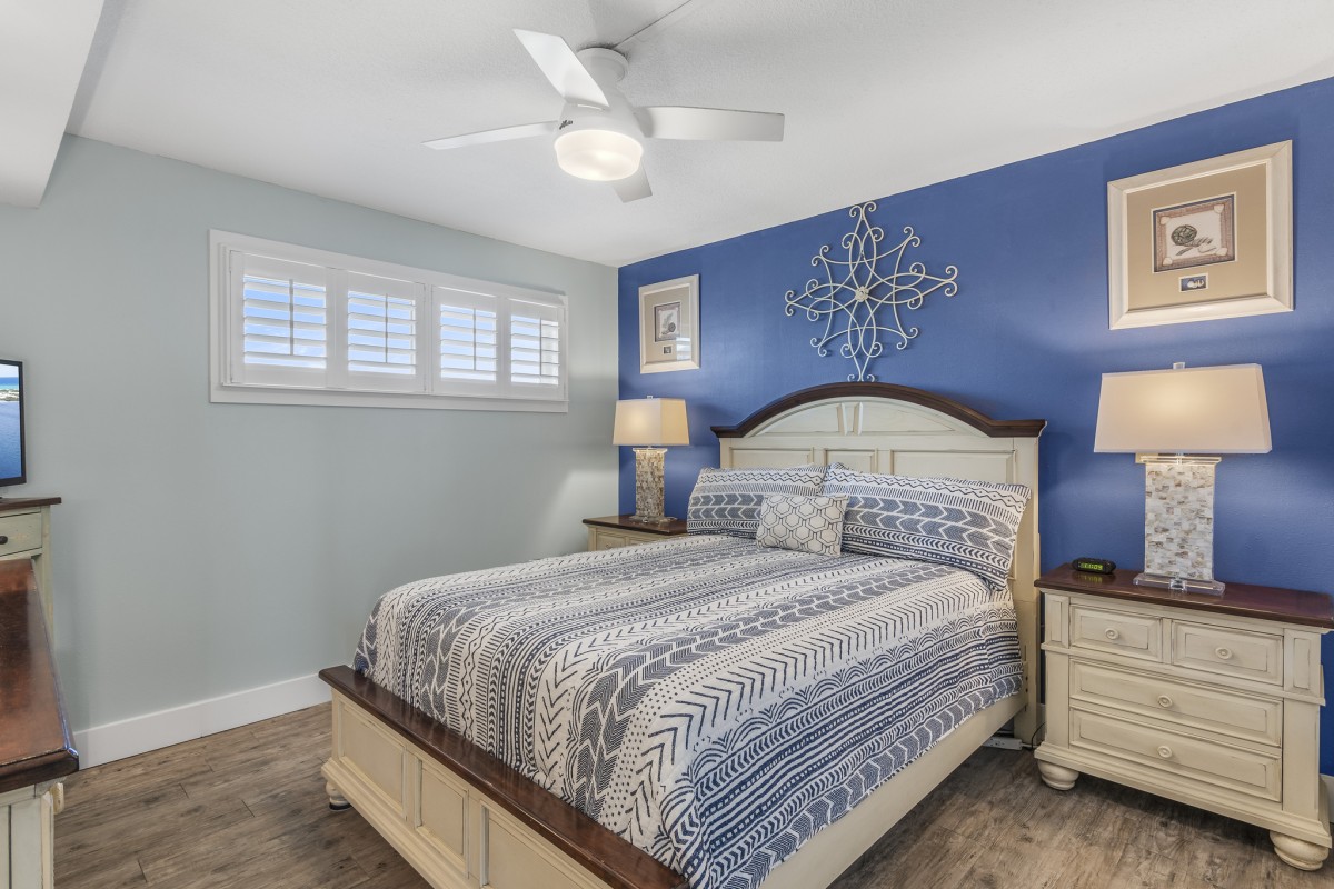 Bedrooms: The master bedroom offers a king bed with a brand-new mattress, a ceiling fan, and a 40” TV with a Blu-ray player. The master bedrooms offer a private bathroom with a tile walk-in shower with a bench and light, a washer/dryer, and a 3-drawer linen cabinet. The guest bedroom is well-appointed with a queen bed, ceiling fan, and a 32” TV with a Blu-ray player, providing a comfortable space for family or friends.