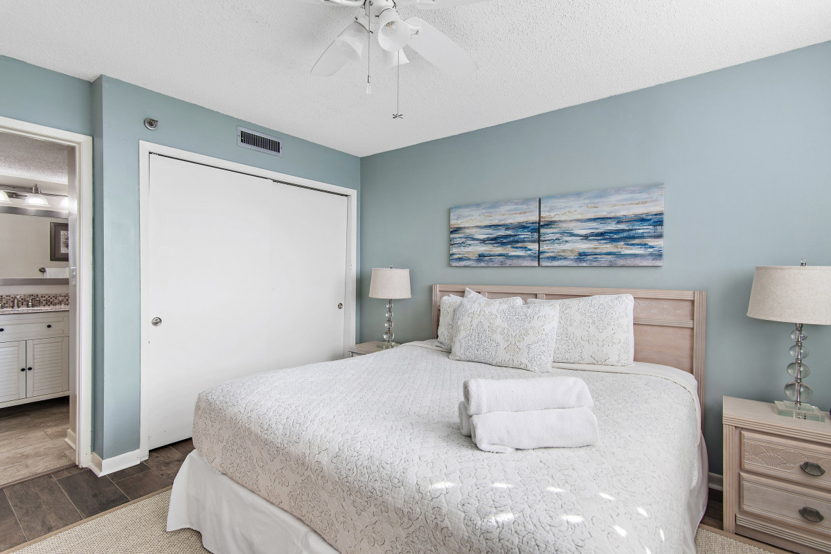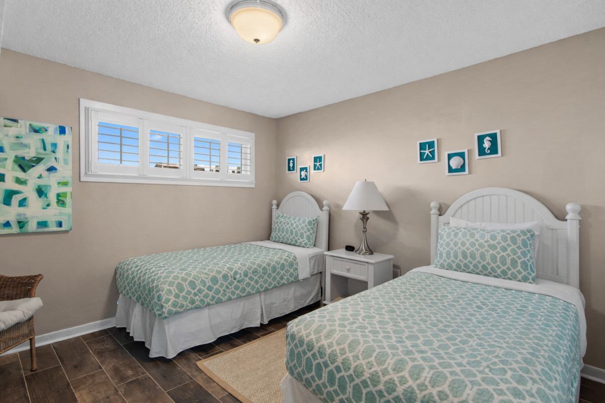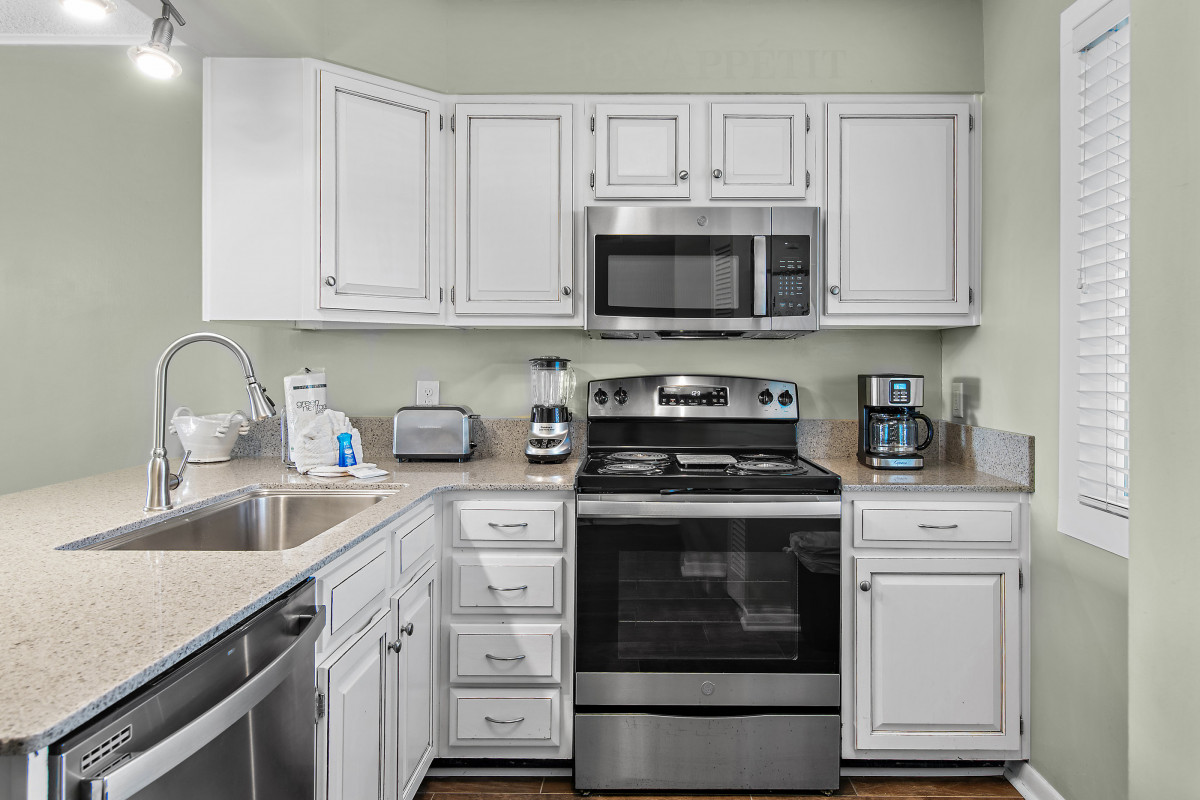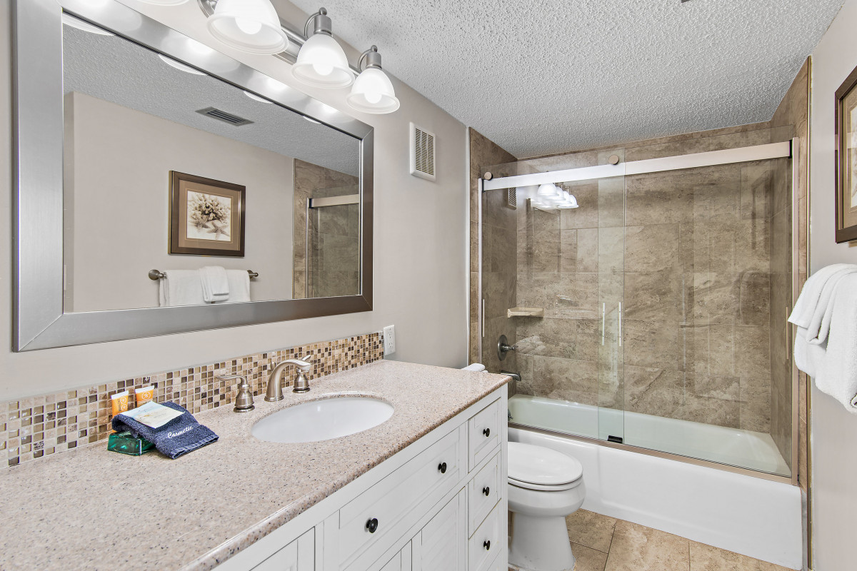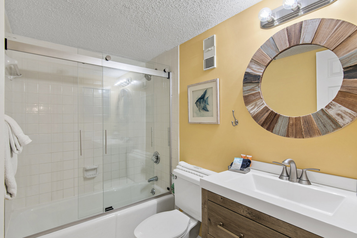 The master bedroom features a luxurious king-size bed, for a restful night’s sleep. A smart TV with DVD Player and cable access are available to help complete the evening. The guest bedroom is equipped with two twin-sized beds, perfect for kids or friends, along with a flatscreen TV, smart DVD player and cable access for those late-night movie marathons. The bathroom includes a new vanity with granite countertops and a convenient tub/shower combo featuring updated glass doors.