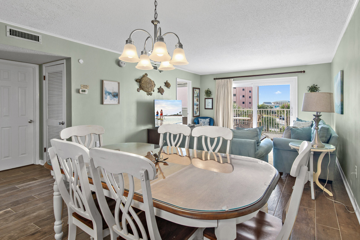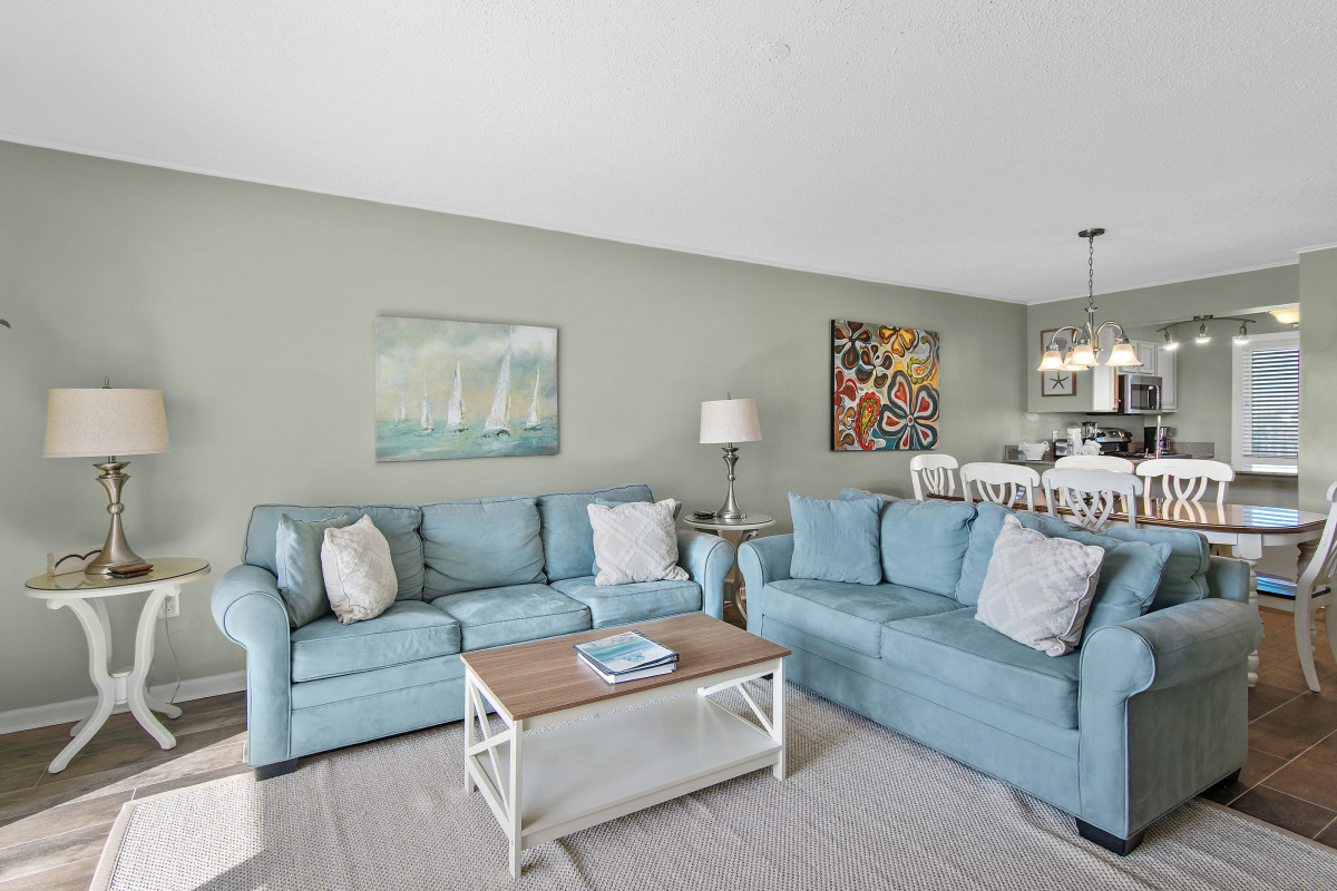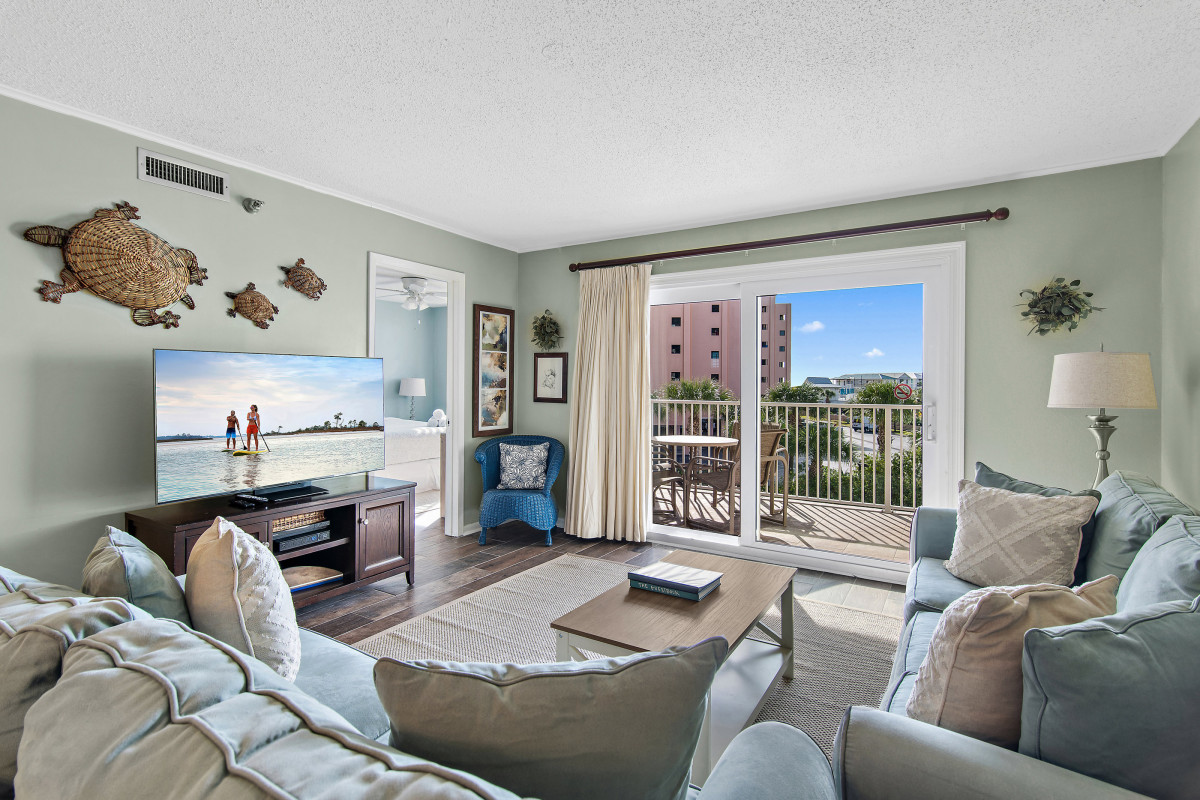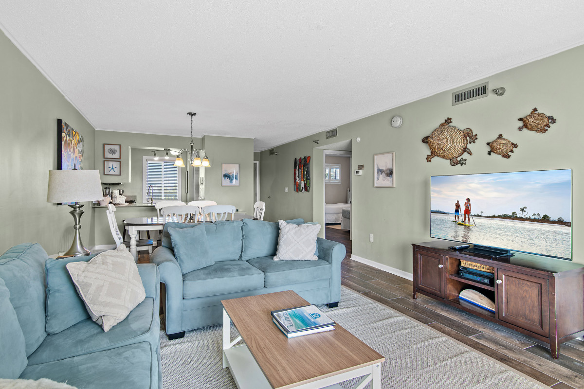 Brand new tile floors throughout all the living spaces and bedrooms. Unwind in the cozy living area, furnished with updated pieces designed for comfort and relaxation. The smart TV provides entertainment options for everyone. Stream your favorite shows, watch cable, or find a movie for the DVD player. The inviting decor creates a welcoming ambiance, making it an ideal space for family gatherings or relaxing evenings after a day spent exploring Destin. A queen sleeper sofa offers additional space for your family. Sit on the private balcony, where you can enjoy beautiful views while sipping your morning coffee or having a glass of wine and watching the sunset.