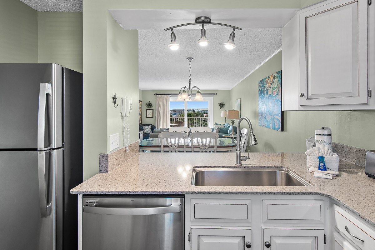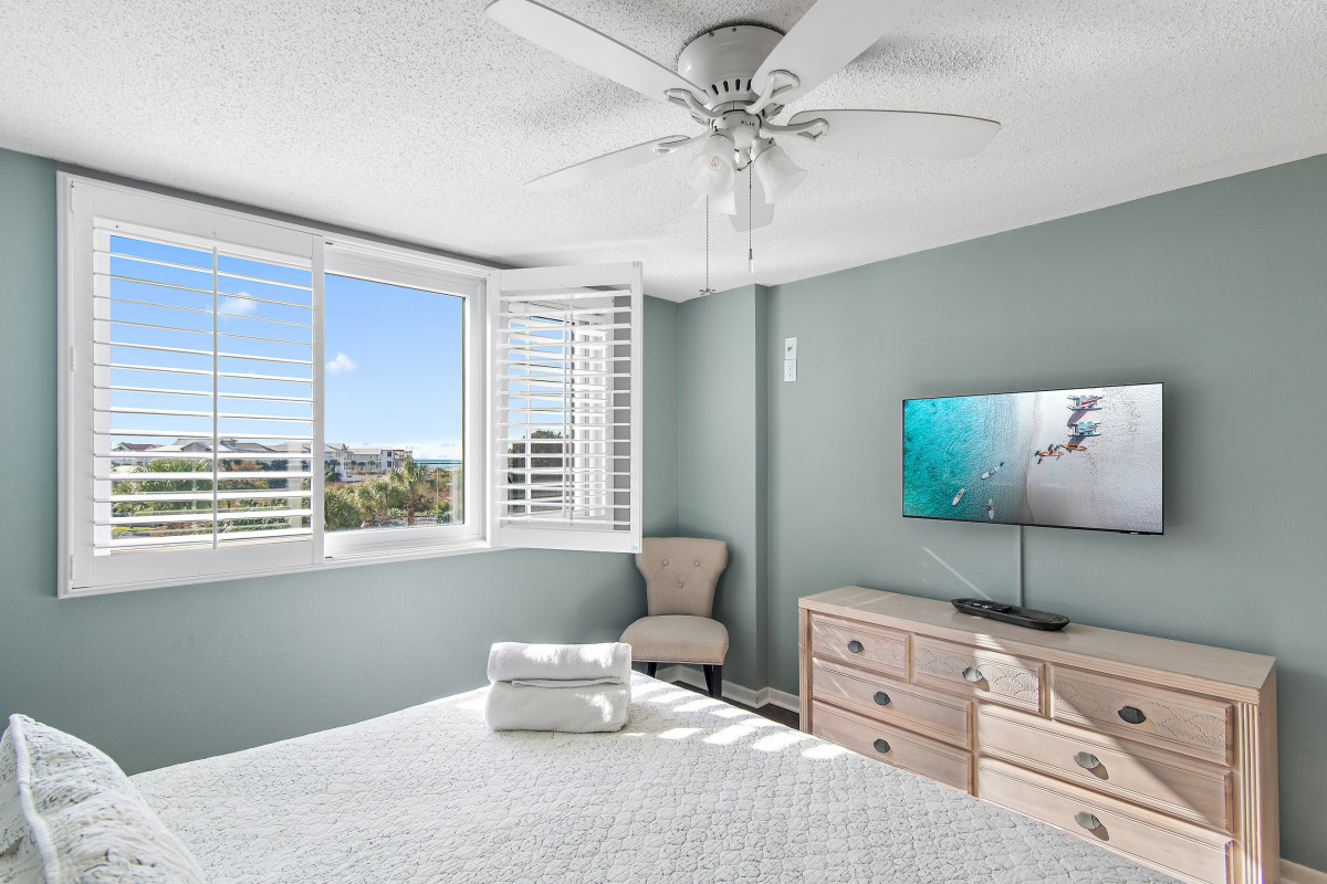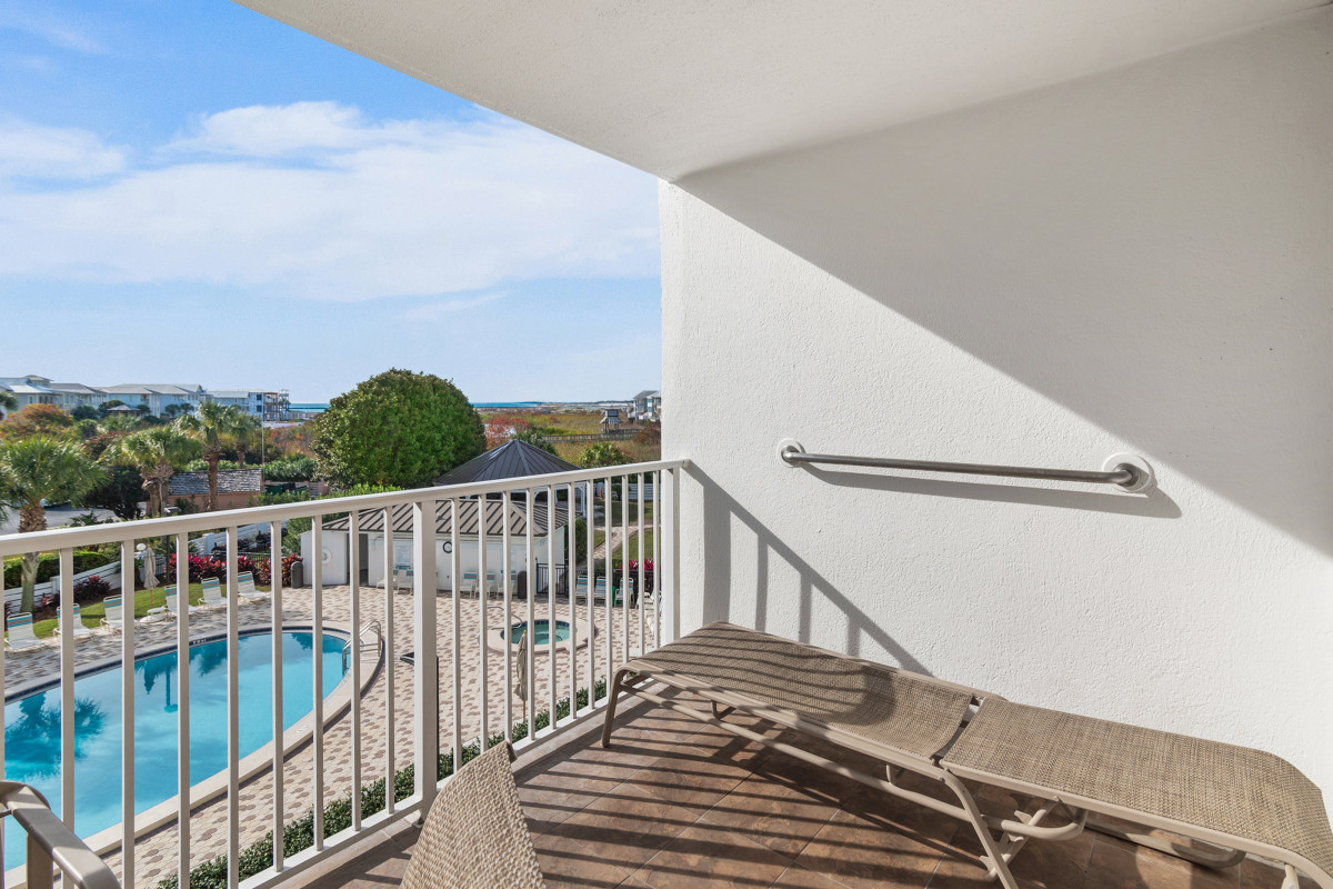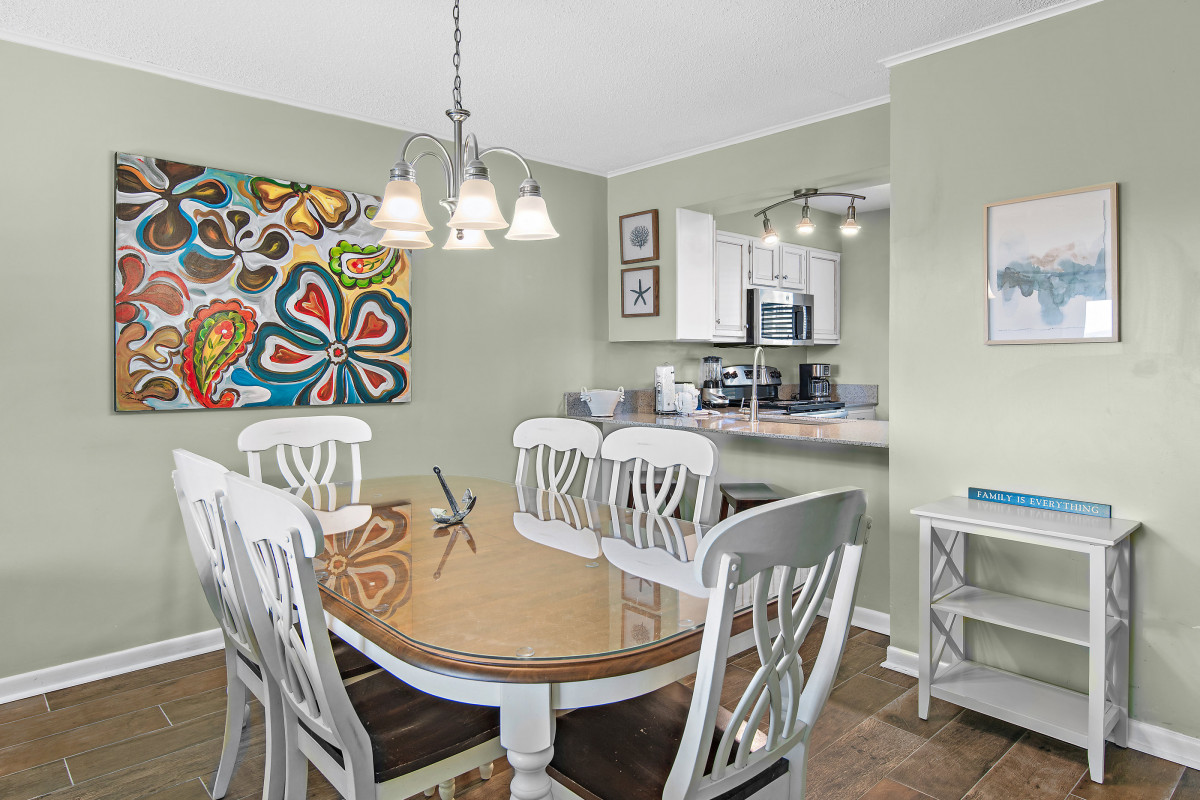 Brand new tile floors throughout all the living spaces and bedrooms. Unwind in the cozy living area, furnished with updated pieces designed for comfort and relaxation. The smart TV provides entertainment options for everyone. Stream your favorite shows, watch cable, or find a movie for the DVD player. The inviting decor creates a welcoming ambiance, making it an ideal space for family gatherings or relaxing evenings after a day spent exploring Destin. A queen sleeper sofa offers additional space for your family. Sit on the private balcony, where you can enjoy beautiful views while sipping your morning coffee or having a glass of wine and watching the sunset.