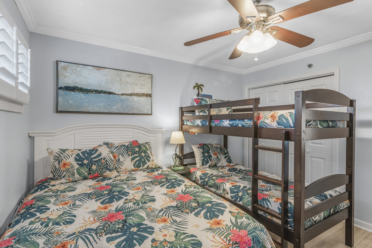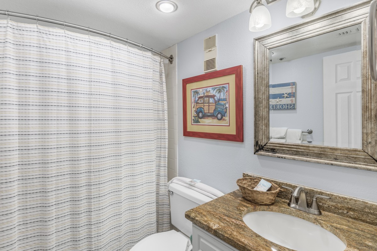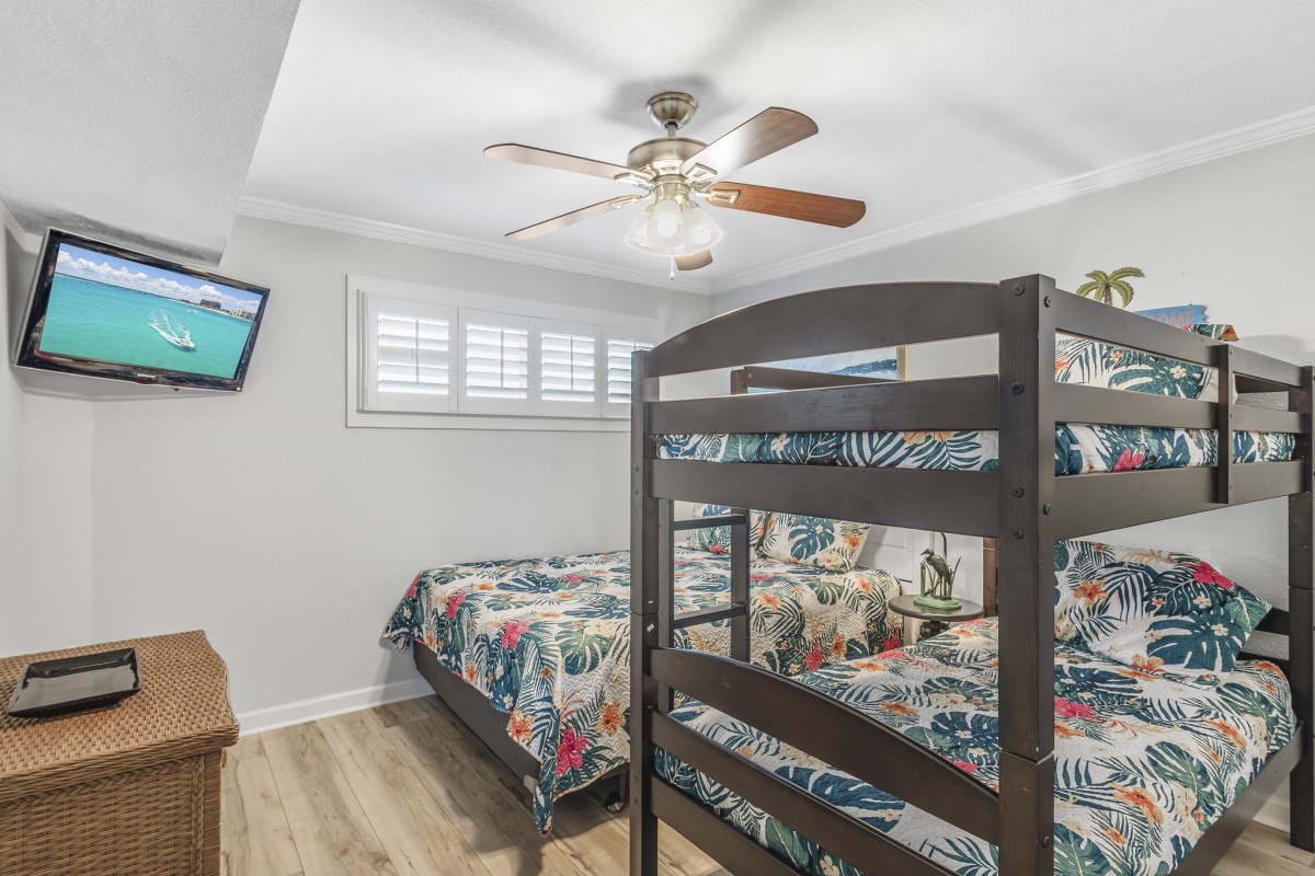 The master bedroom exudes Southern charm with its plush king-size bed, a 32” TV, and DVD Player for your entertainment needs. The bathroom features an updated vanity with granite countertops, a double vanity, and a tub/shower combo. In the guest bedroom, you'll find a full bed and a set of twin bunks, along with a 32” TV. The guest bathroom also offers an updated vanity with granite countertops and a tub/shower combo.