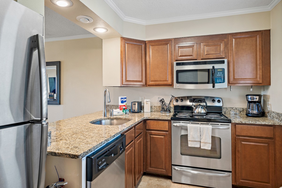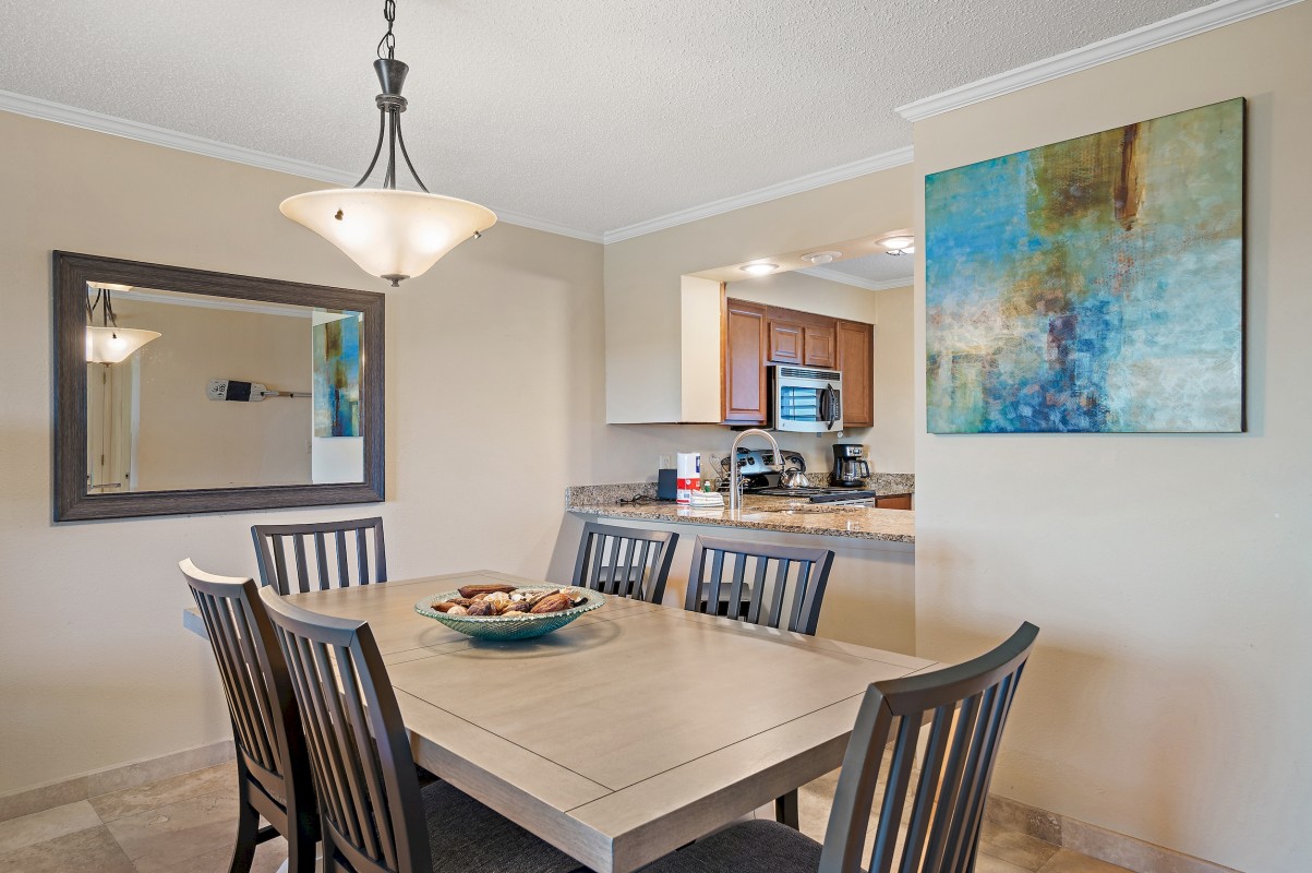 The open kitchen has cabinets, granite countertops and stainless- appliances, and is fully equipped with all the tools to meet your cooking needs. Gather around the dining room table that seats 6 or relax in the living area on updated furniture to watch the 52” TV with a Blue Ray Player and digital cable access. There is a queen sleeper sofa available for guests.
