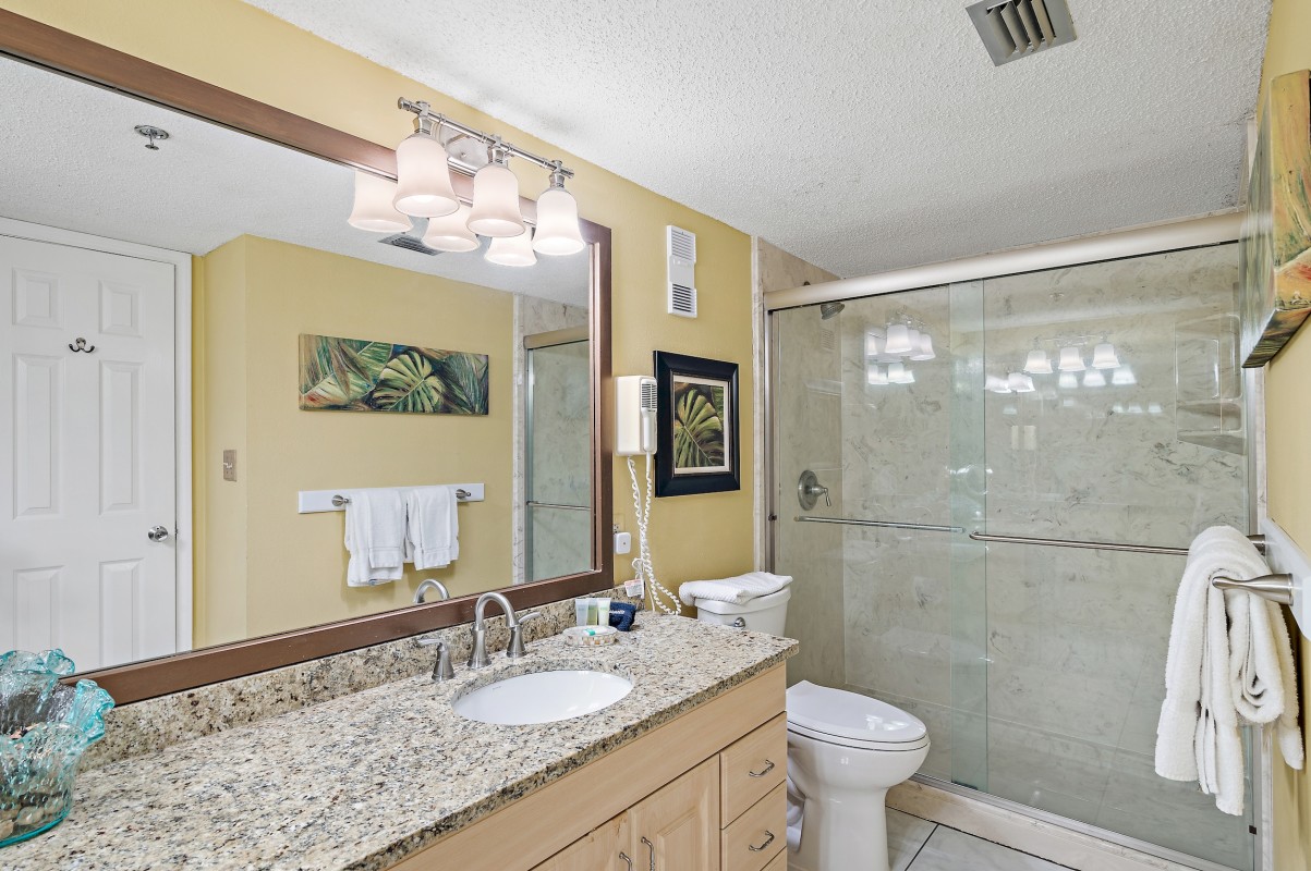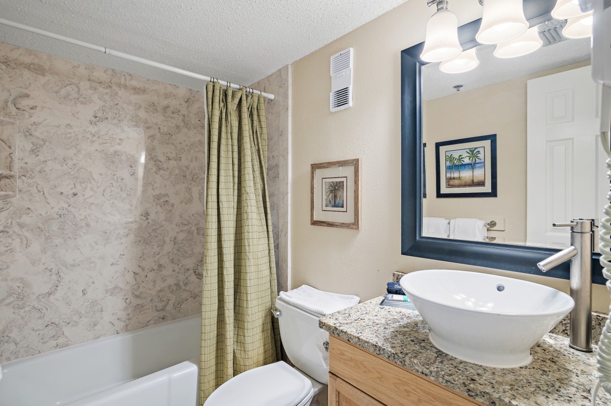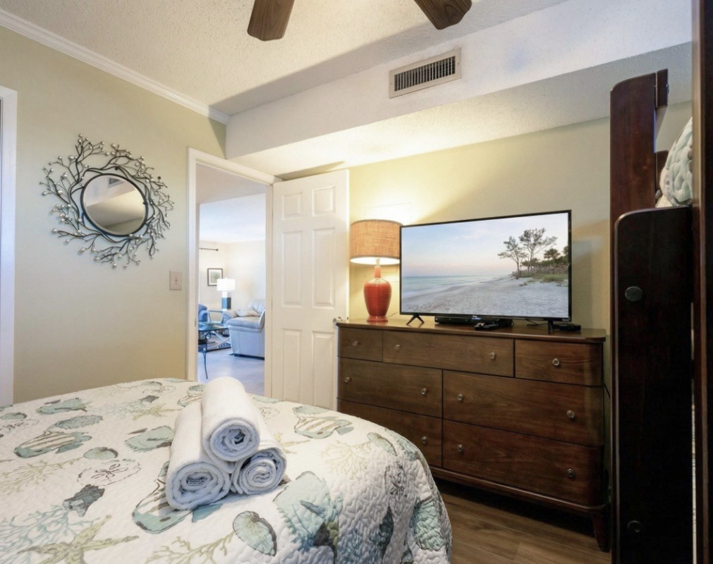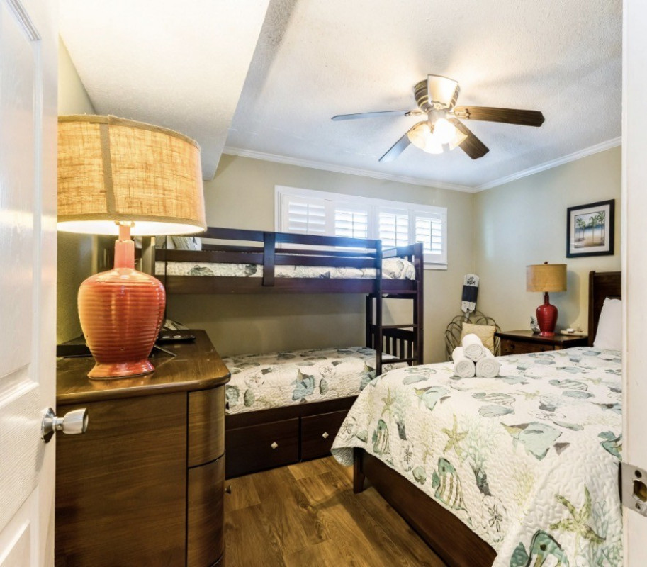 The master bedroom boasts a king size bed, and a 40” TV and DVD Player. The bathroom has updated vanity with granite countertops and a walk-in shower. The guest bedroom was recently renovated to include a queen bed along with twin bunk beds, as well as a 32” TV with a Blue Ray player and Roku TV. The guest bathroom has an updated vanity with granite countertops and a tub/ shower combo.