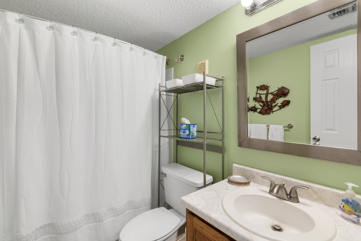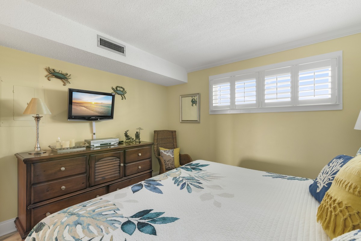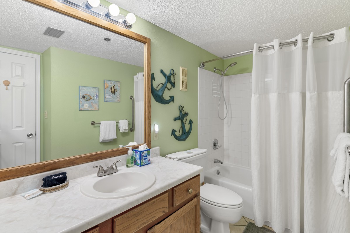 The updated master bedroom boasts a king size bed, and a 24” TV with a DVD Player. The bathroom has a tub/ shower combo. The guest bedroom has a king bed and a 24” TV with a DVD/ VCR combo. The guest bathroom has a tub/ shower combo.
