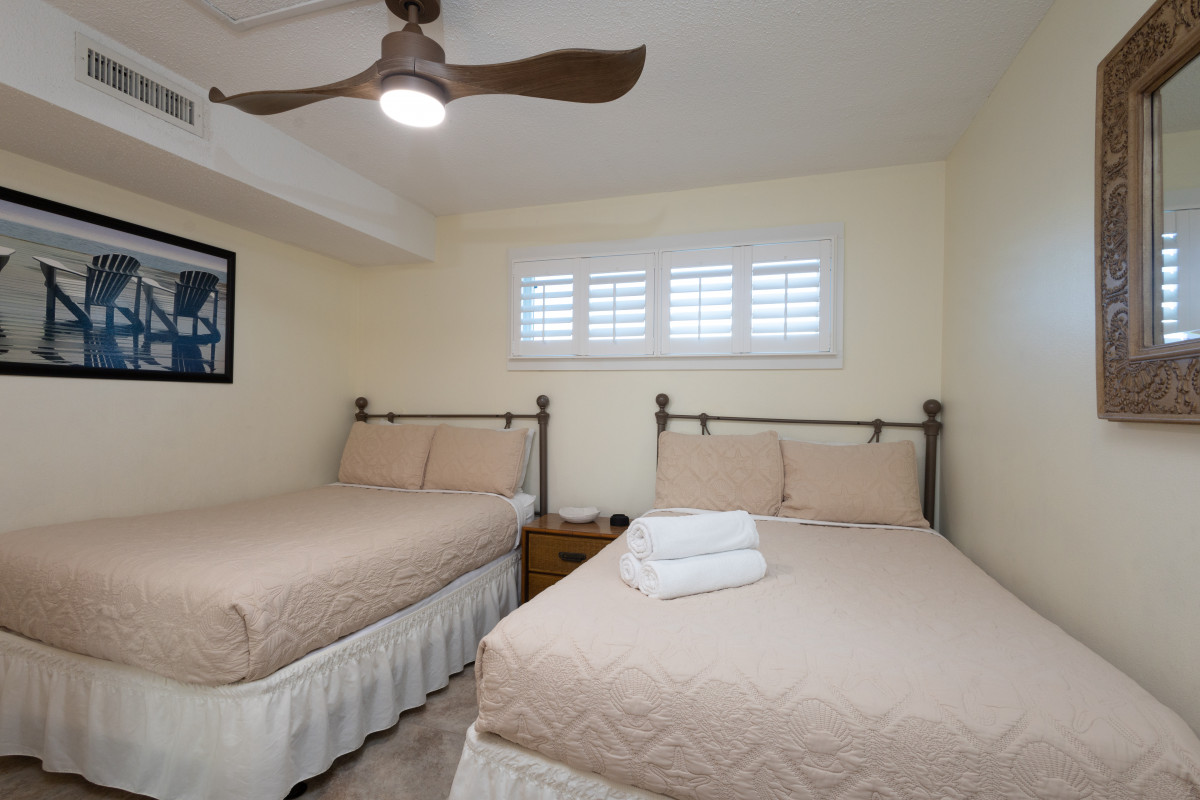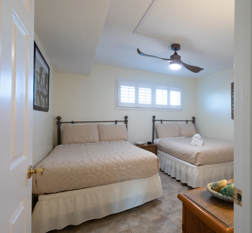 Bedrooms: The master bedroom features a king-sized bed and a private bathroom with a walk-in shower. The second bedroom is perfect for families or groups, offering two double beds that sleep four comfortably. Both bedrooms are equipped with ceiling fans and flat-screen TVs for added convenience.