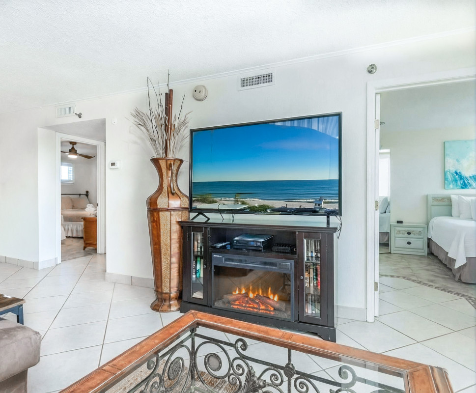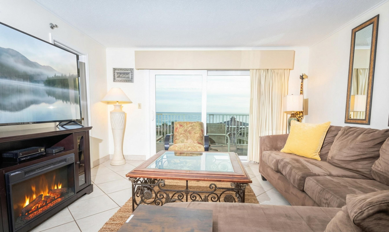 Living Room & Balcony: Relax in our large sectional sofa, perfect for unwinding after a day at the beach. The 65" flat-screen TV and cozy electric fireplace enhance the ambiance for a cozy evening in. Step out to the private balcony and relax on the balcony that features (2) chairs, (2) rockers, and lounge watching the dolphins in the water.