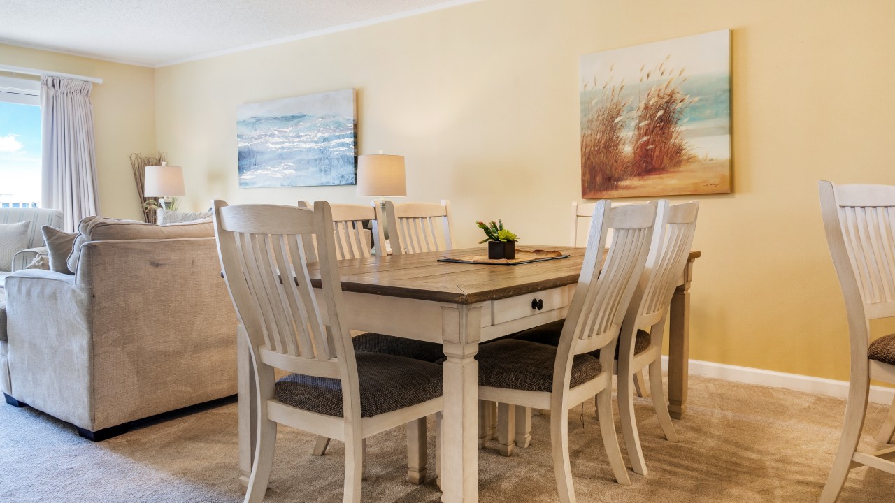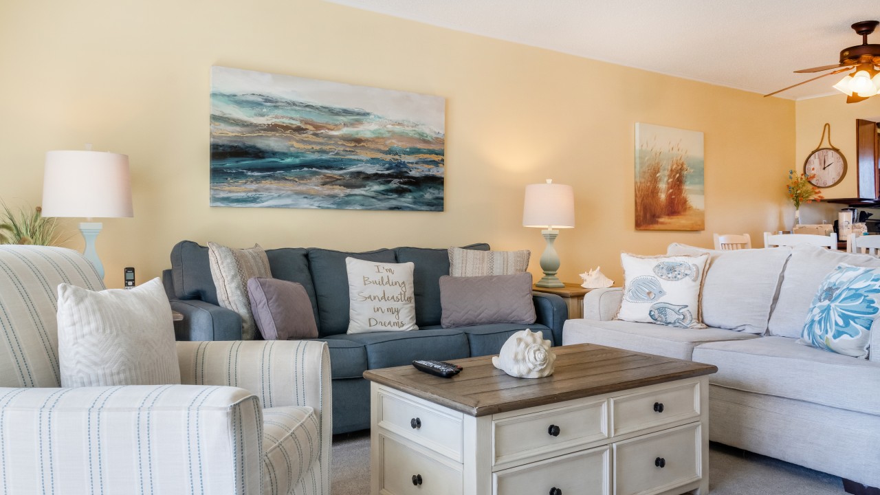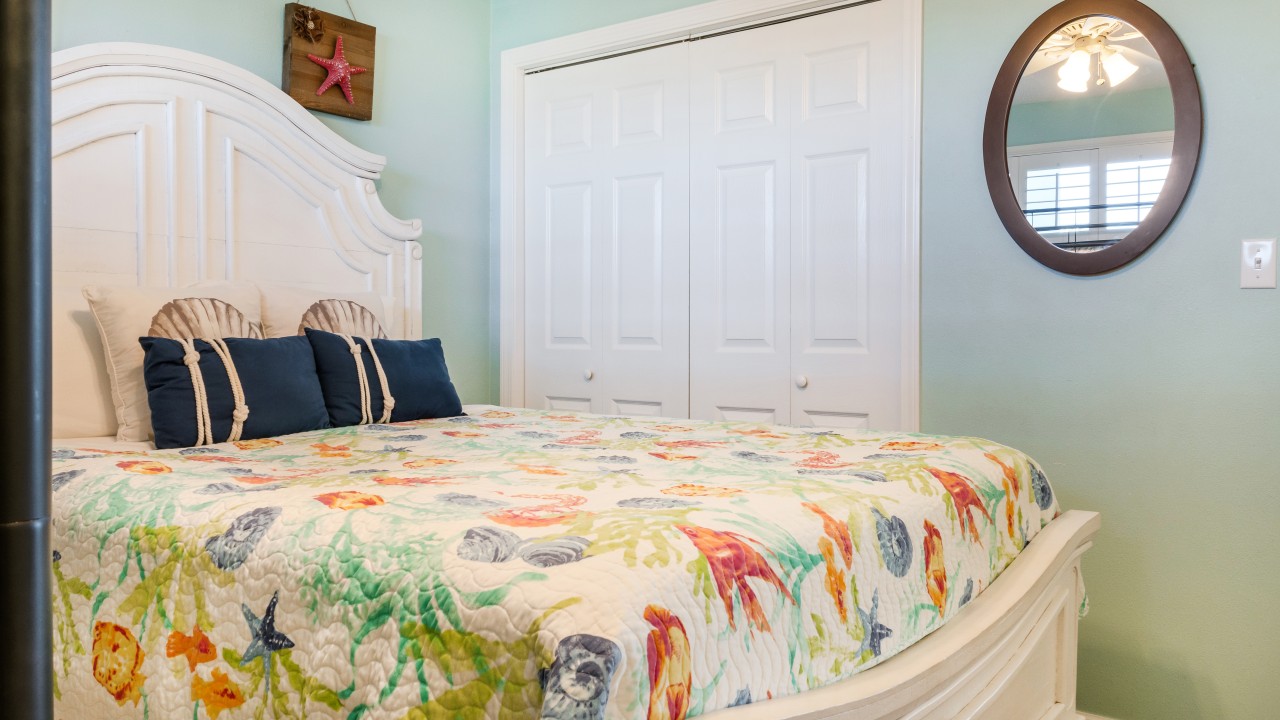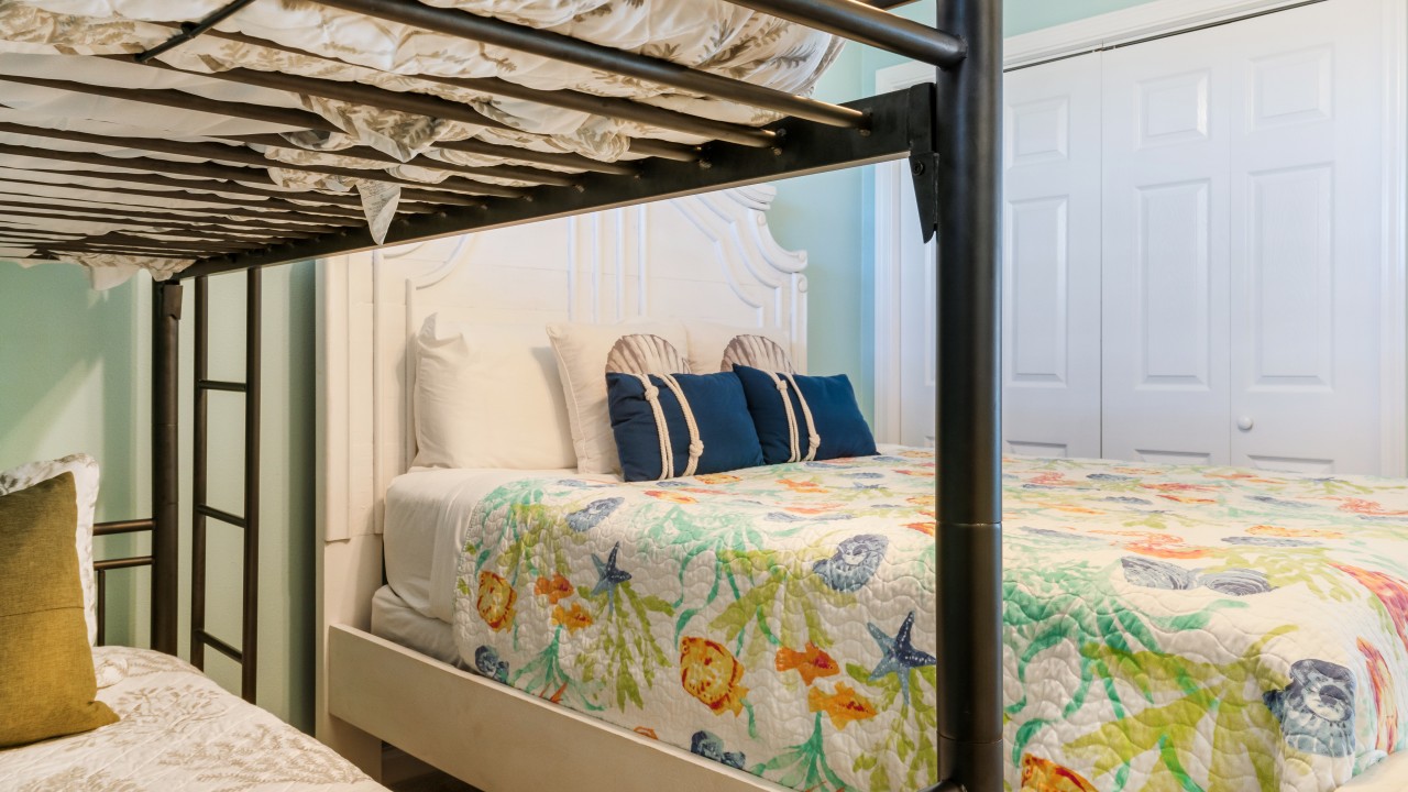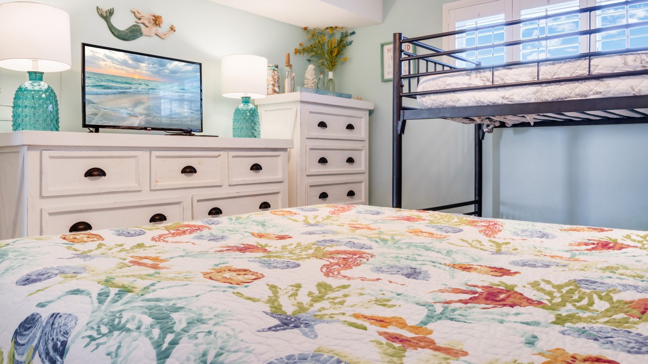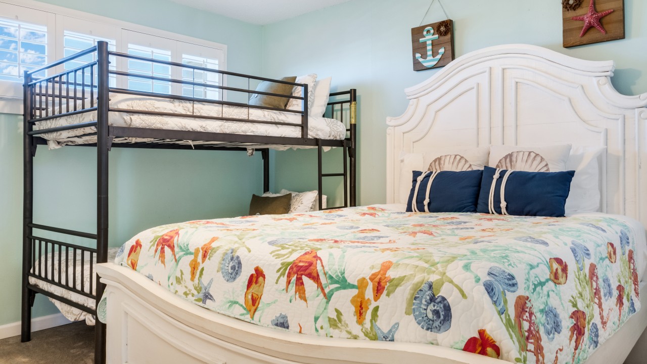 Bedrooms: The master bedroom features a plush king-size bed and a 32" TV, with tranquil beach views to set the perfect tone for relaxation. The guest bedroom offers twin bunks, a full-size bed, and a 24" TV, providing plenty of comfort and flexibility. The living room’s sleeper sofa adds extra sleeping space, ensuring everyone can enjoy their stay.