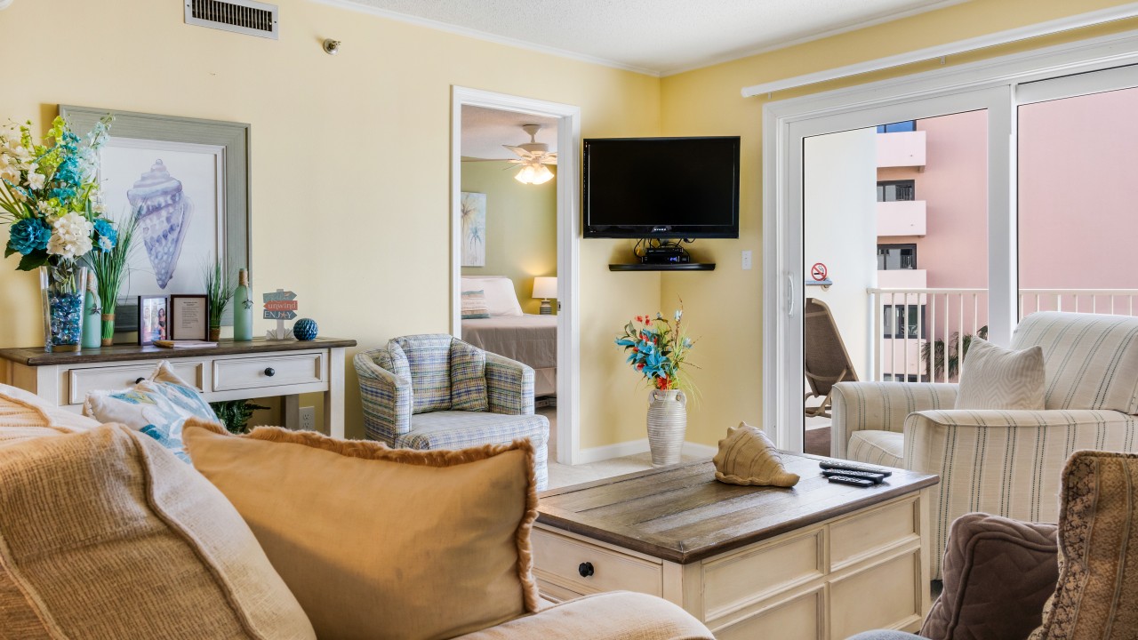 Living Room: Relax and unwind in the inviting living room, featuring a sleeper sofa and a 32" flatscreen TV for entertainment. The open layout allows for easy interaction, making it ideal for family and friends. Step out onto your private balcony to enjoy breathtaking views, from morning coffee to spectacular sunsets over the Emerald Coast.