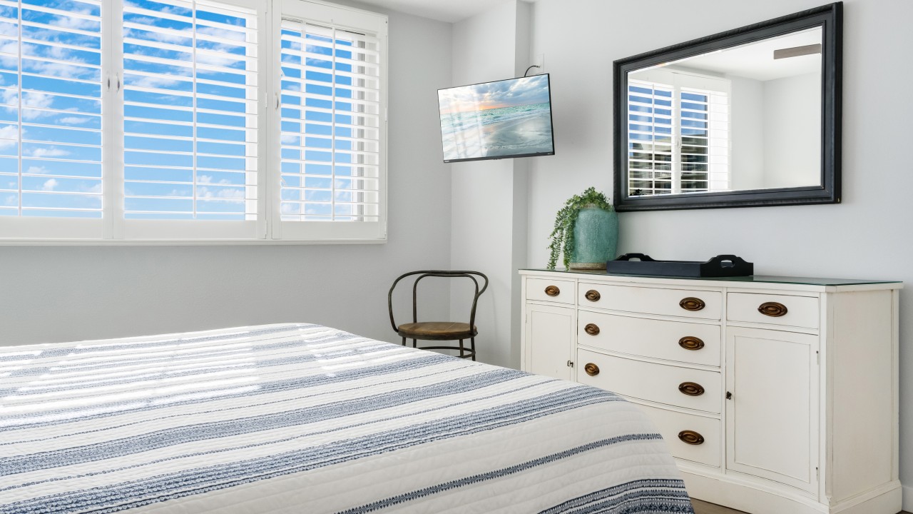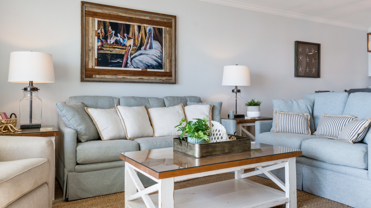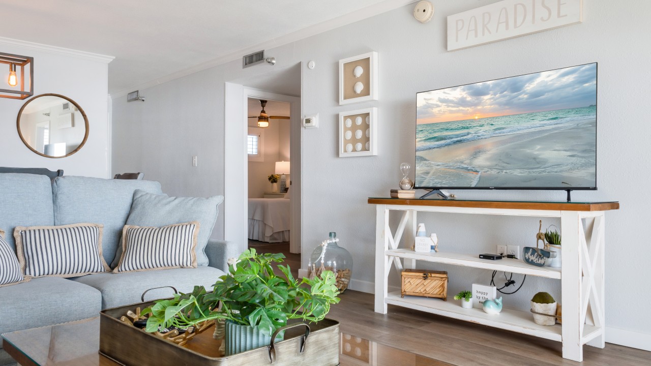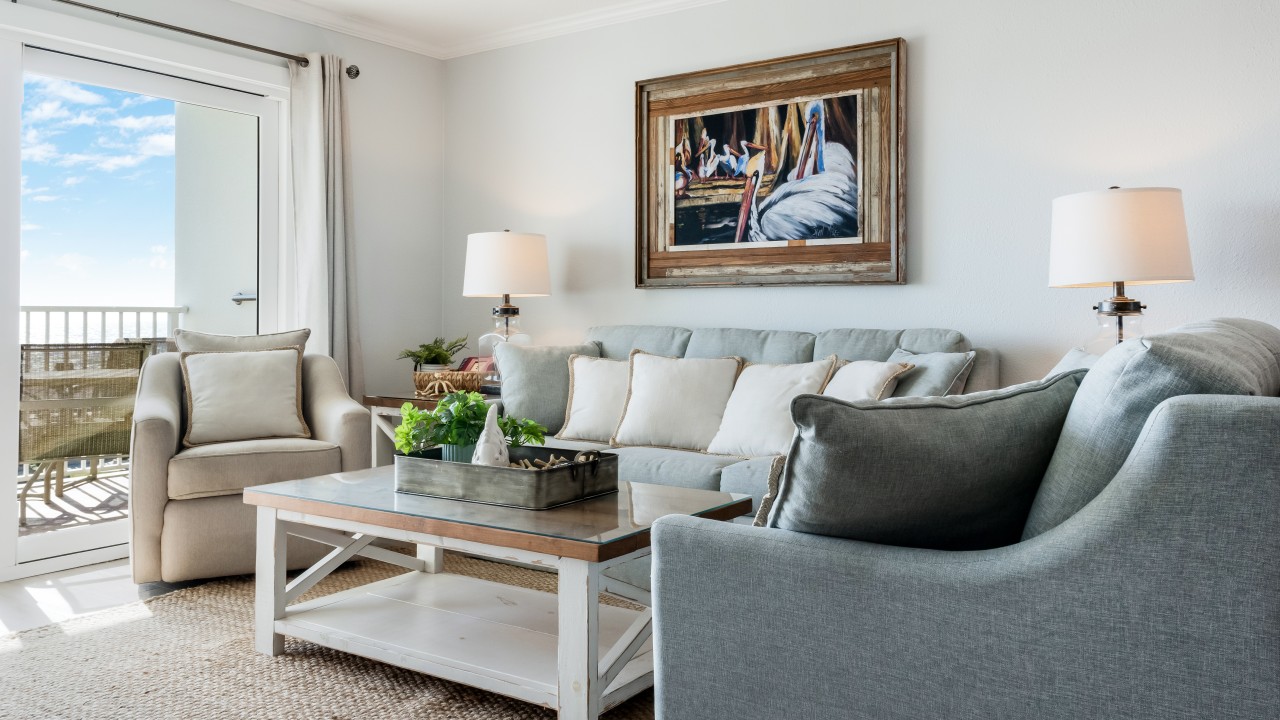 Living Room & Balcony: Step into our living room where relaxation & comfort comes go hand in hand. Enjoy watching your favorite show on our flat screen TV. Great for unwinding after a day at the beach. For additional sleeping arrangement our couch turns into a sofa sleeper. Open the sliding doors to your private balcony and take in stunning, unobstructed views of the emerald-green waters of the Gulf of Mexico. Whether you’re sipping your morning coffee or watching the waves roll in.