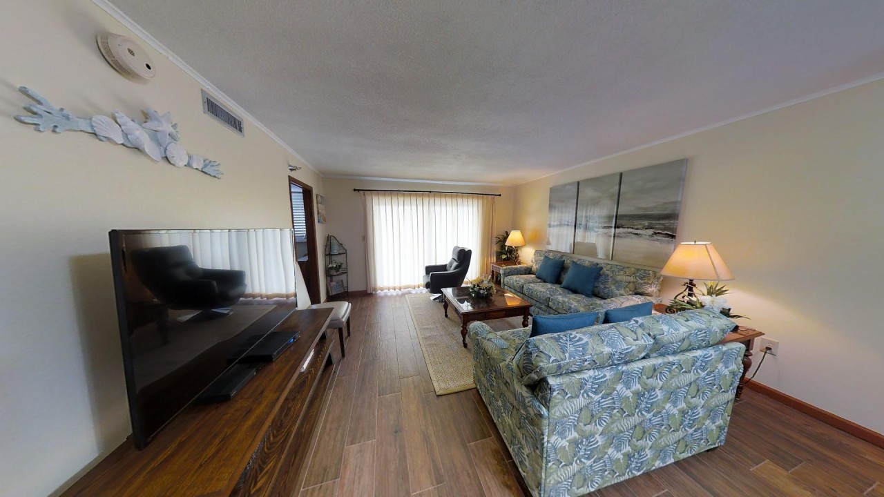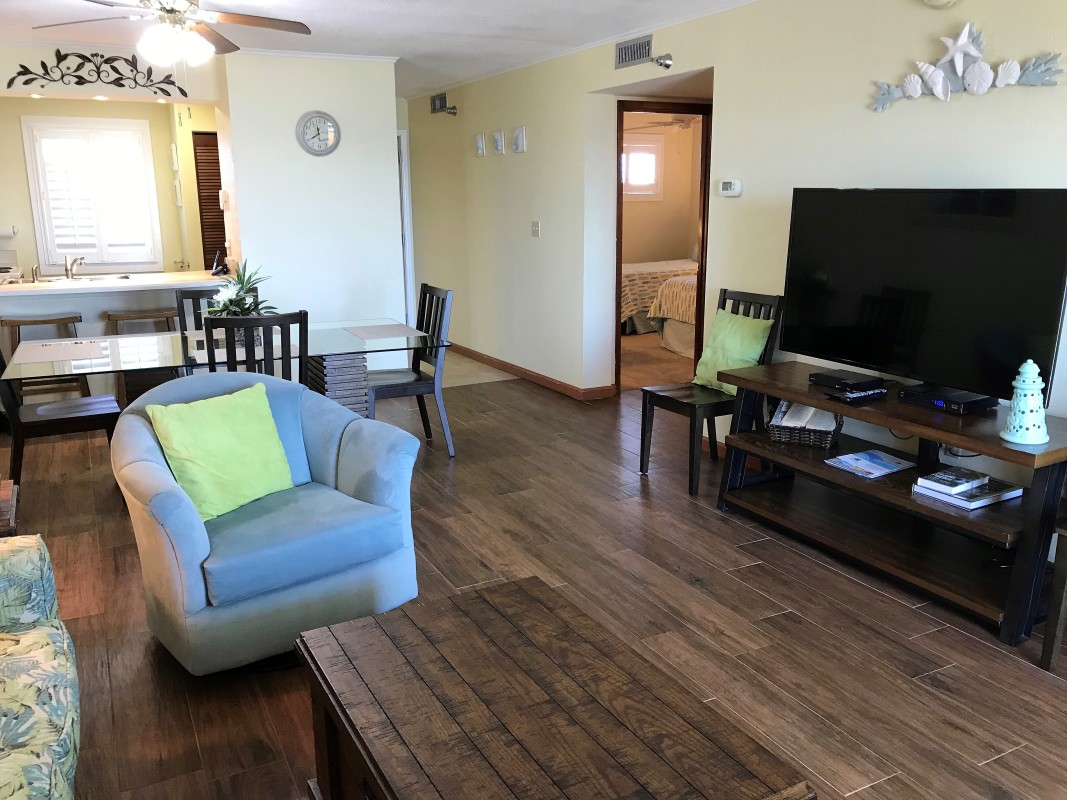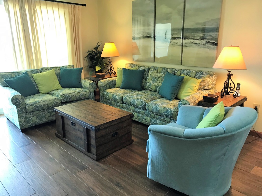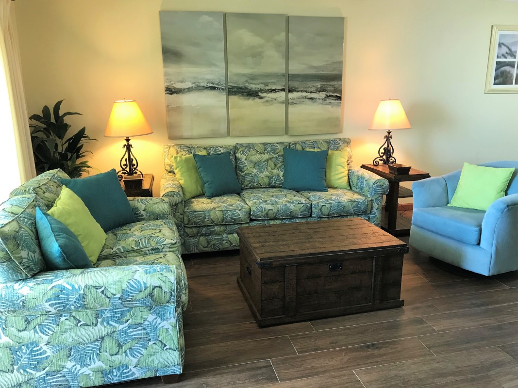Living Room: Relax in the updated living area featuring a queen sleeper sofa, a 50” TV, Blu-Ray player and digital cable access for endless entertainment during your stay in our Destin beachfront condo.