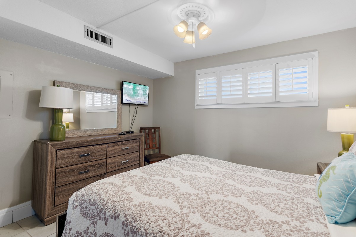Bedrooms: The master bedroom features a new king mattress, a 32" TV, and plenty of space for relaxation. The guest bedroom includes a queen bed, also with a 32" TV.