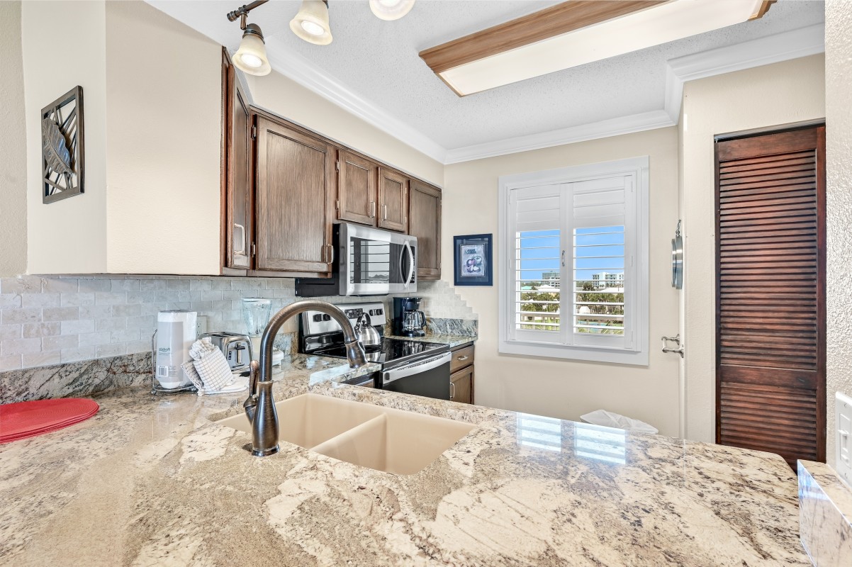 steel appliances, granite countertops, tile backsplash, Plantation shutters, tile floors and light