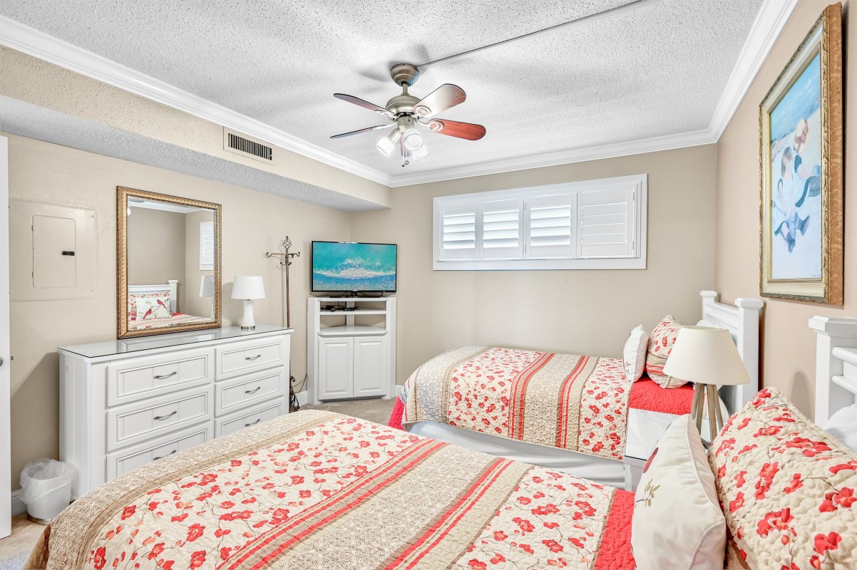 Plantation shutters and ceiling fans. The guest bedroom has a 40" flat-screen TV, and the master