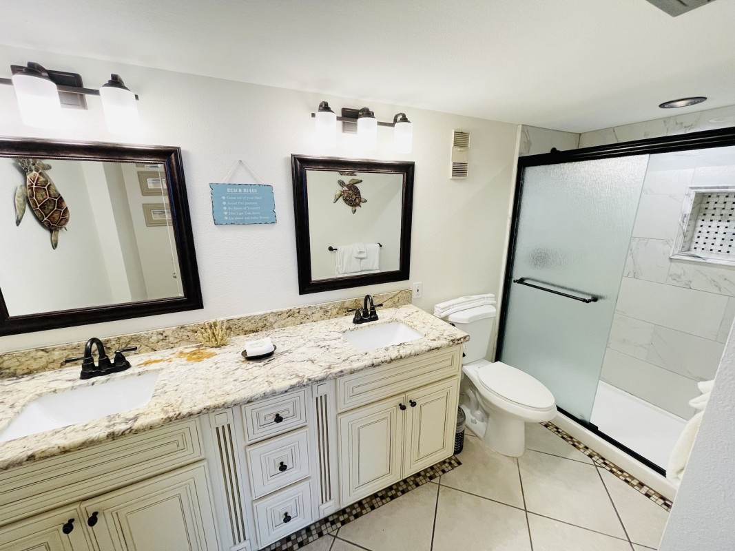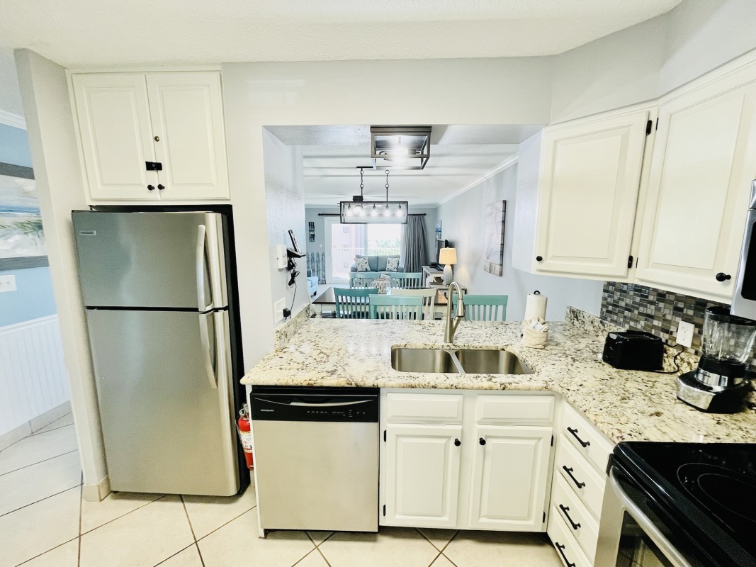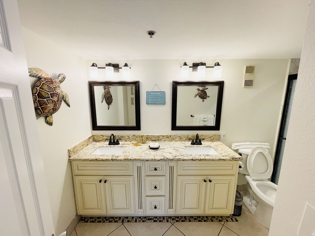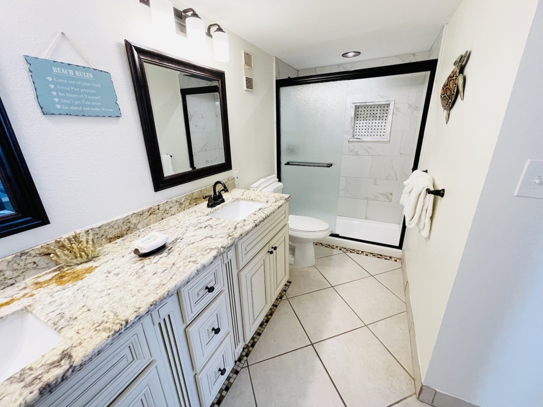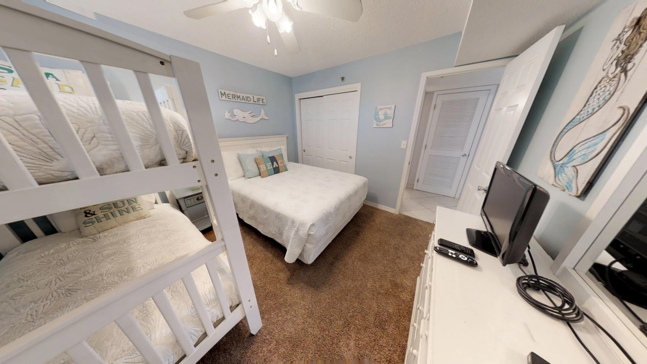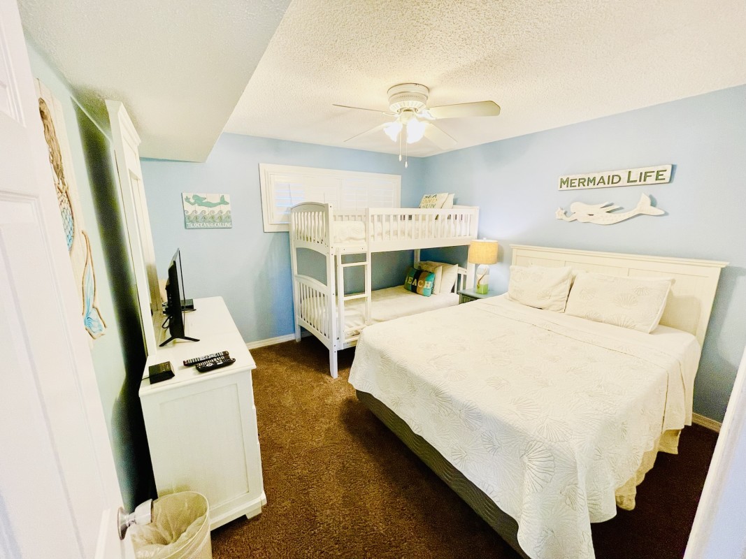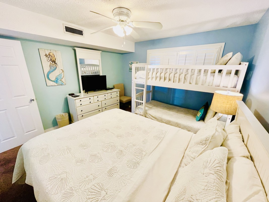 Bedrooms: Both bedrooms are designed for your comfort, featuring new furniture and mattresses. The master bedroom offers a king bed and a 36” TV, while the guest bedroom has a queen bed, bunk beds, and a 24" TV. Each bedroom is designed to offer a restful sleep after a fun day at the beach.