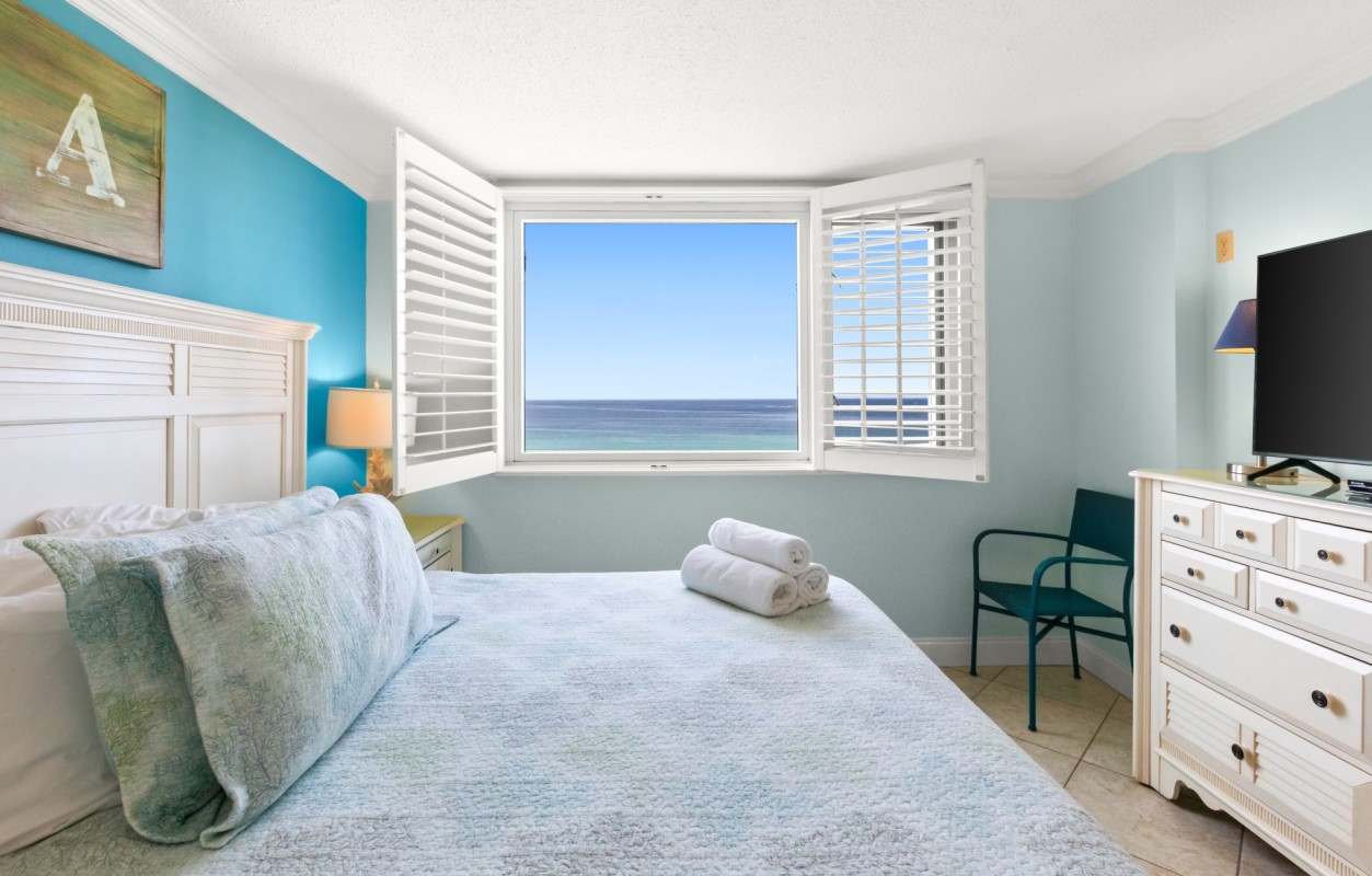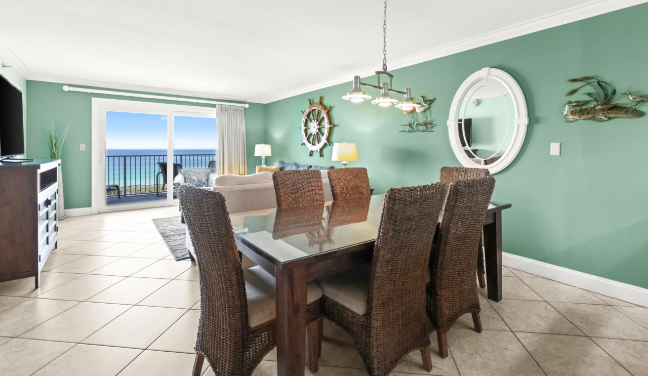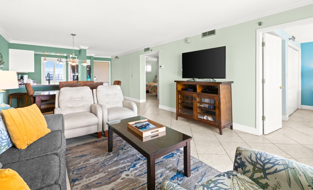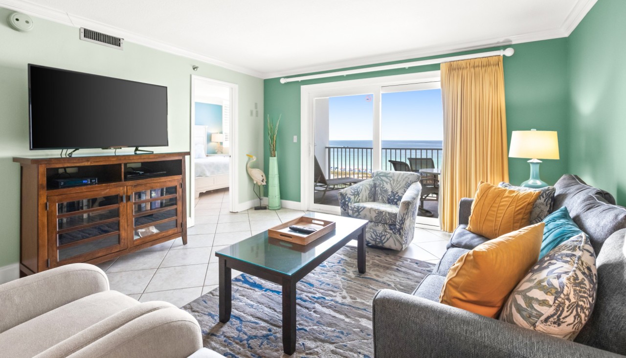 Living Room: The living room opens to a private balcony with panoramic Gulf of Mexico views, perfect for soaking in Destin's stunning sunsets. It features a queen sleeper sofa, updated in January 2023, and a 55” Roku Smart TV with a Blu-ray player, making it an inviting space for relaxation and entertainment during your Destin vacation getaway. Step onto the balcony to enjoy refreshing sea breezes and unforgettable views that make every moment a highlight of your stay.