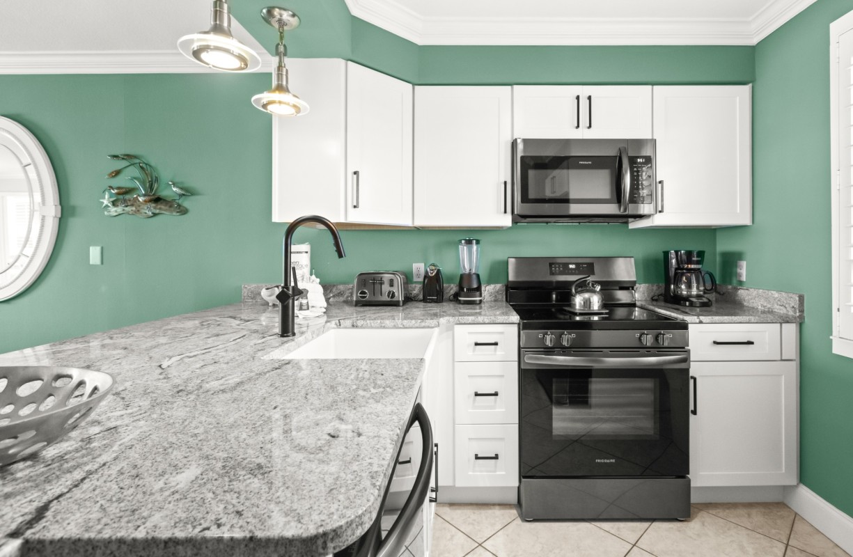 Fully Equipped Kitchen: The kitchen has all the appliances for your culinary needs, while preparing meals. Remodeled in October 2024 with elegant granite countertops, a stylish apron sink with a new faucet, brand-new cabinets, and stunning black stainless appliances. Perfect spot to test your culinary skills.