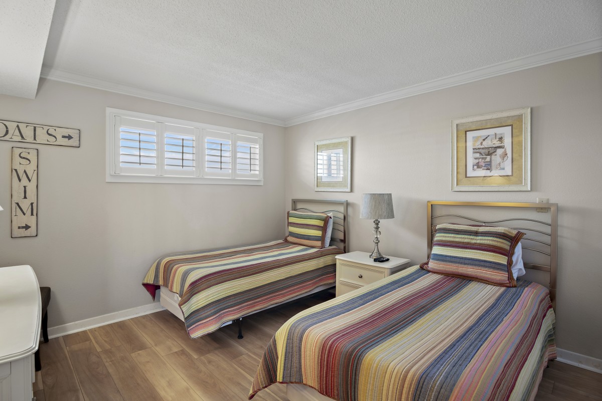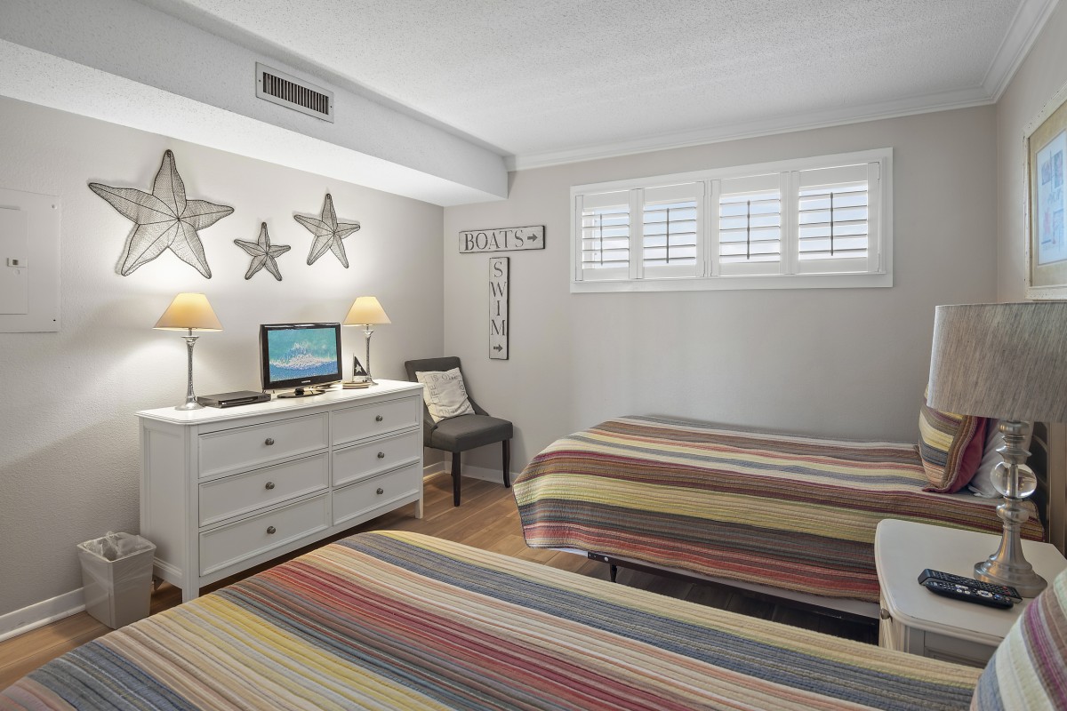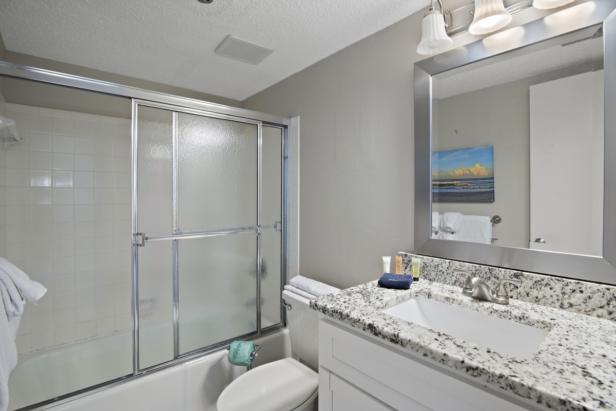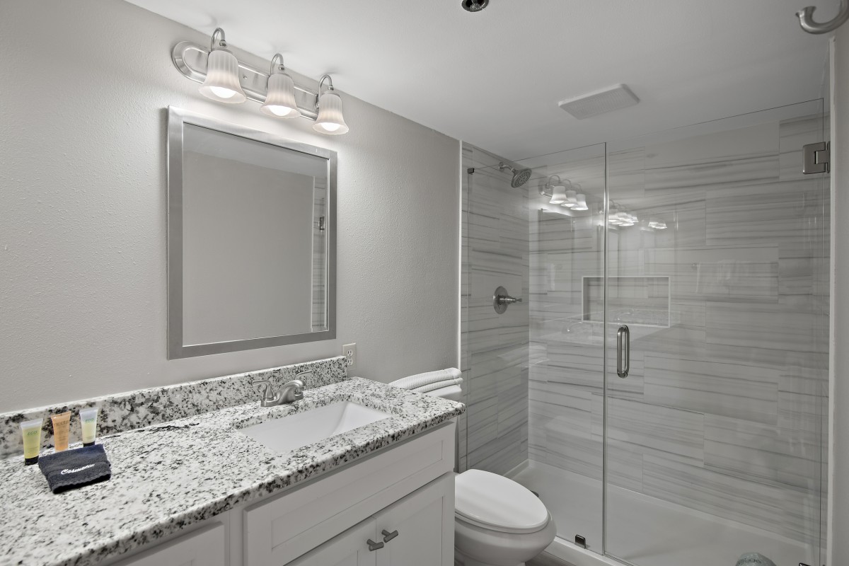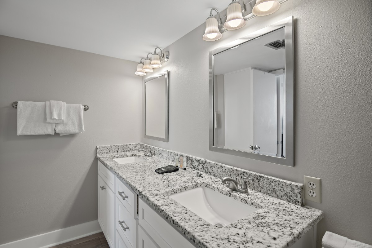 Bedrooms: The master bedroom offers a luxurious king bed, a 40-inch flat-screen TV, and an updated private bathroom with a walk-in shower, double vanity sinks, and granite countertops. The guest bedroom features two twin beds and another flat-screen TV, making it perfect for children or additional guests. The guest bathroom is beautifully updated with granite counters, a quartz sink.
