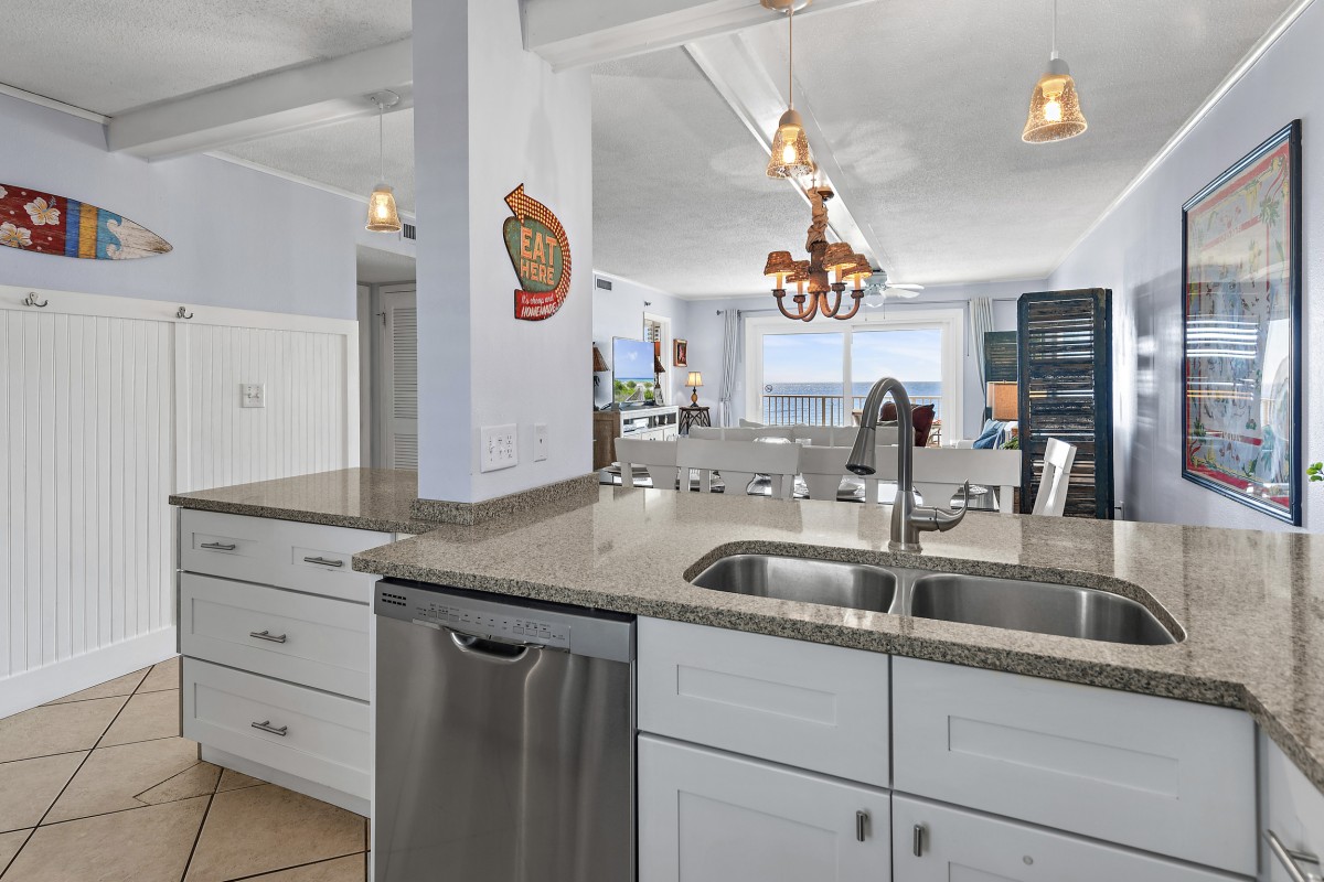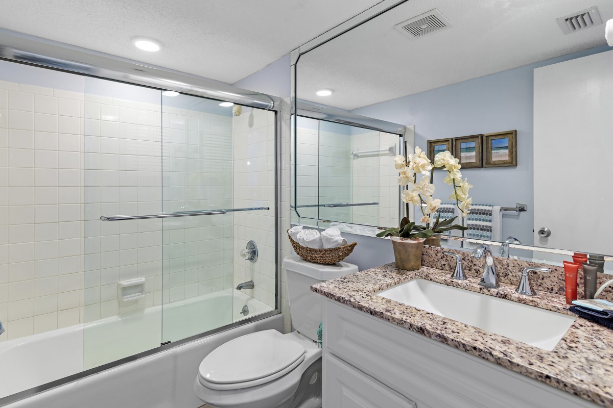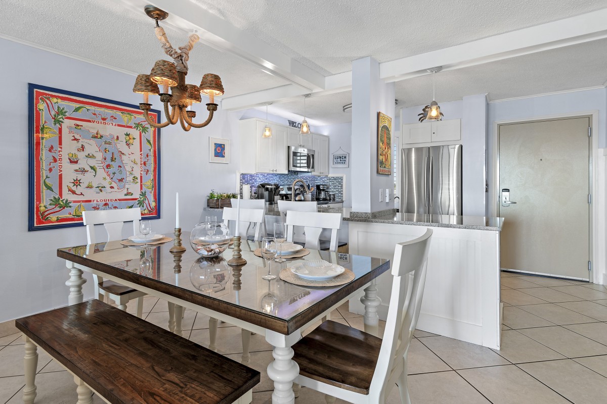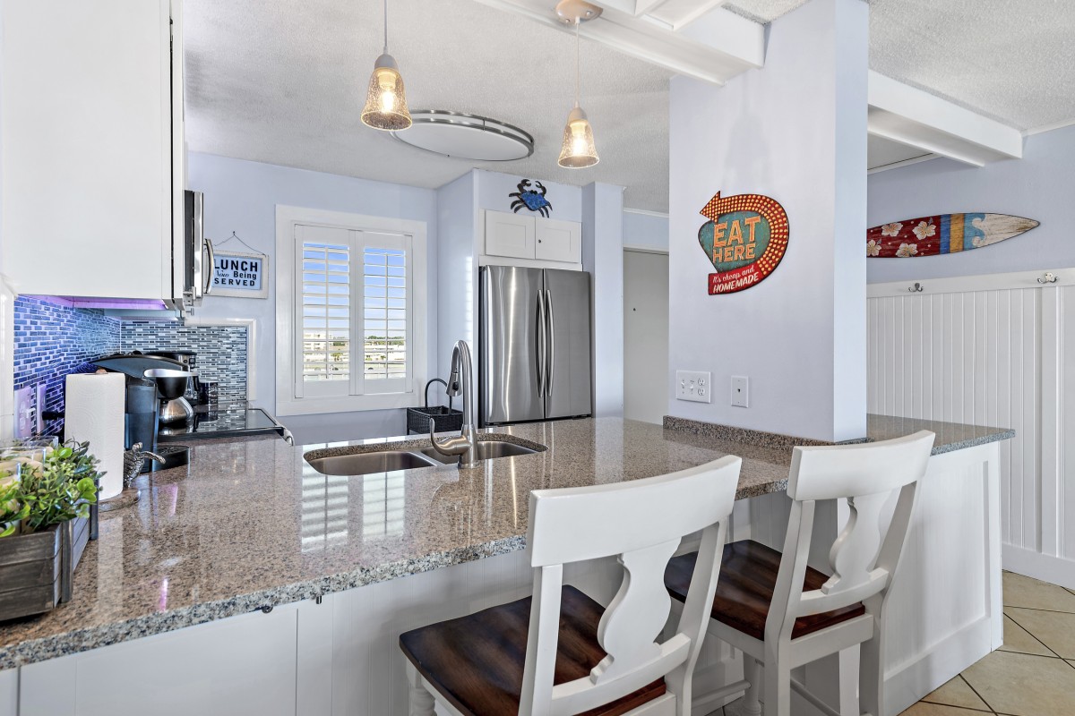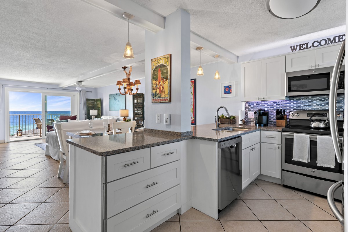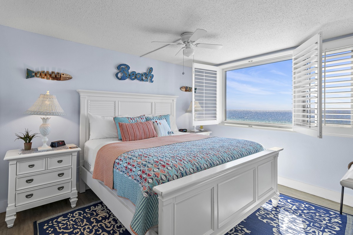 Unit 607 is completely renovated with unobstructed beach/water views, new furniture in both bedrooms, dining room, and living room including a leather Lazy Boy recliner. Other updates include: keyless entry, relocated refrigerator to improve sightlines (not many units offer this), quartz countertops throughout, stainless steel appliances, Keurig coffee maker, ceiling fans, large flat screen TVs in every room, smart TV in living room, vinyl plank flooring and mirrored sliding closet doors in both bedrooms, new glass shower doors, new sliding glass balcony door leading to panoramic views, and an oversized walk-in shower in the master bath.
