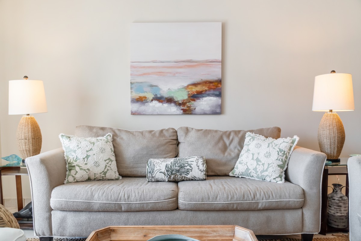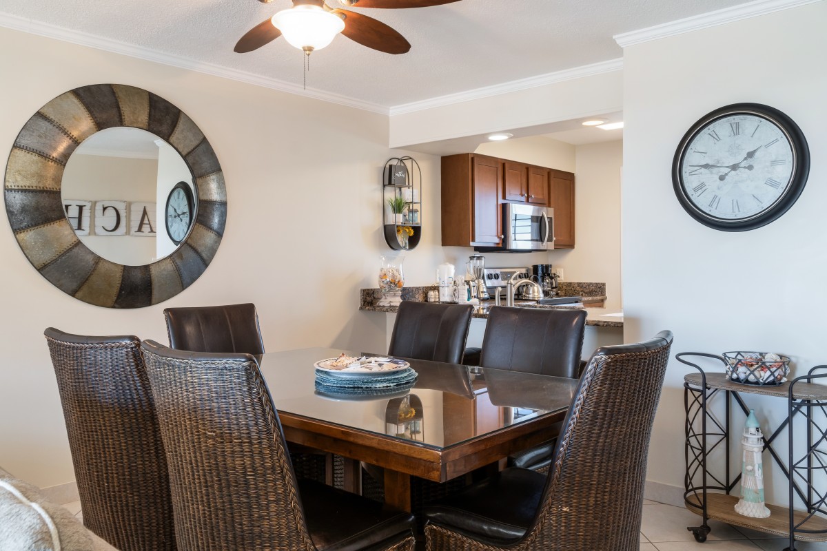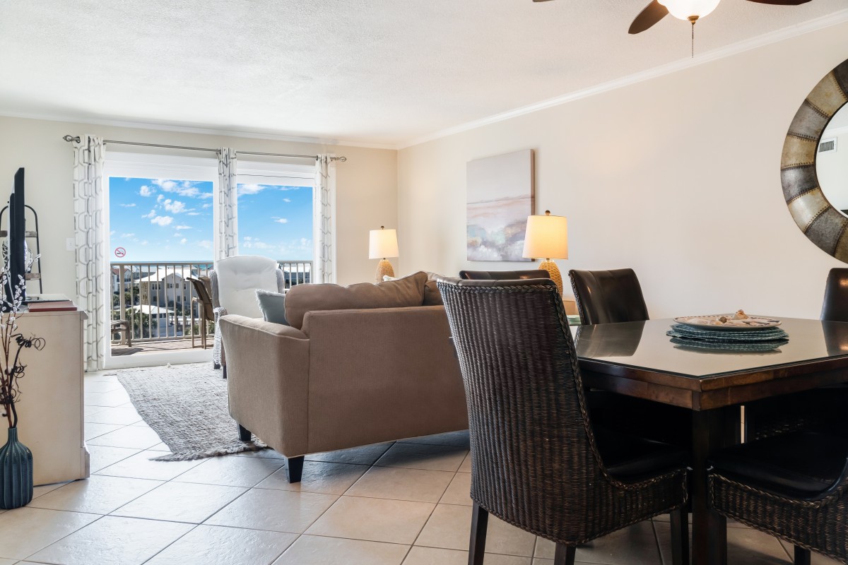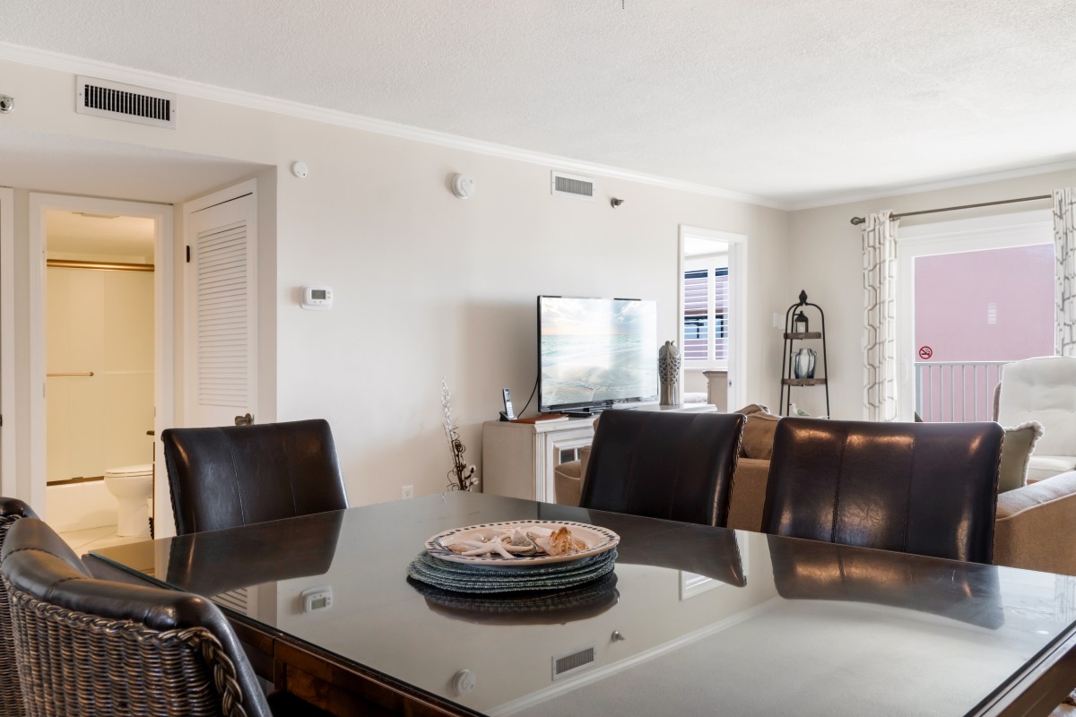 Living & Dining Area: The spacious living room welcomes you with comfortable seating, a large flat-screen TV and tasteful decor, creating a cozy retreat for relaxation after a day at the beach. The sofa easily converts into a sleeper, providing comfortable accommodation for additional guests. The dining area offers an inviting table, perfect for gathering around for breakfast, lunch or dinner. We also offer a private balcony, where you can unwind with breathtaking views, refreshing sea breezes, and Destin’s stunning sunsets. Throughout the summer months, there are spectacular views of the fireworks over the water on a weekly basis.
