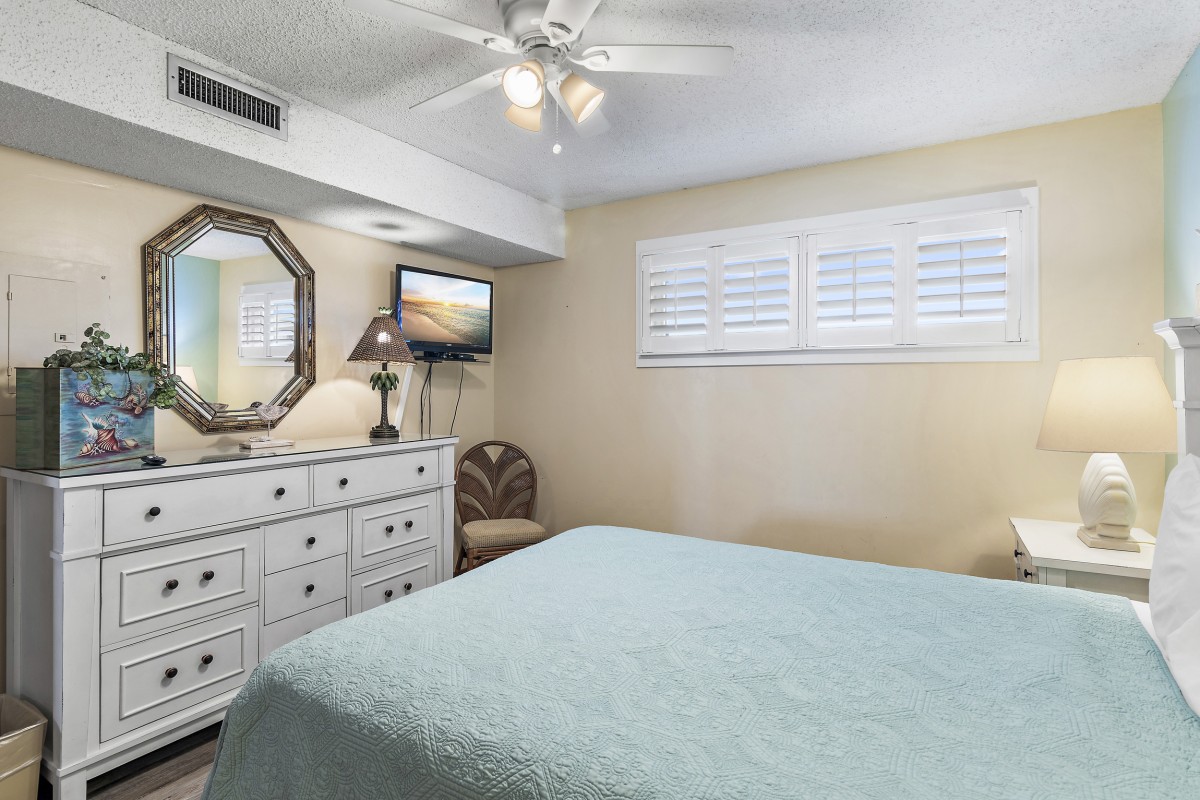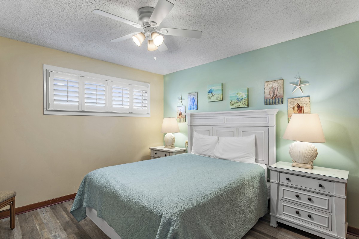 Bedrooms: The master bedroom features a king bed, plantation shutters, and 42" TV, private bathroom with a washer and dryer. The guest bedroom includes a queen bed, plantation shutters, and 20" TV. Both rooms are enhanced with new plantation shutters for added style and privacy.