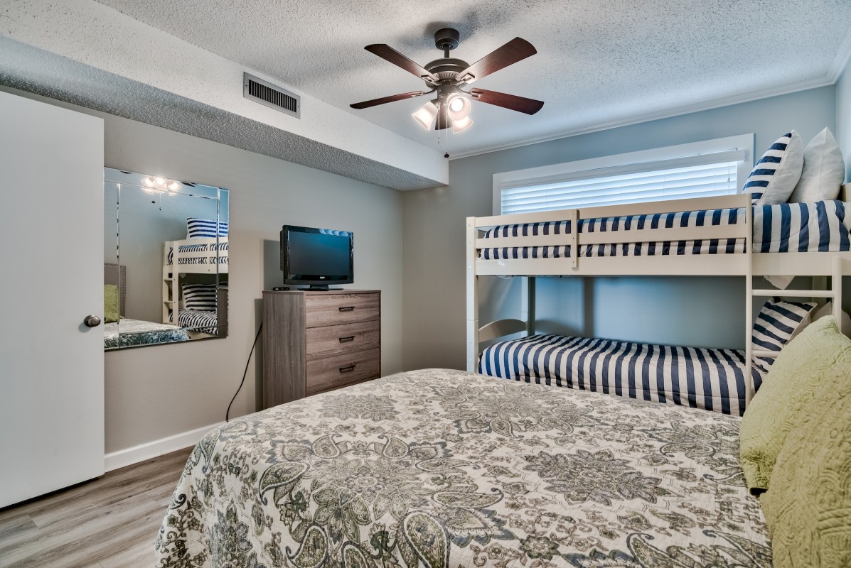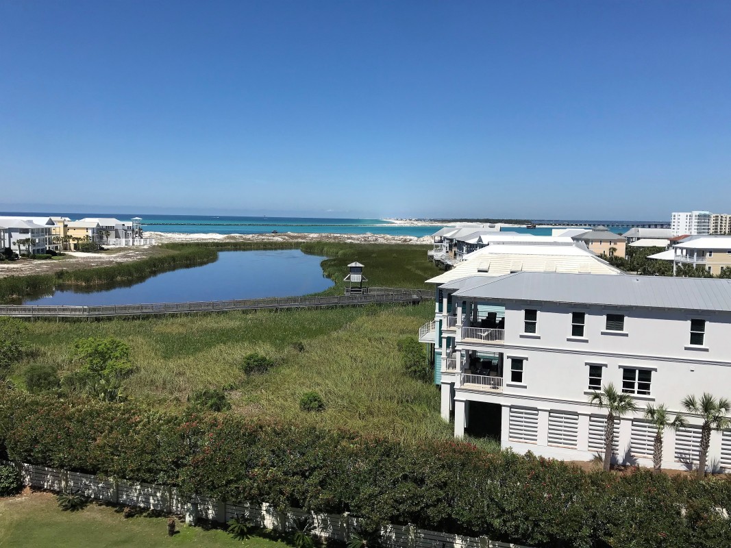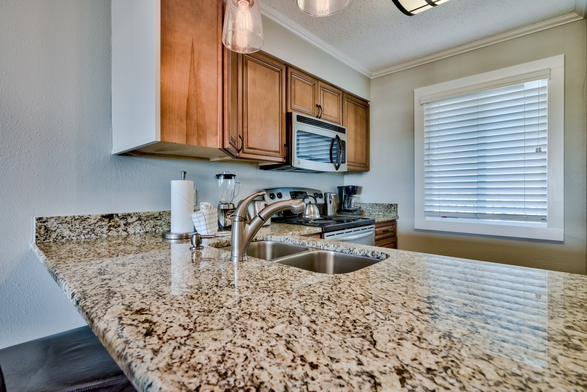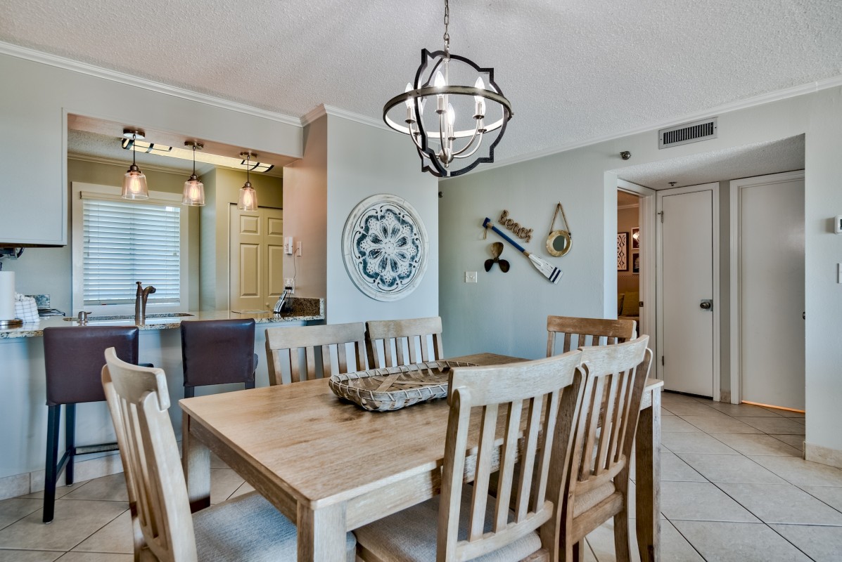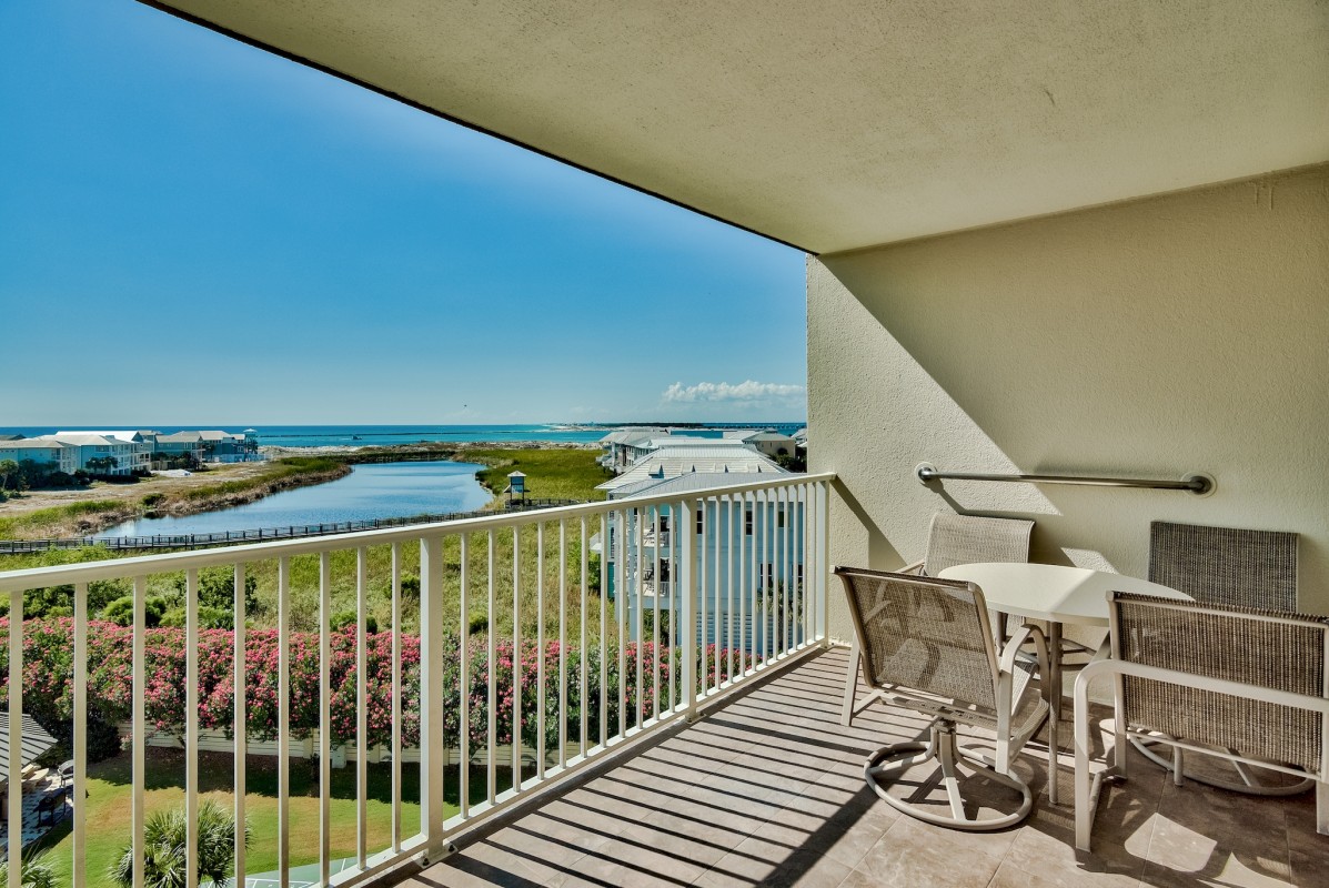 Living Room, Dining Room, and Private Balcony: The living room provides cozy seating with a queen pull-out sofa and a large HD TV, perfect for family movie nights. The dining area Dining room table has upholstered chairs seating six with two leather bar stools at island. Step onto the private balcony to enjoy unforgettable views of Destin’s sunset skies and nearby Lake Christina, along with the wildlife and tranquil surroundings. View the Destin and Fort Walton fireworks from the balcony!