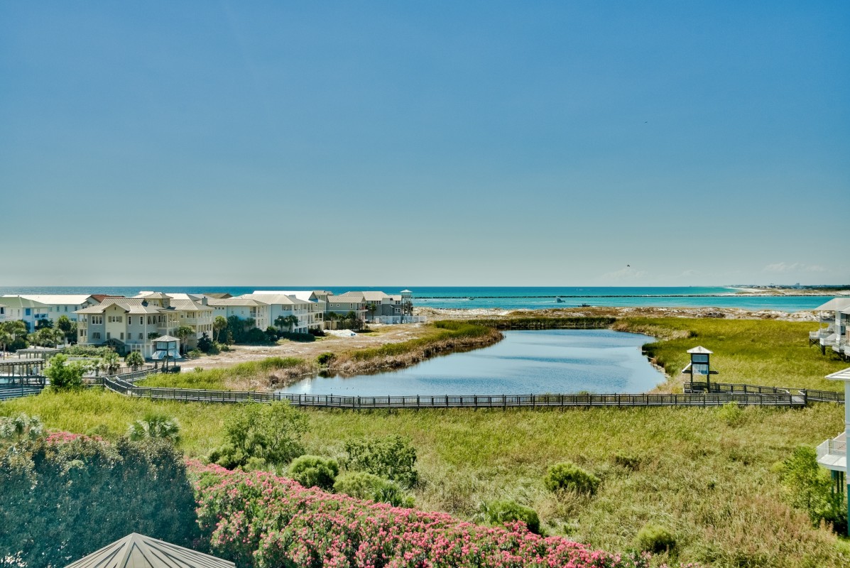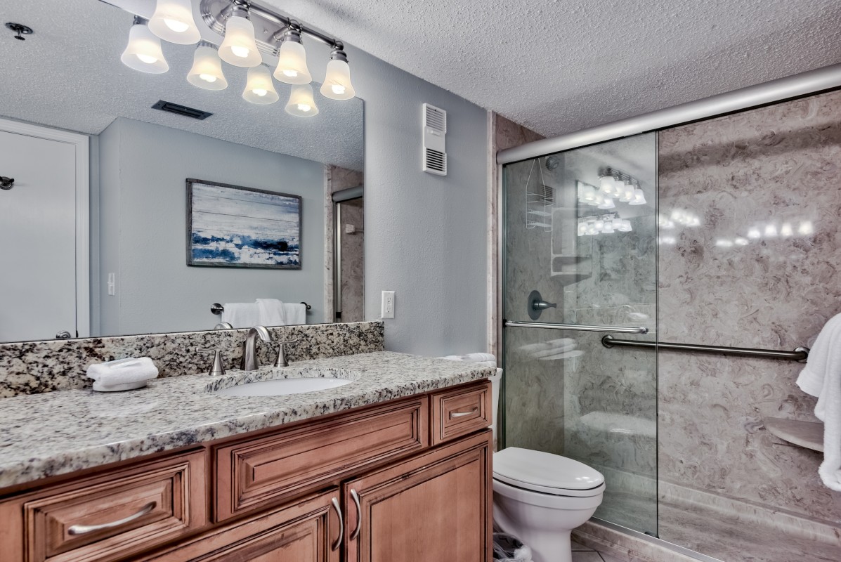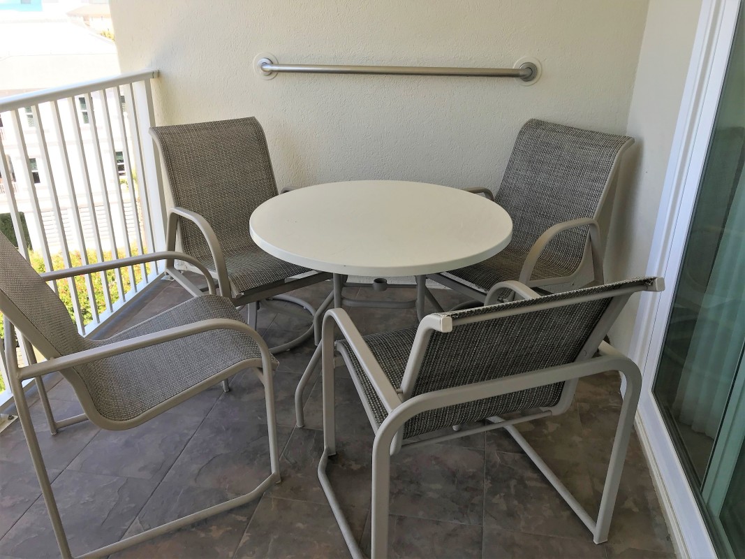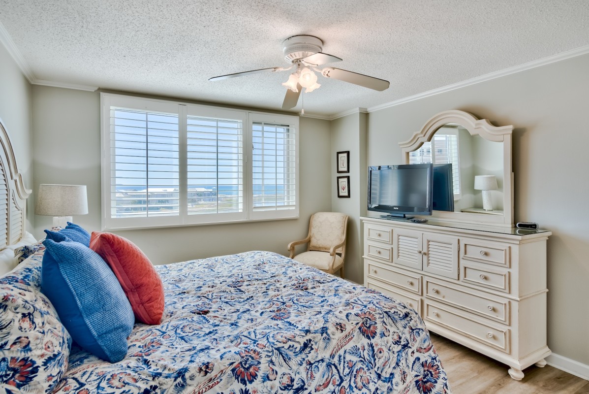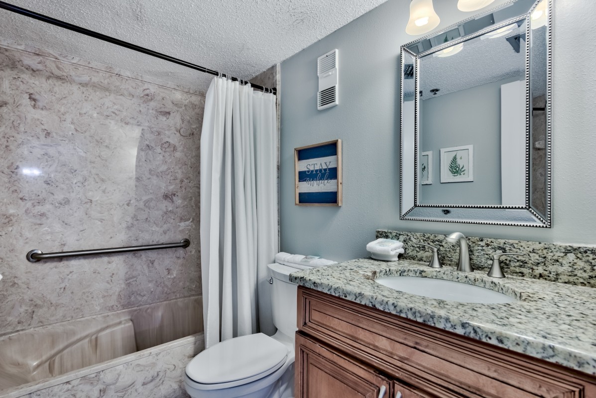 Living Room, Dining Room, and Private Balcony: The living room provides cozy seating with a queen pull-out sofa and a large HD TV, perfect for family movie nights. The dining area Dining room table has upholstered chairs seating six with two leather bar stools at island. Step onto the private balcony to enjoy unforgettable views of Destin’s sunset skies and nearby Lake Christina, along with the wildlife and tranquil surroundings. View the Destin and Fort Walton fireworks from the balcony!