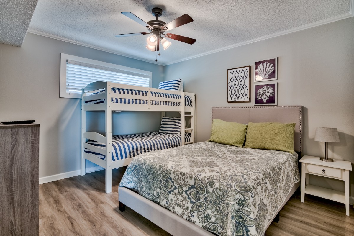 Bedrooms: Master Bedroom: The master bedroom offers a King-sized bed with a coastal theme, a private bathroom featuring granite countertops, and a walk-in shower. Guest Bedroom: Thoughtfully & Uniquely designed with a full-size bed and a bunk bed.