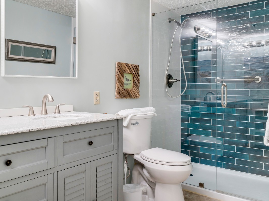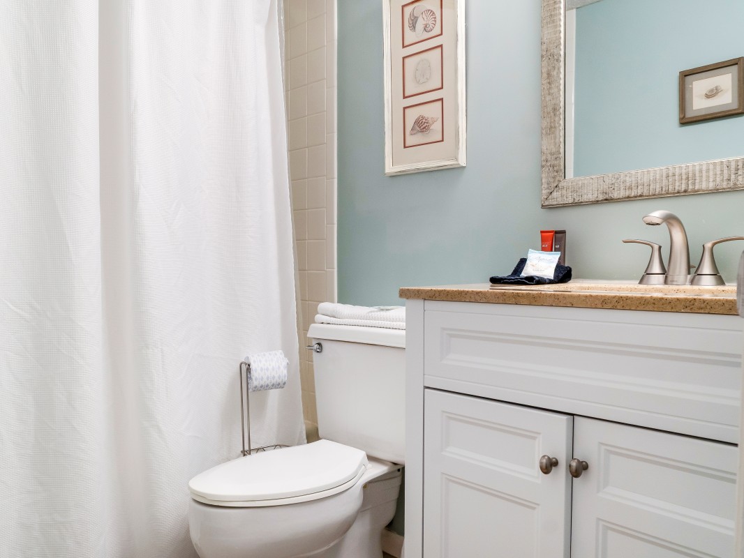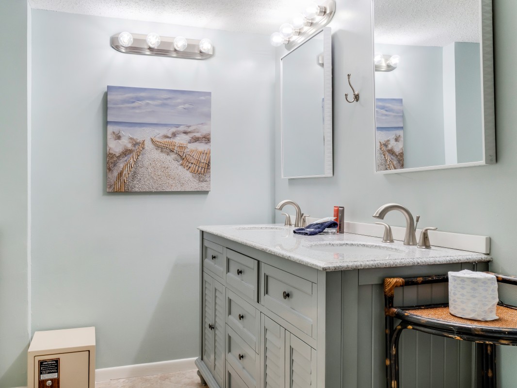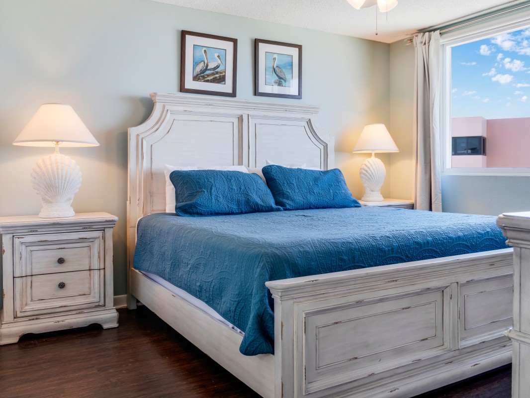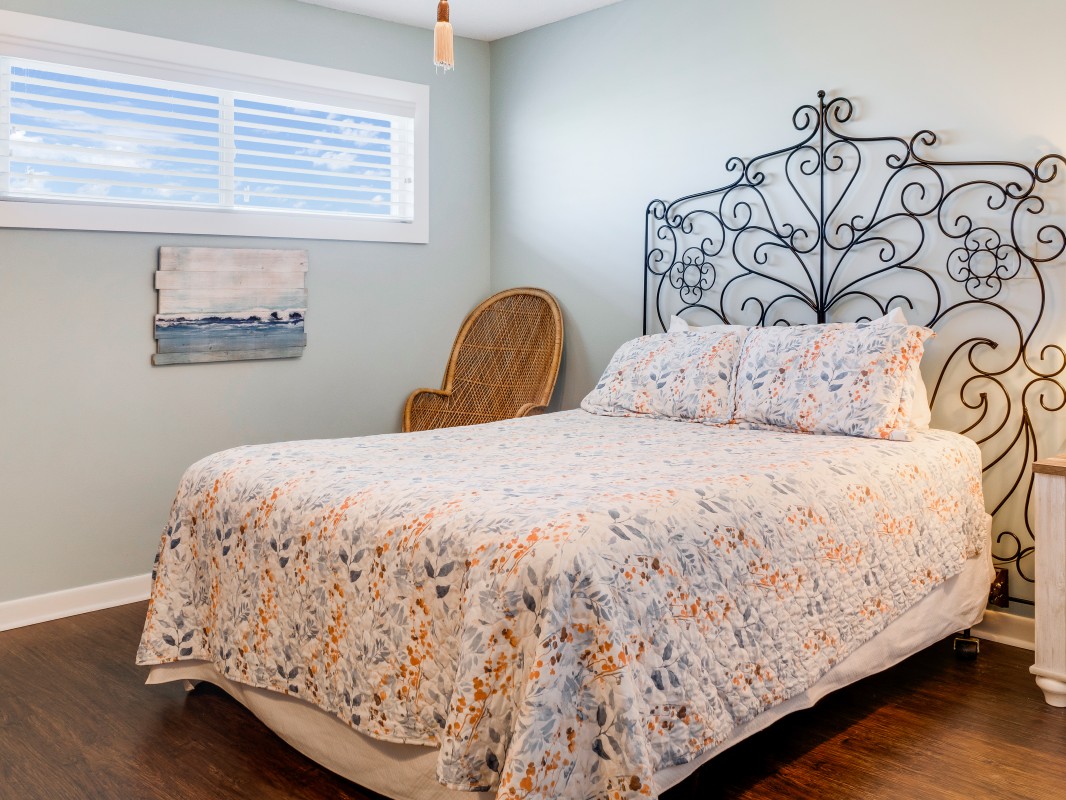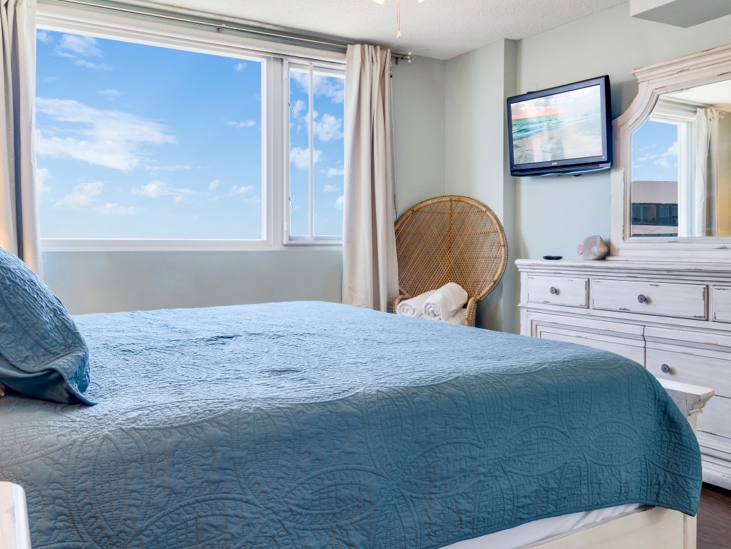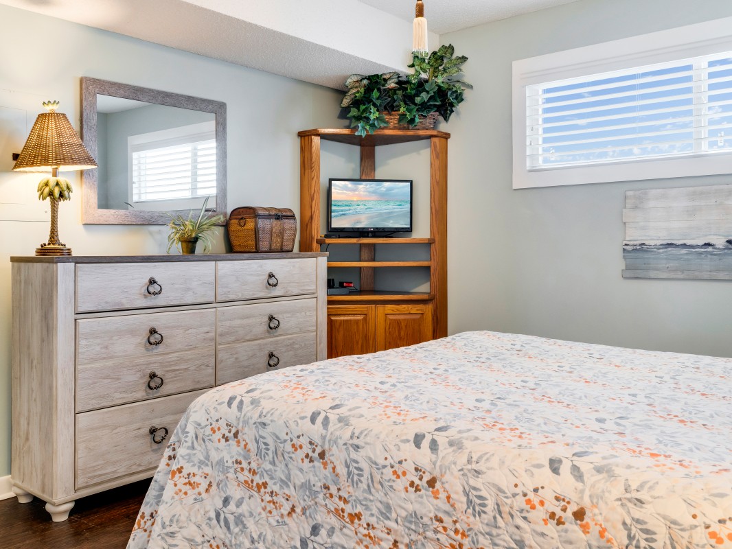 Bedrooms The master bedroom offers a serene retreat with a new King bed, a 32” TV, and an ensuite private bath for your convenience. It’s the perfect space to relax after a day at the beach. The guest bedroom is cozy and comfortable, with a Queen bed and a 24” TV. This room is ideal for relaxing, and the soft decor creates a peaceful atmosphere for a restful night’s sleep.