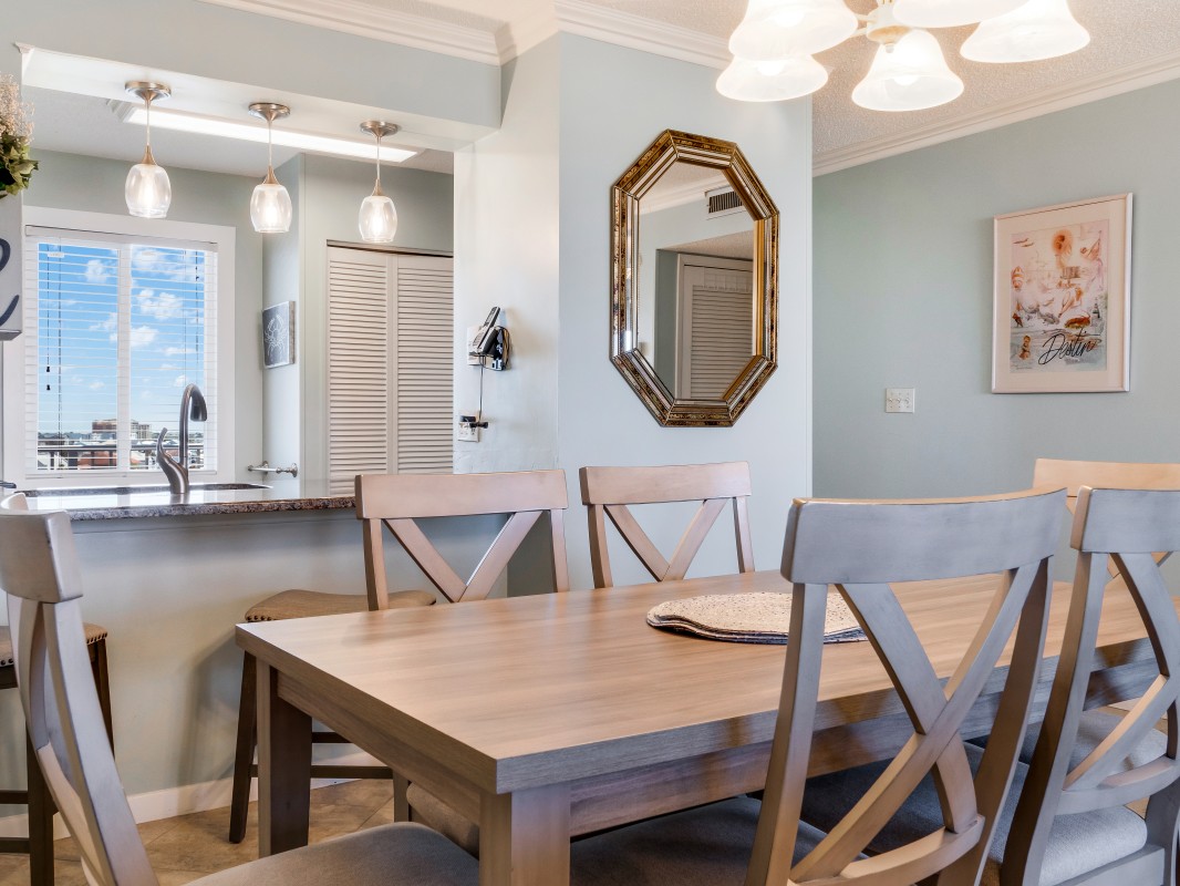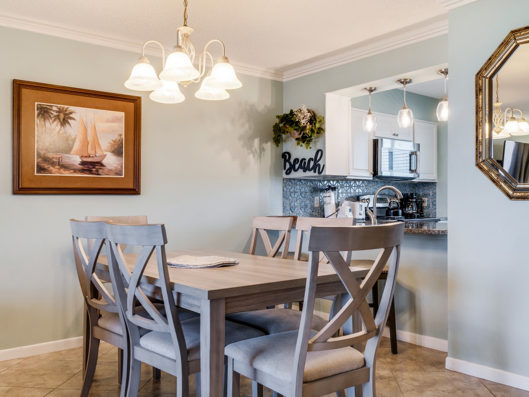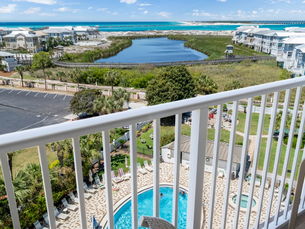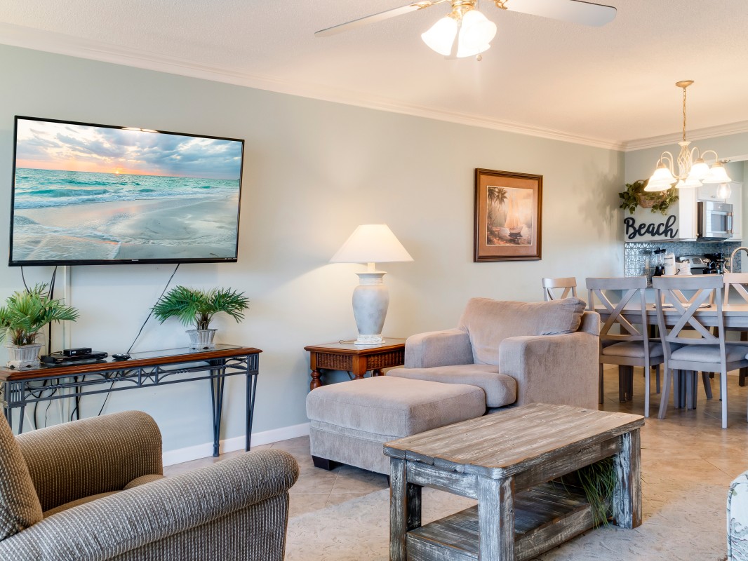 Living Room, Dining Room, and Private Balcony The inviting living room boasts a new sofa, loveseat, and recliner, plus a 55” flat-screen TV for entertainment. The open-concept space flows into the dining area with refreshed decor and newly recovered chairs. Step onto the private balcony to take in the stunning views of Lake Christina and all the beautiful wildlife that calls this area home. What a perfect way to watch Destin’s famous sunsets.