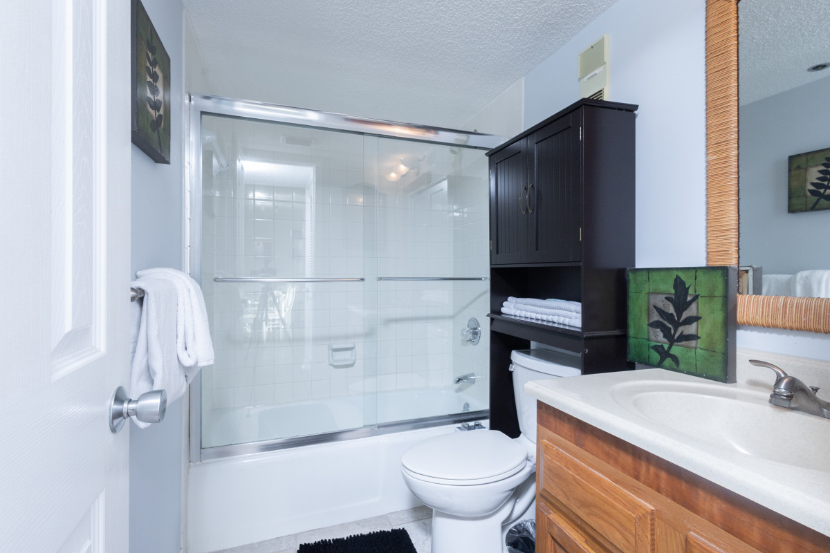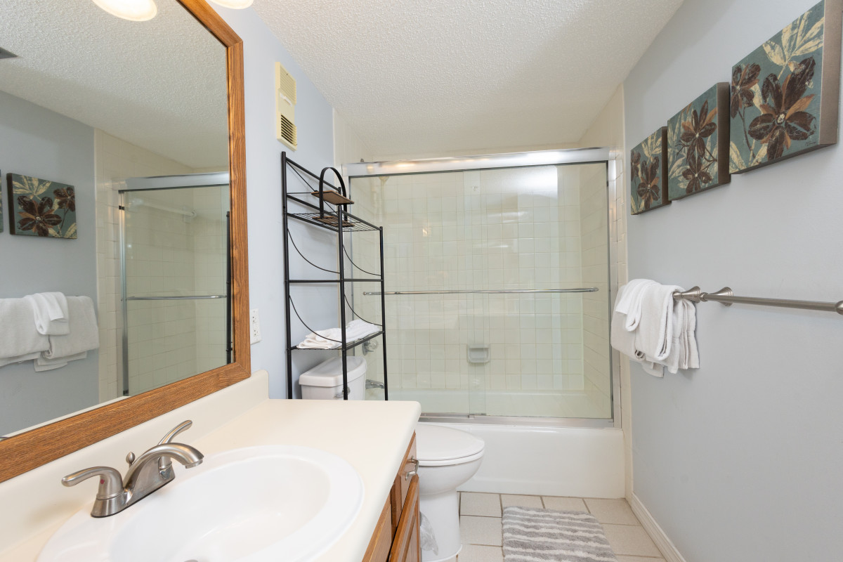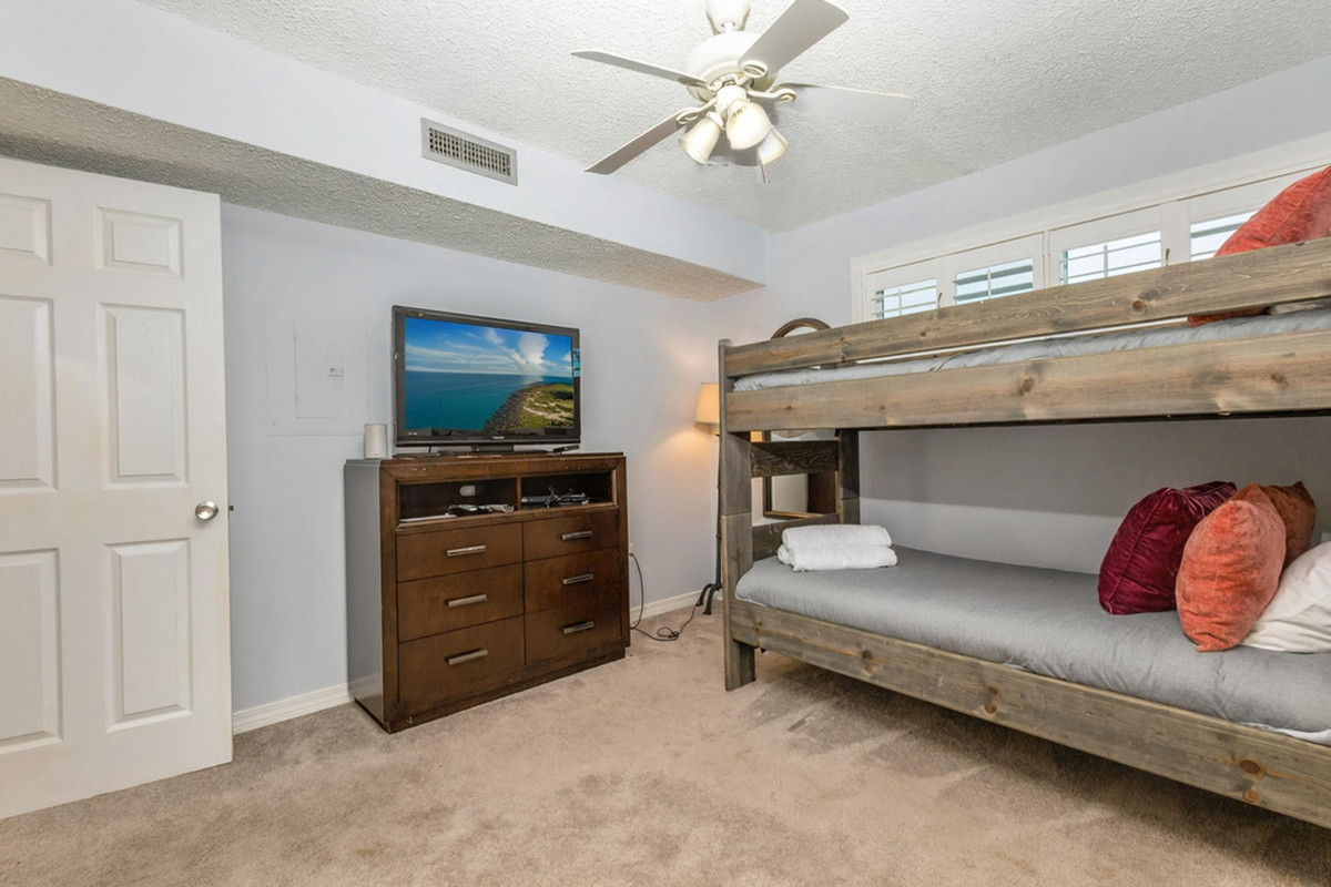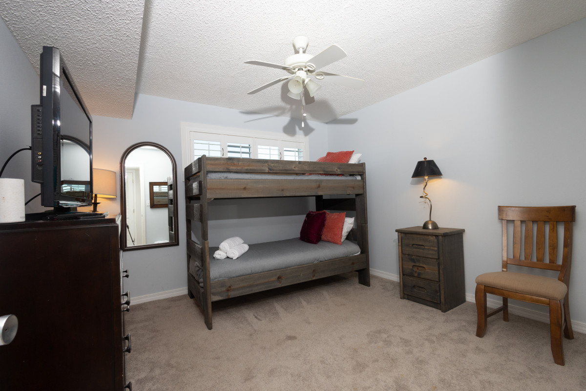 The master bedroom features a plush king-size bed, a 32-inch TV, and an expansive private bathroom—your own relaxing retreat after a day in the sun. The guest room is perfect for kids, offering twin bunk beds, a 32-inch TV, and plenty of floor space to play or unwind.