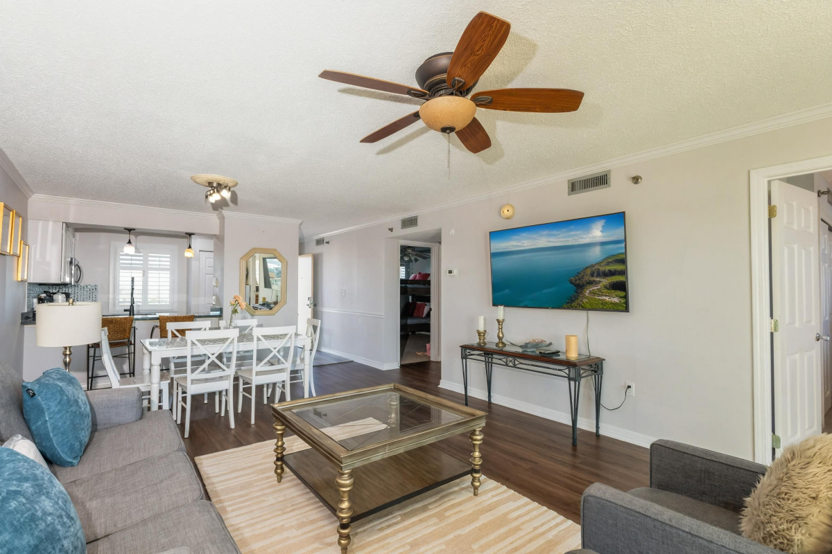 The open living area includes a two-person sleeper sofa and a 55-inch smart HDTV, making it ideal for movie nights or relaxing together. Step directly onto the private balcony to enjoy sweeping views of the Destin jetties, spectacular sunsets, and seasonal evening fireworks. And best of all, some of Destin’s most beautiful white-sand beaches are just steps from your door.